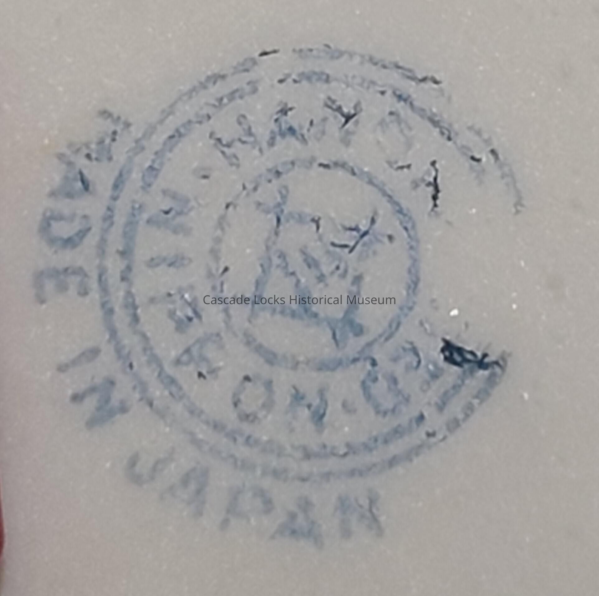 Orange glazed Japanese tea set with blue trees white flowers and teal accents. Items include one plate, two shakers (salt/pepper), one small spoon and one small open container possibly for sugar or cream. Bottom says, "Hand Painted Nippon, Made in Japan."Inscription/Signature/Marks