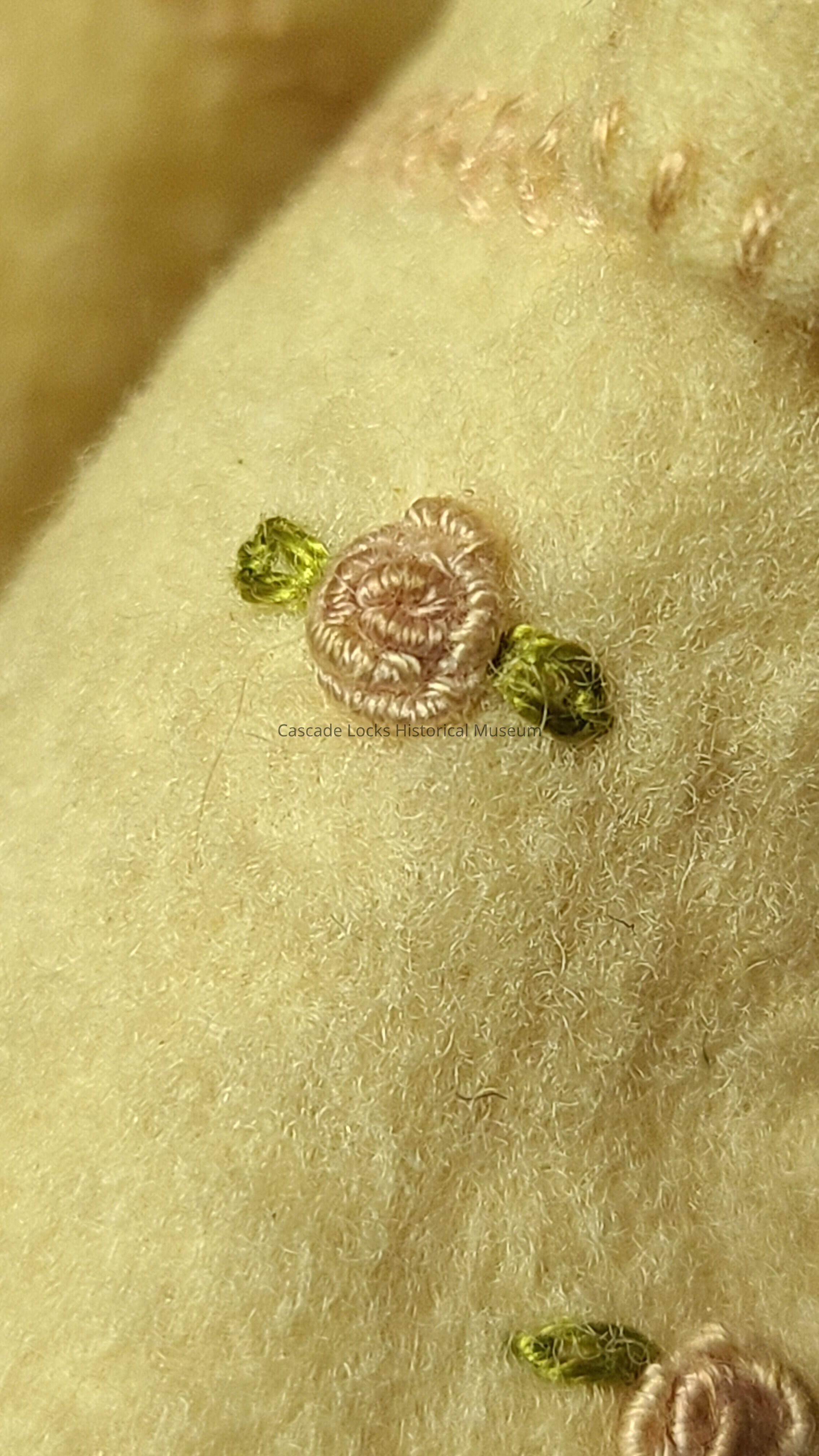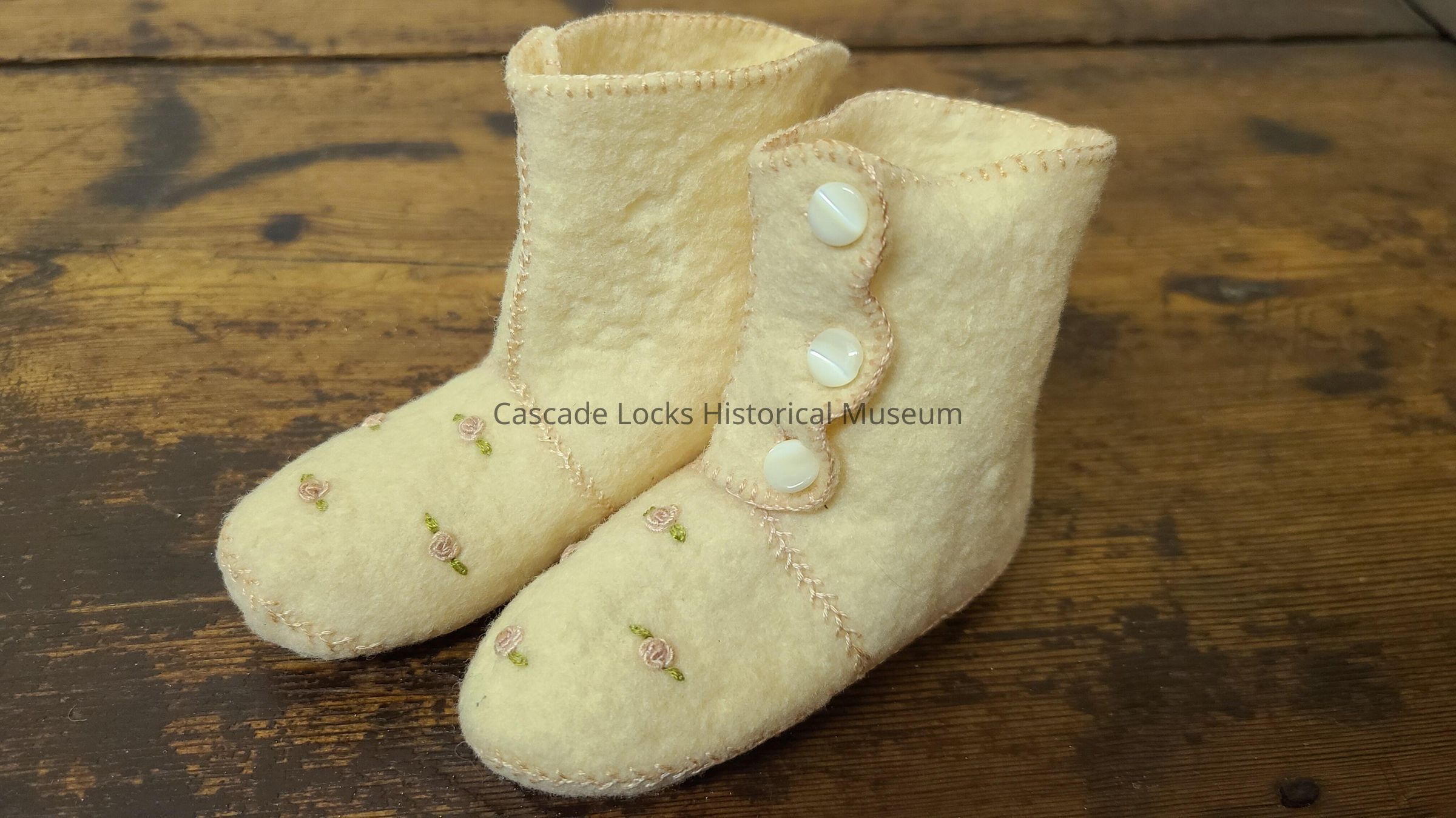Off-white baby shoes made of wool with white cat eye bottoms, embroidered pink flowers with green leaves, and pink stitching.
