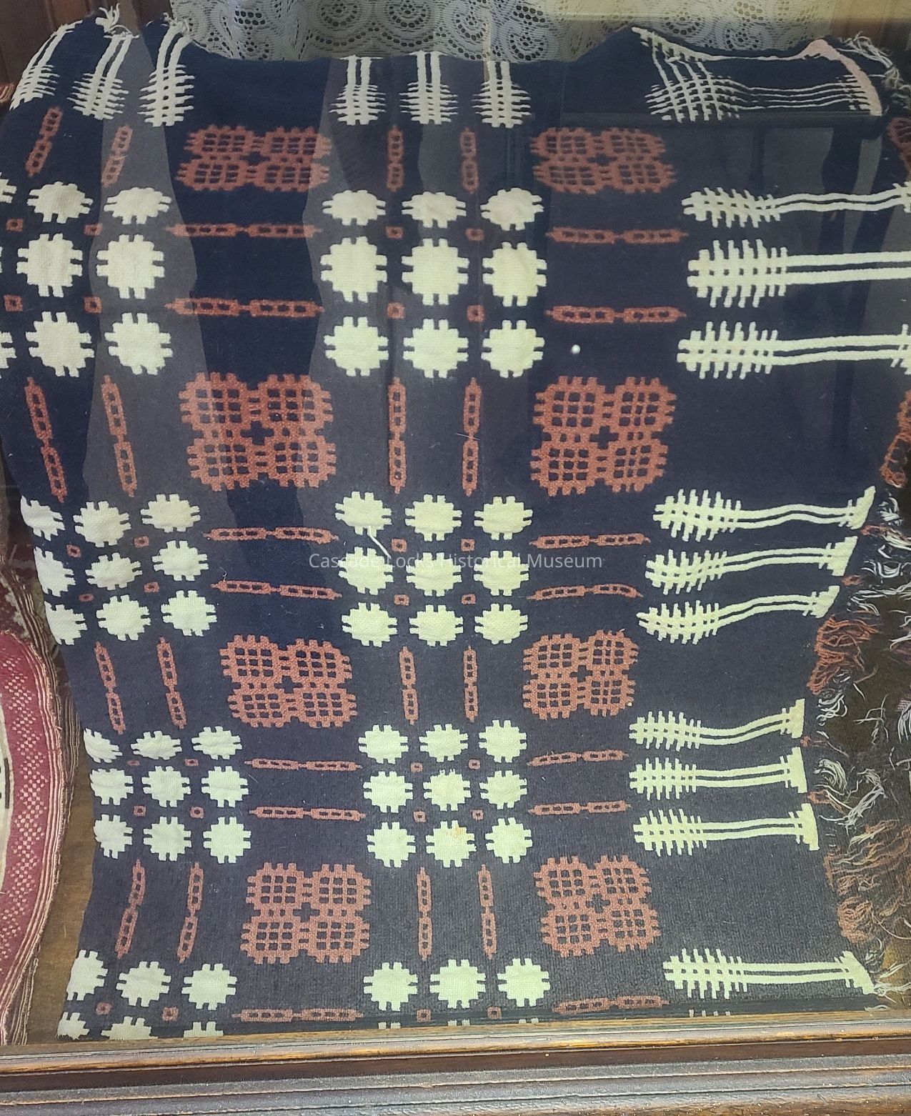 Jacquard blanket woven with threads of blue, red, and white with fringe edges.Lexicon