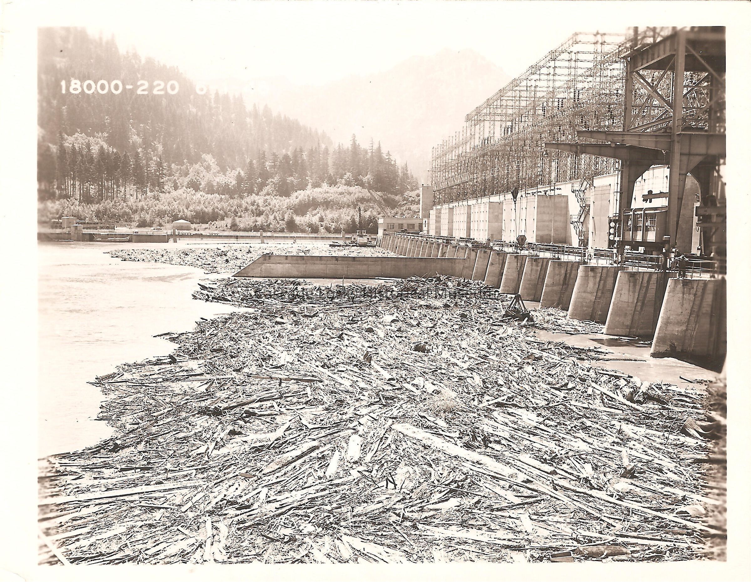 Image from Bonneville dam of the ramification of the flooding of the Columbia River year 1948. In the image logs and debris are pushed up behind Bonneville dam blocking the spillway gates at the powerhouse. There are workers above the powerhouse working with crane operators to remove debris using cranes and claws. In the background is a crane on a barge helping to remove the debris. Top left of image reads; "18000-220 6-1-48"