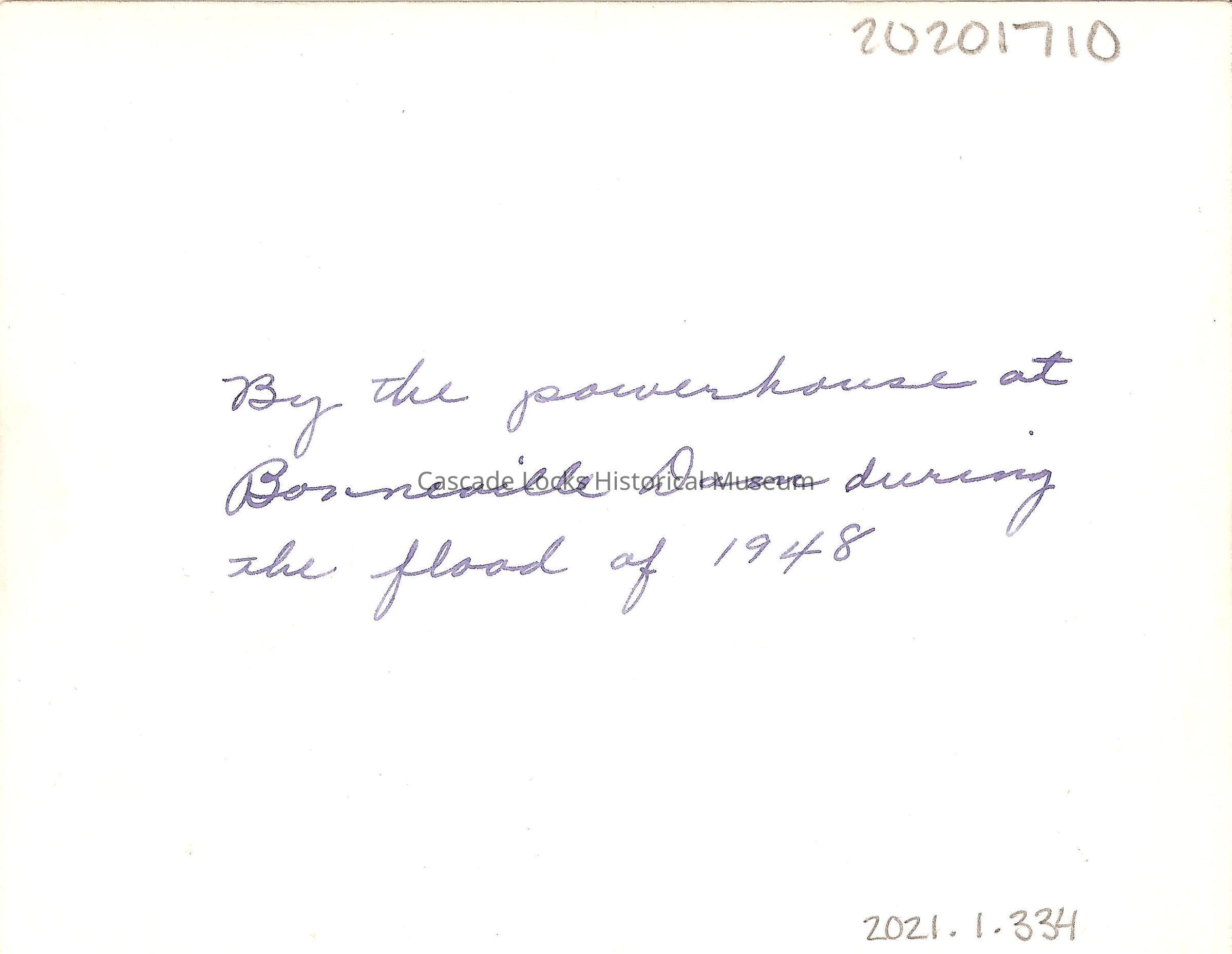 Back of image- By the powerhouse at Bonneville Dam during the flood of 1948