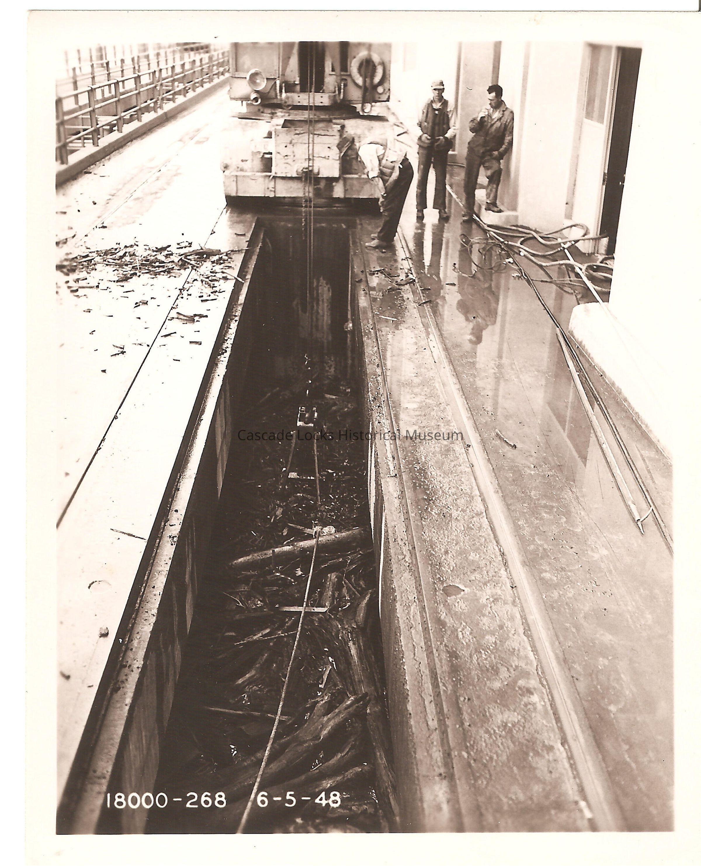 Image of a crane removing debris from a crevasse inside the structure of Bonneville Dam after the flood of 1948. There are three individuals inspecting the debris and overring operations. Bottom left of image reads; "18000-268 6-5-1948"