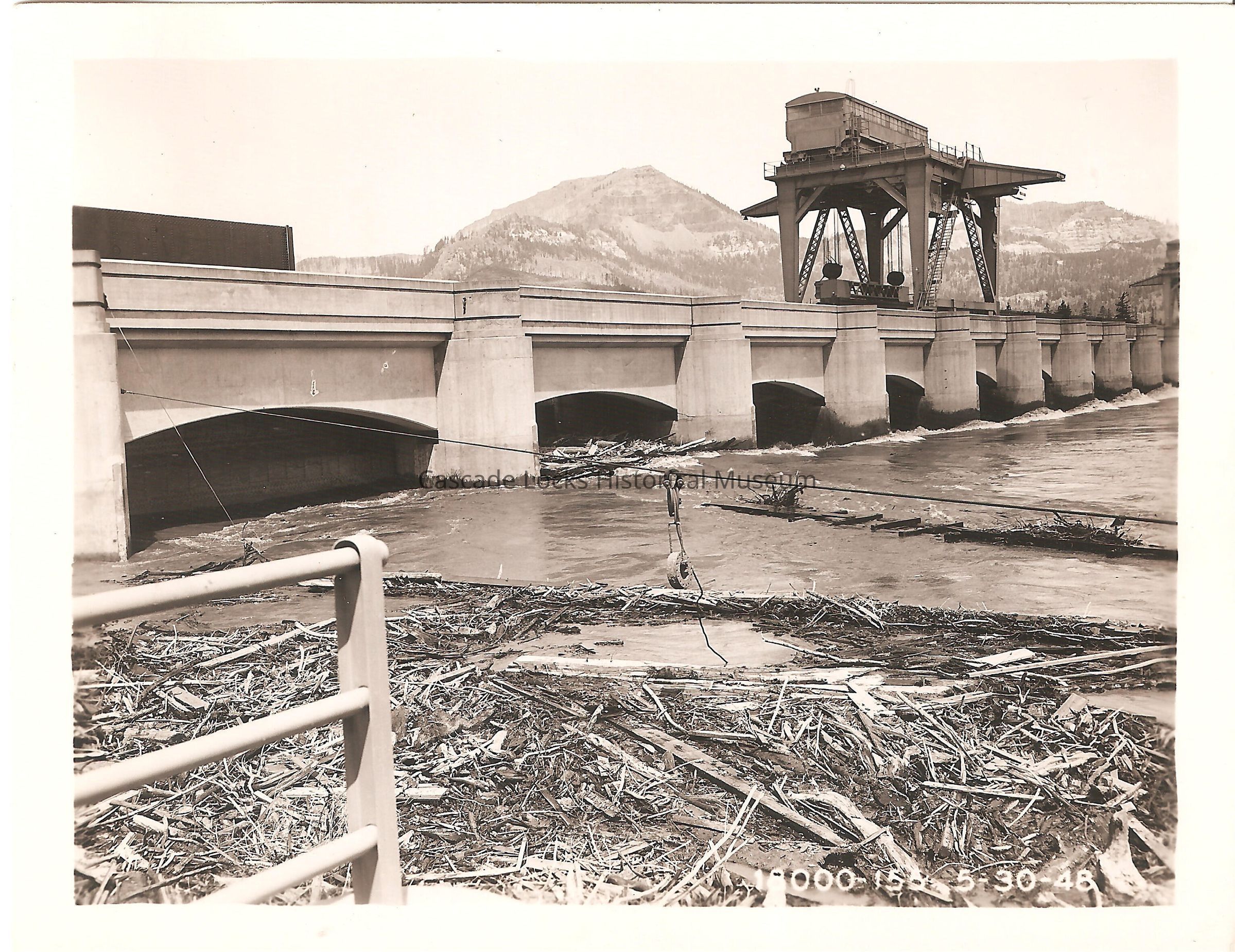 Image from Bonneville dam of the ramifications of the flooding of the Columbia River year 1948. In the image logs and debris are pushed up behind Bonneville dam blocking the spillway gates. Bottom right of image reads; "18000-155 5-30-48"