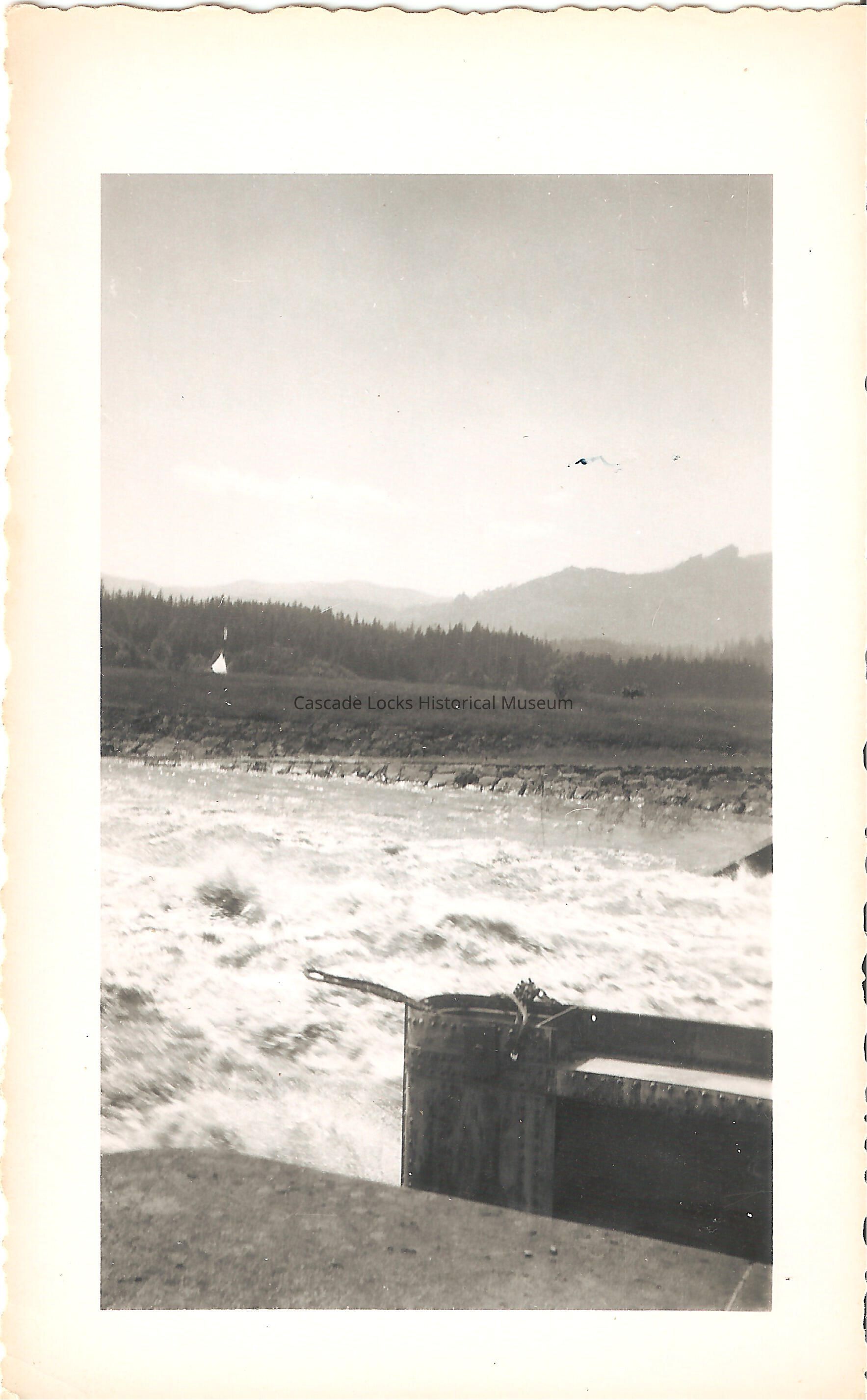 Image of Thunder Island, and Cascade Lock and Canal during the Vanport Flood of 1948. Rising flood waters are nearing the top of the canal bank. There is a cone shaped white structure on the Island that could possibly be a Native American structure.