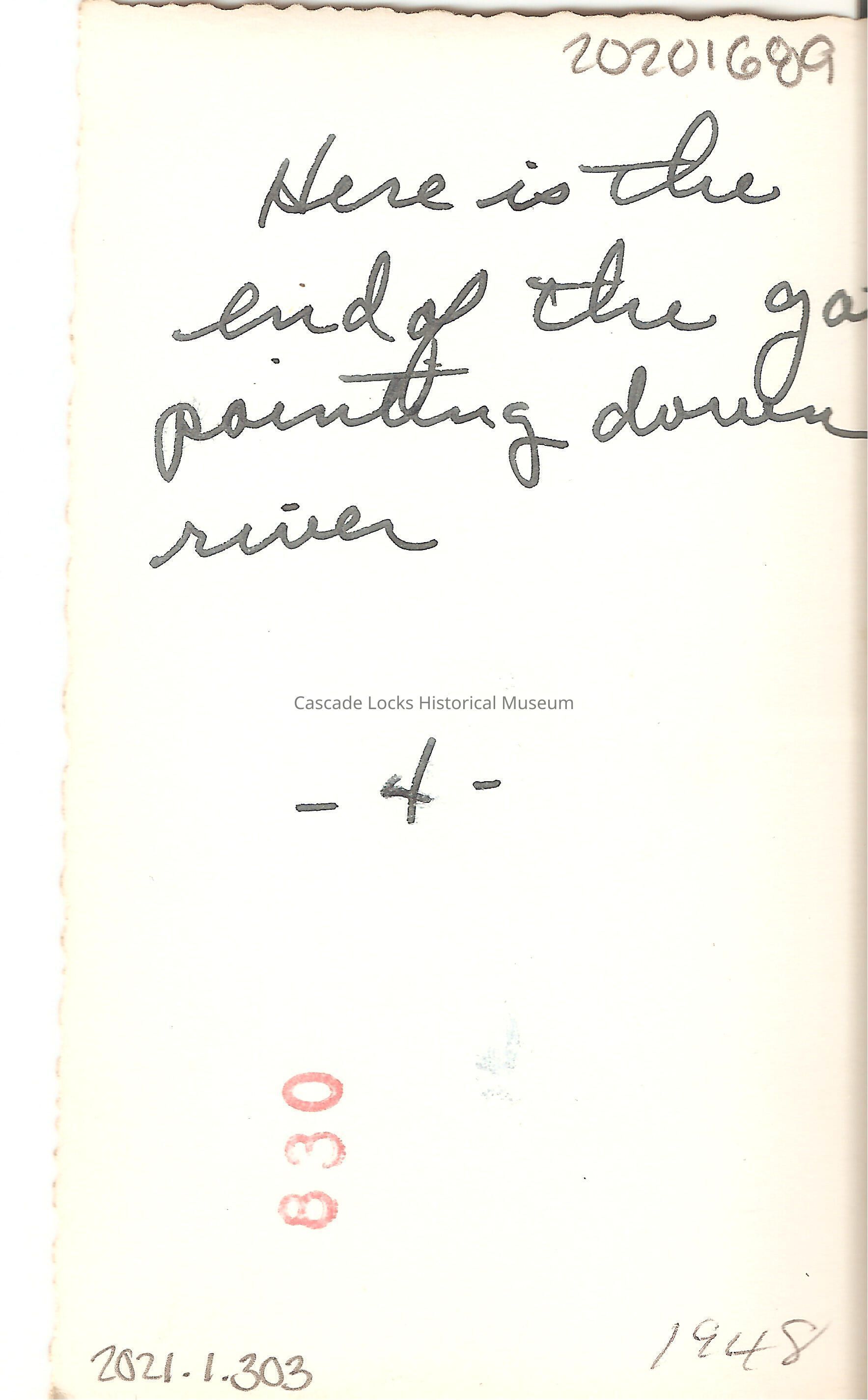 Back of image reads; "Here is the end of the gate pointing down river. -4-, 830, 1948"Inscription/Signature/Marks