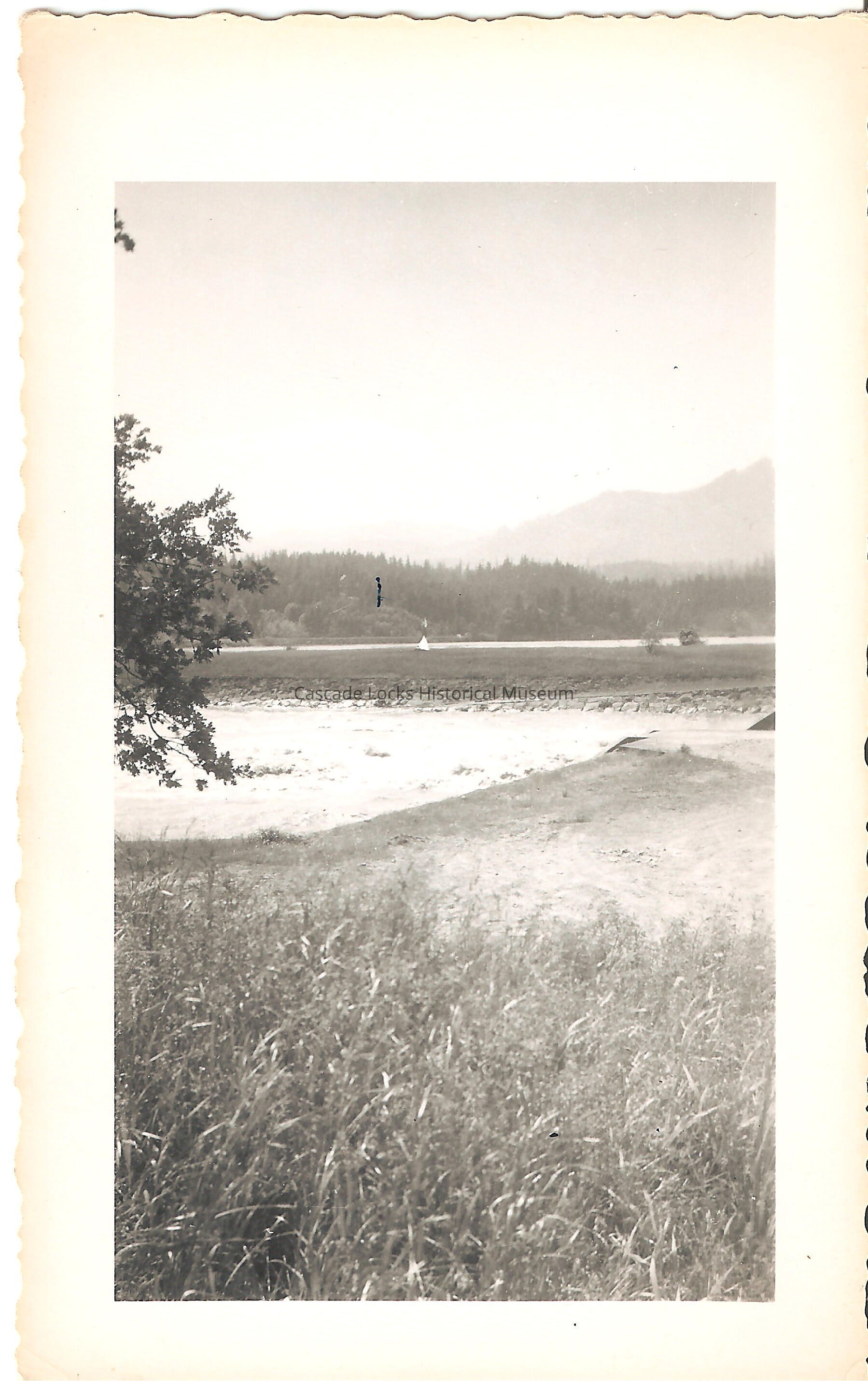 Image of Thunder Island, and Cascade Lock and Canal during the Vanport Flood of 1948. Rising flood waters are nearing the top of the canal bank. There is a cone shaped white structure on the Island that could possibly be a Native American structure.