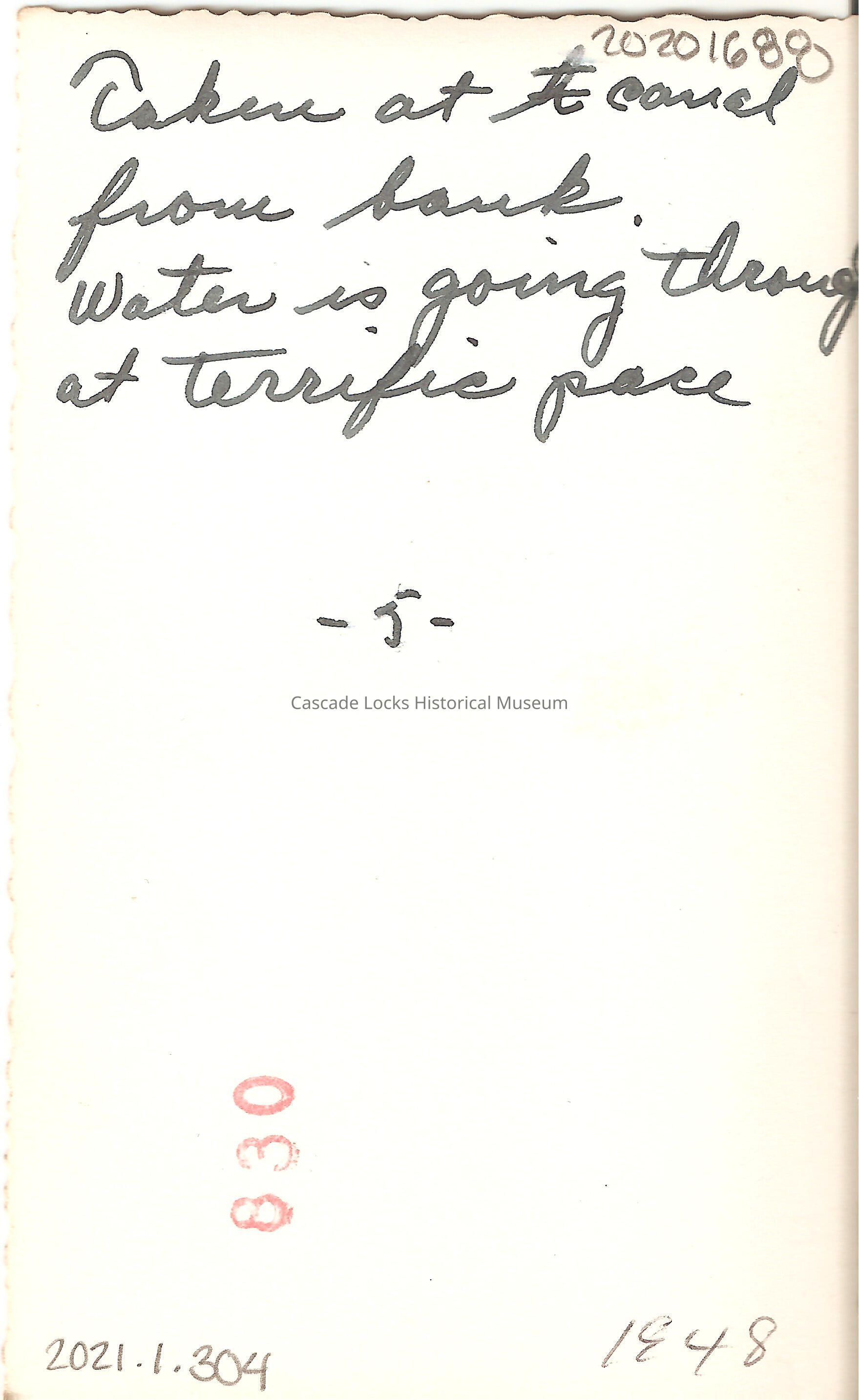 Back of image reads; "Taken at the canal from bank. Water is going through at terrific pace. -5-, 830, 1948"Inscription/Signature/Marks
