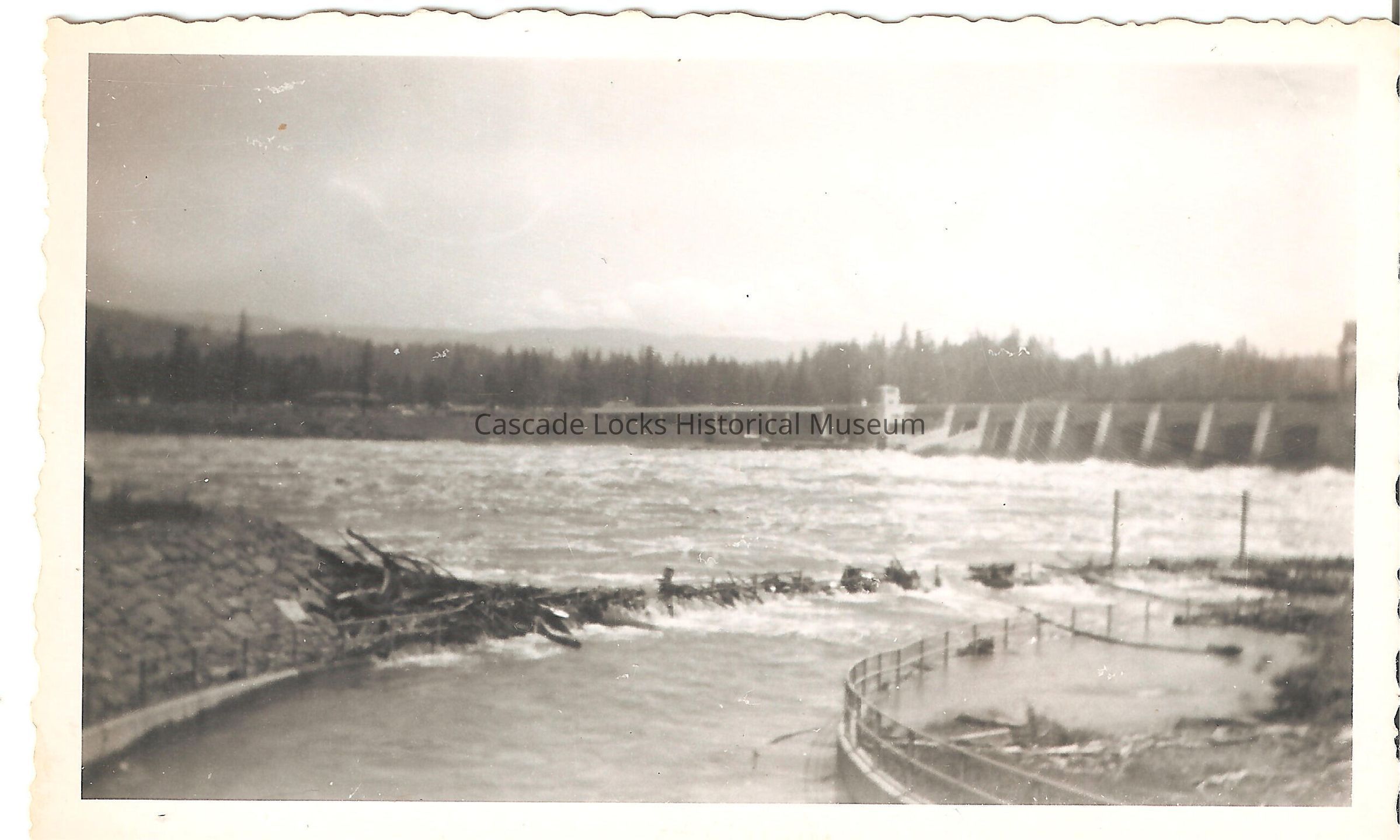 Image of the spillways and fish ladder at Bonneville Dam during the Flood of 1948. In the image the fence around the fish ladder has piled up debris from the flood waters.