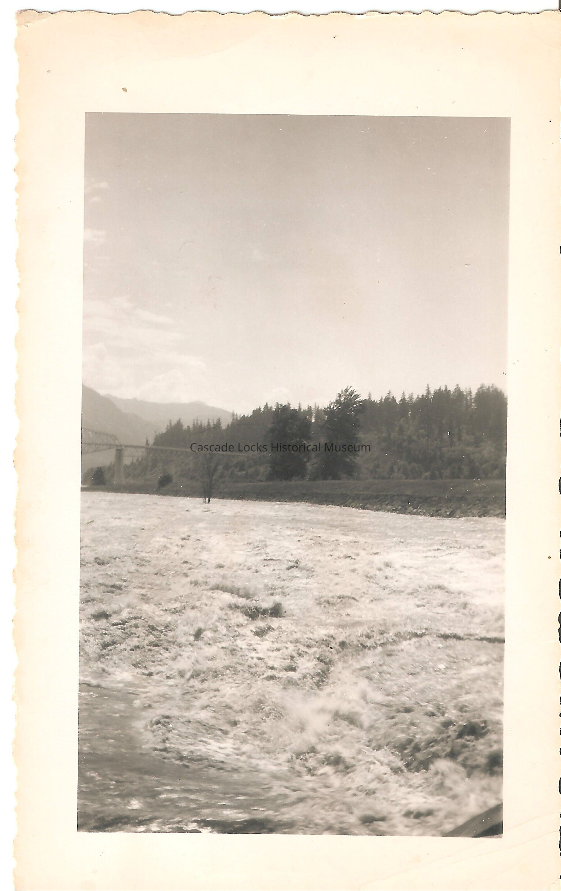 Image of the flowing flood waters passing Thunder Island and under the Bridge of the Gods.