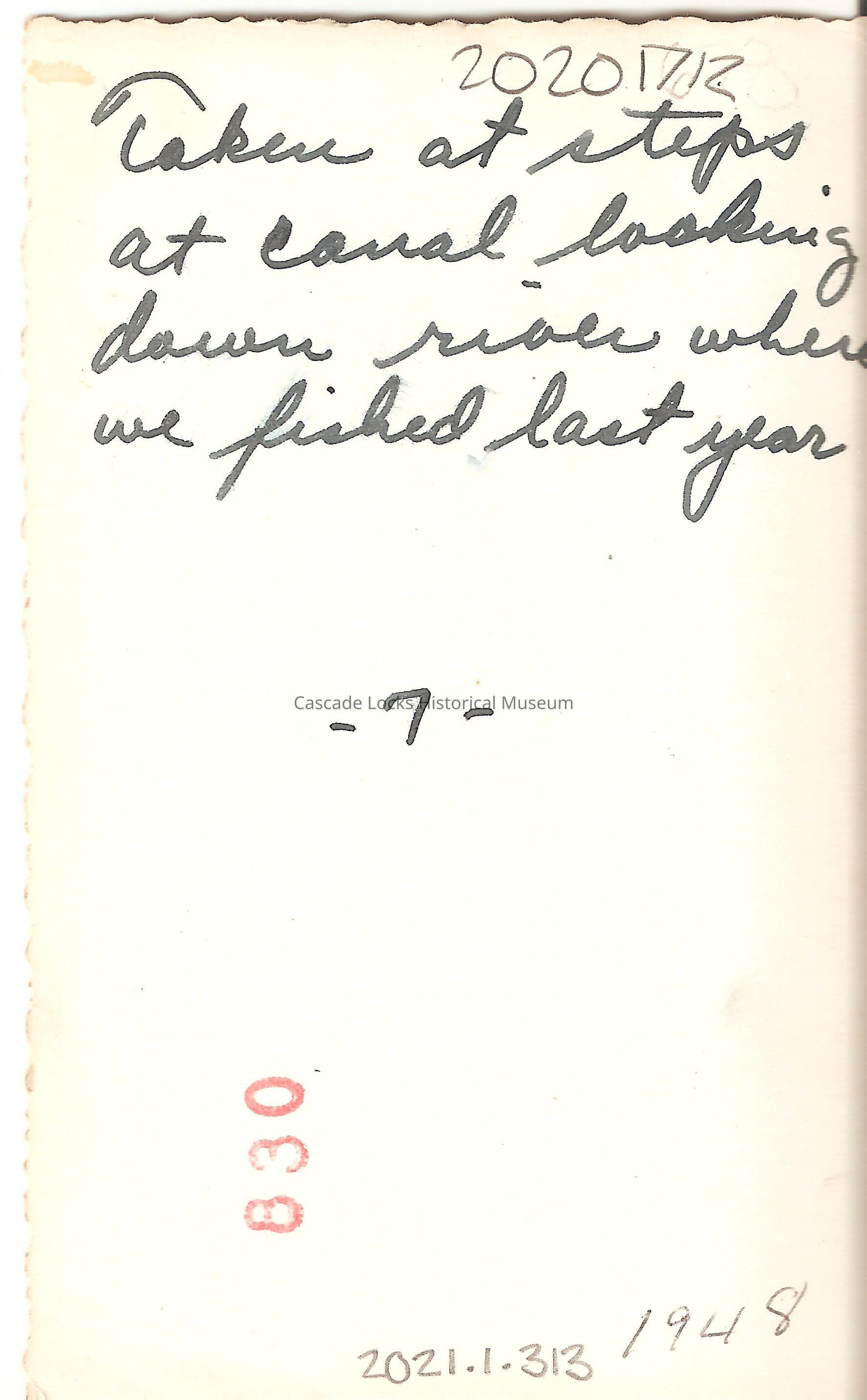 Back of image reads, "Taken at steps of canal looking down river when we fished last year -7- 830 1948"