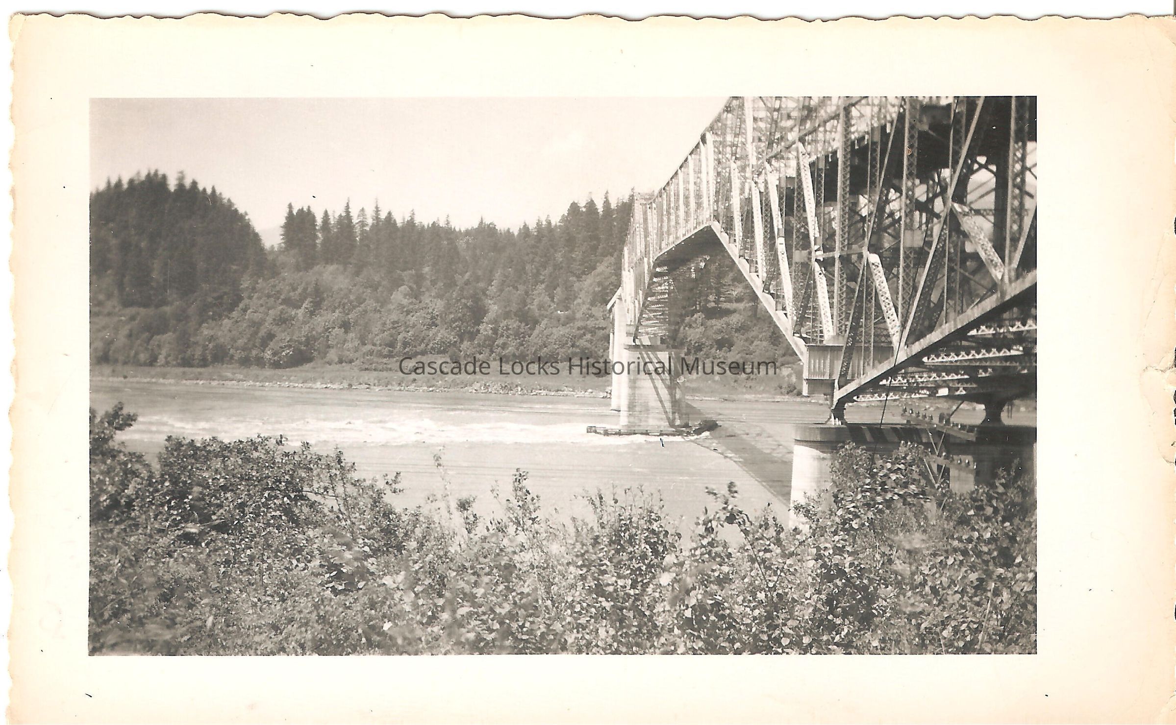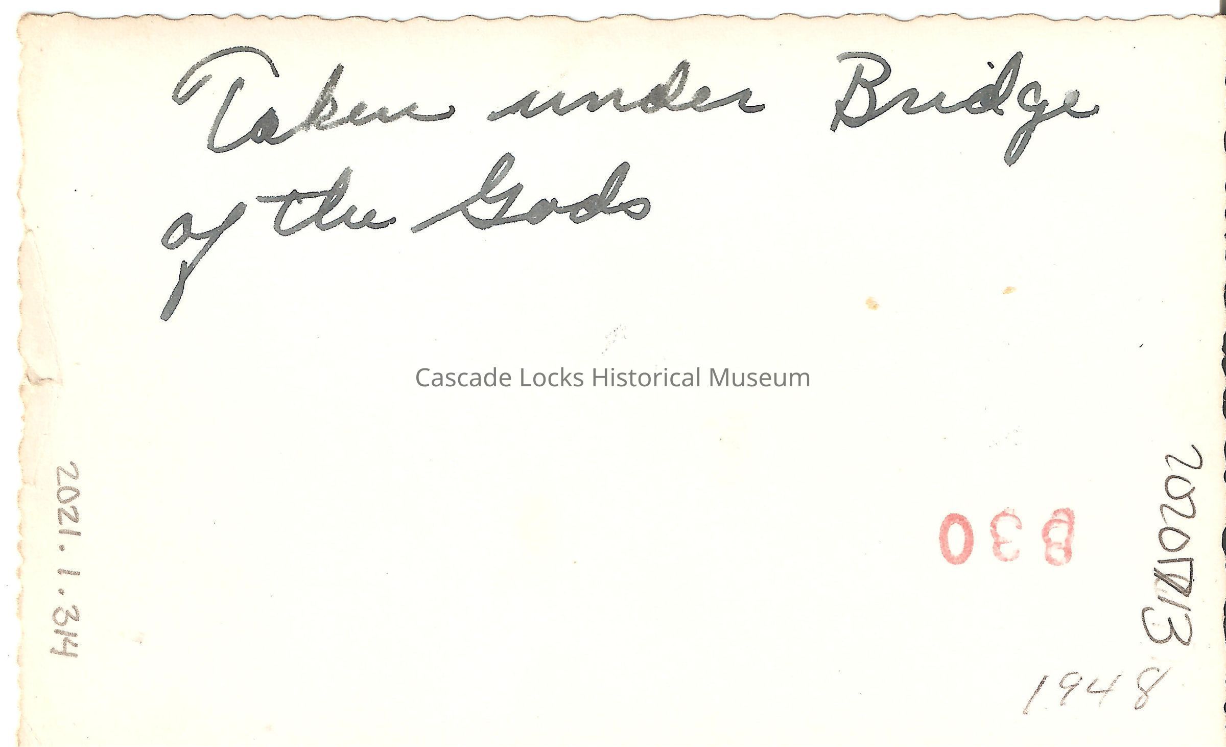 Back of image reads; "Taken under Bridge of the Gods, 830, 1948"