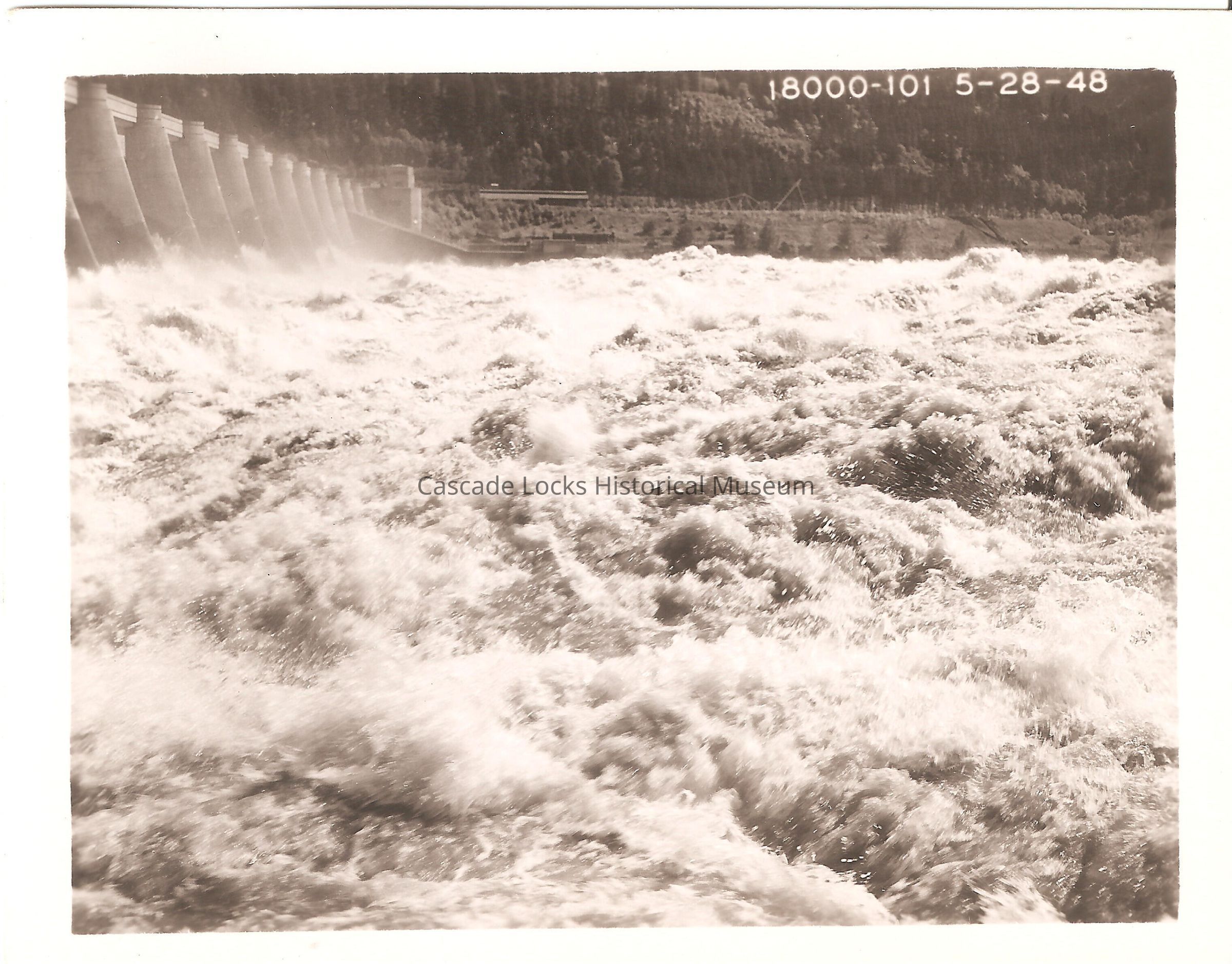 Image of water expelling from the spillway gates at Bonneville Dam during the flood of 1948. Top right corner of image reads; "18000-101 5-28-48"