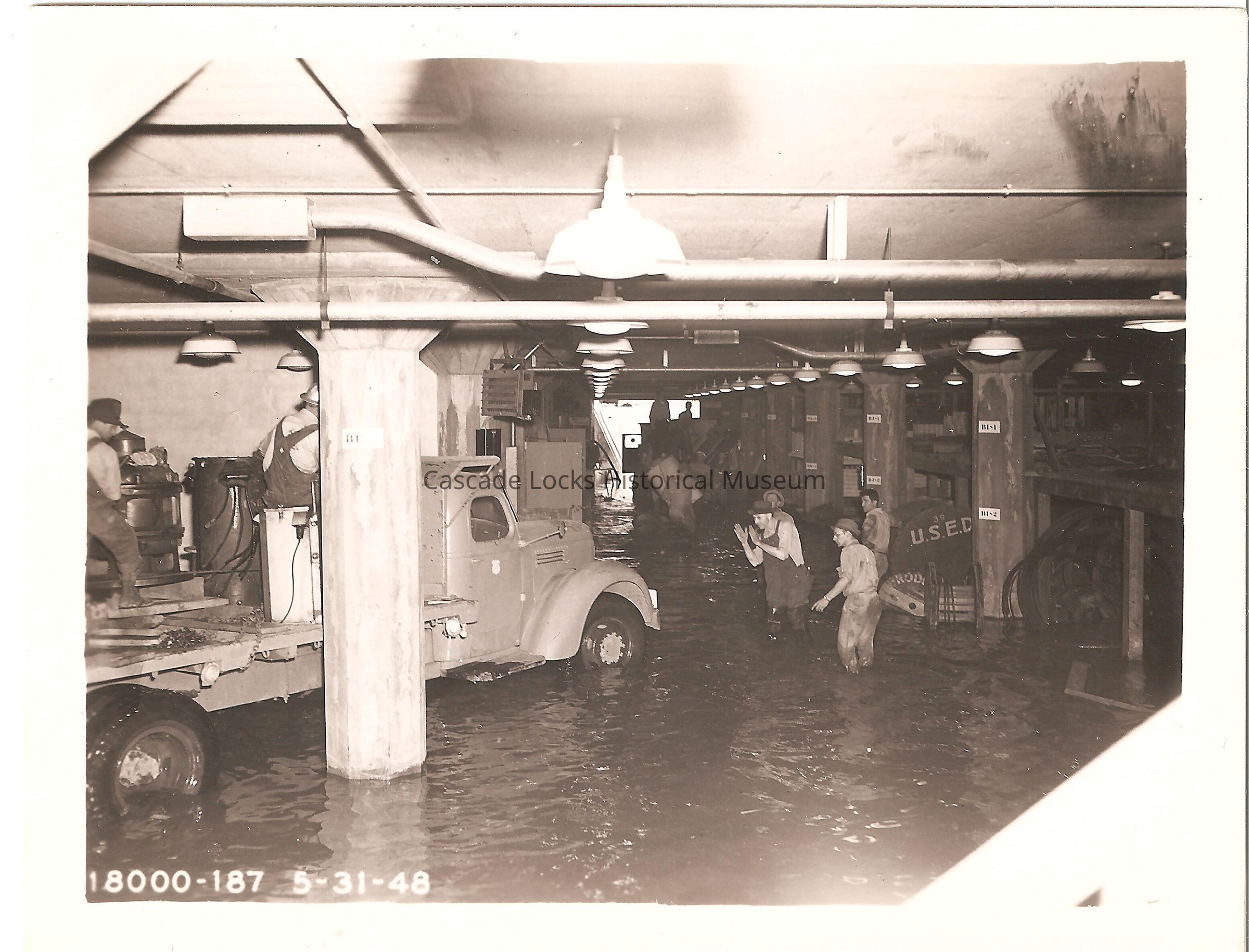 Image of the flooding inside of Bonneville Dam during the Flood of 1948. In the image workers are removing equipment from the inside of Bonneville Dam using a flat bed truck. Two workers are situated on the truck bed holding what appears to be a generator and another sensitive part of the dam while four workers guide the truck out of the dam. The truck appears to have a US forest service emblem from the size and shape. In the background another group roughly 6 workers load another truck with items from within the dam. The numbers on the pillars to the right reads; "BI-1, BI-2, (Next pillar) BJ-1, BJ-2" Item on the floor between the two pillars reads; "39 U.S.E.D." Bottom left of image reads; "18000-187 5-31-48"
