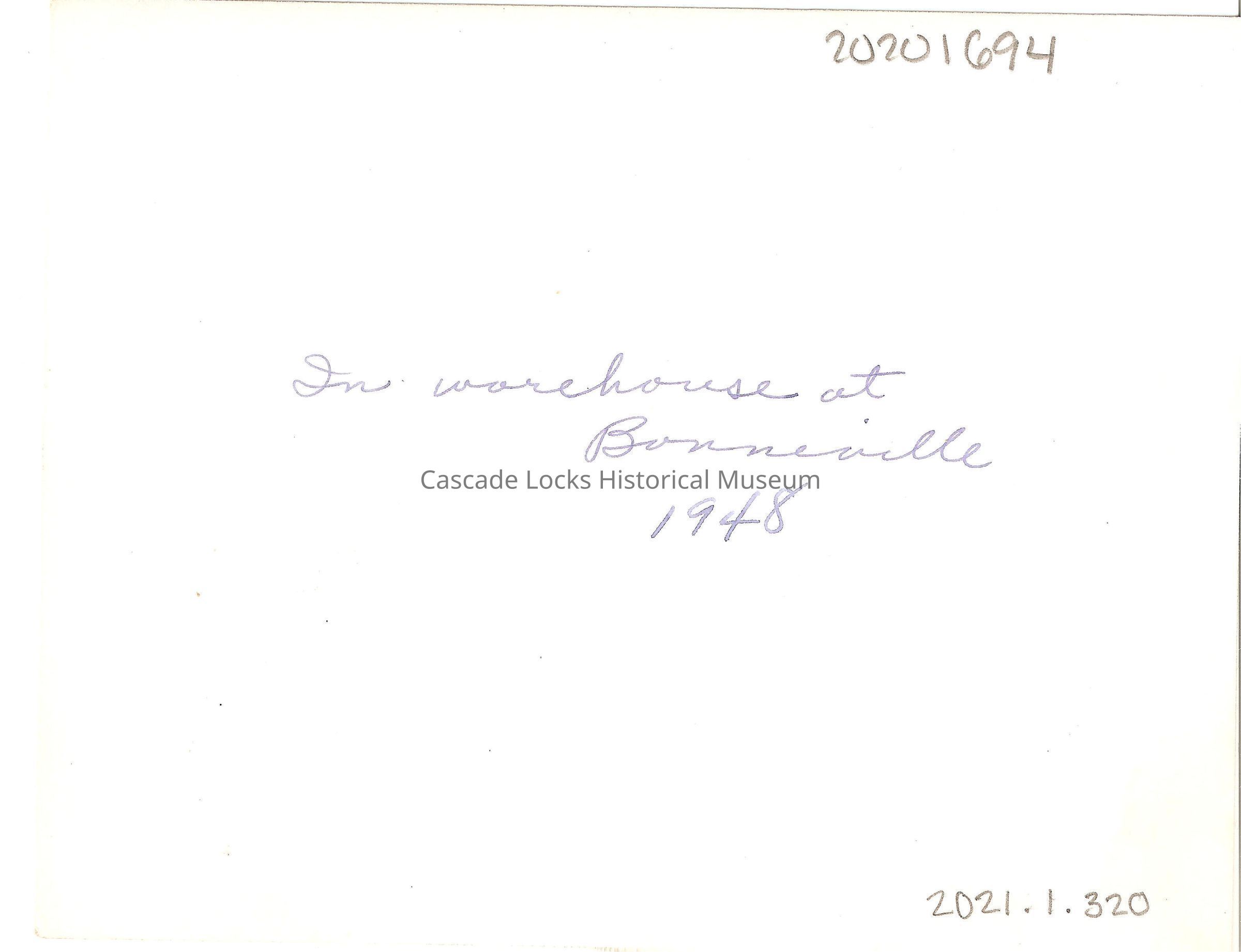 Back of image reads; "In Wearhouse at Bonneville 1948"Language