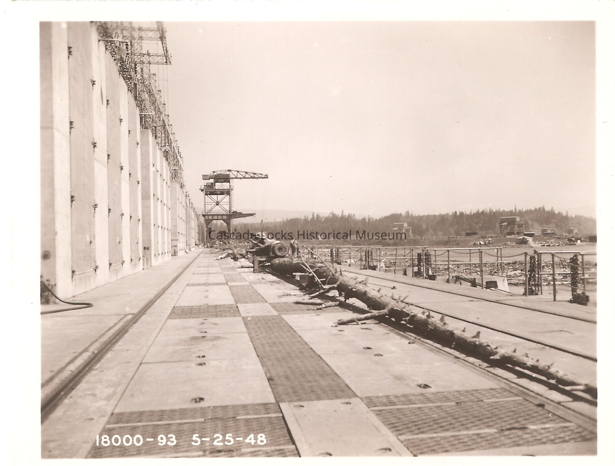 Image of the powerhouse at Bonneville Dam where whole trees have been extracted from the east side of the dam. The trees have then been placed on the deck of the powerhouse and are being sawed into pieces for removal. In the background is the top of the spillway. The bottom left of the image reads; "18000-93 5-25-48"