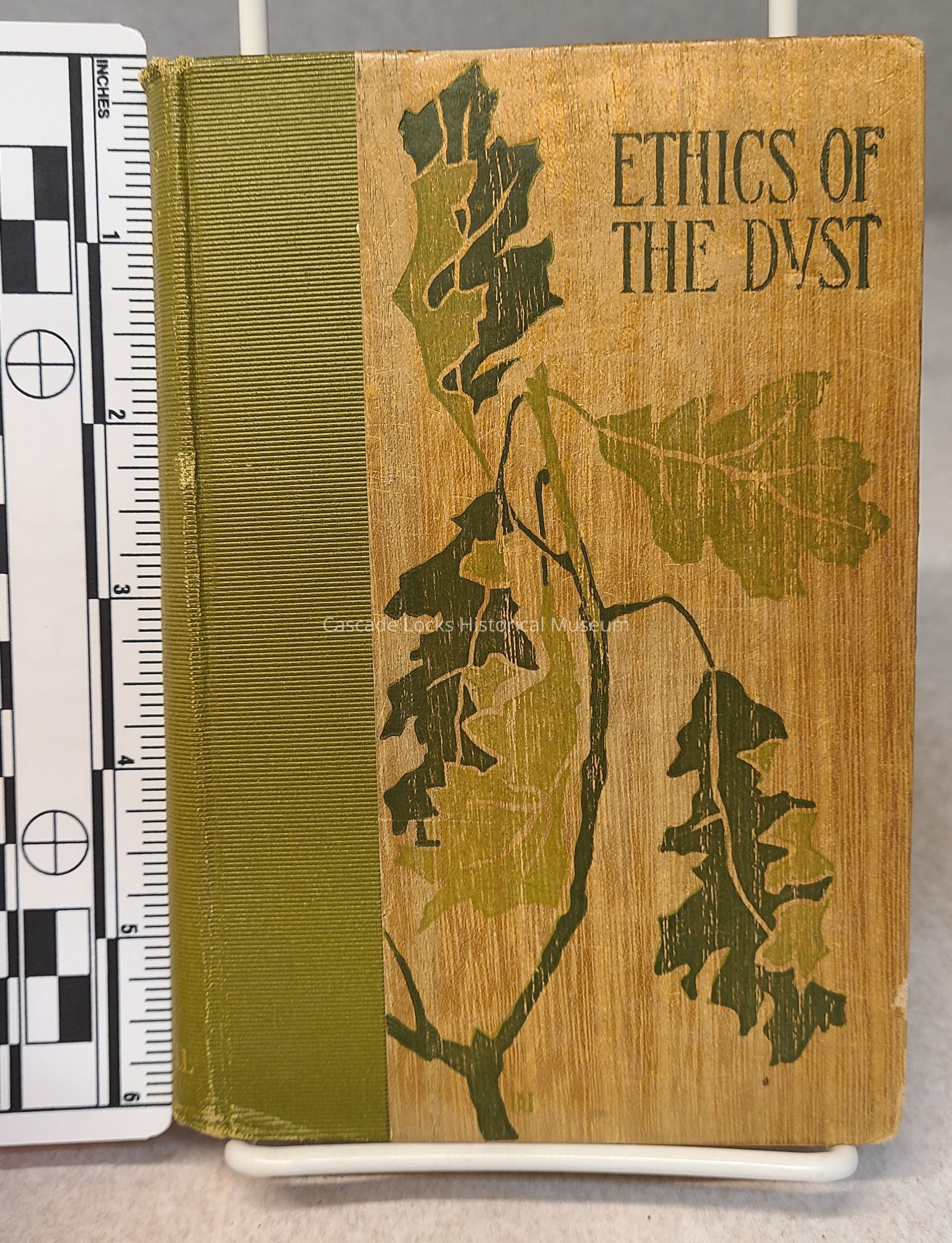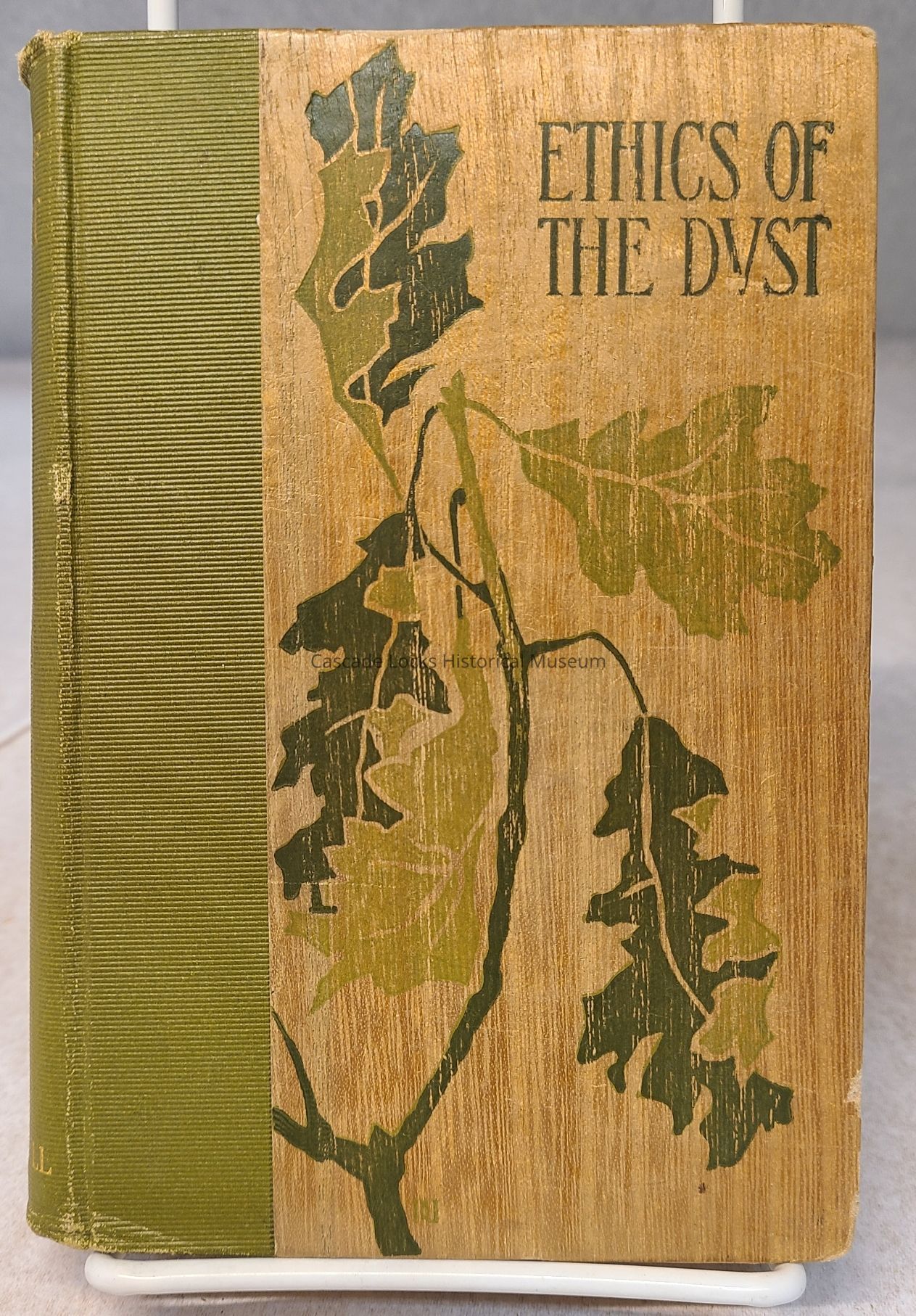 Book, green and tan with two toned cover and spine. Spine has gold font. Cover has dark dark green font and details that mirror the spines coloring.
