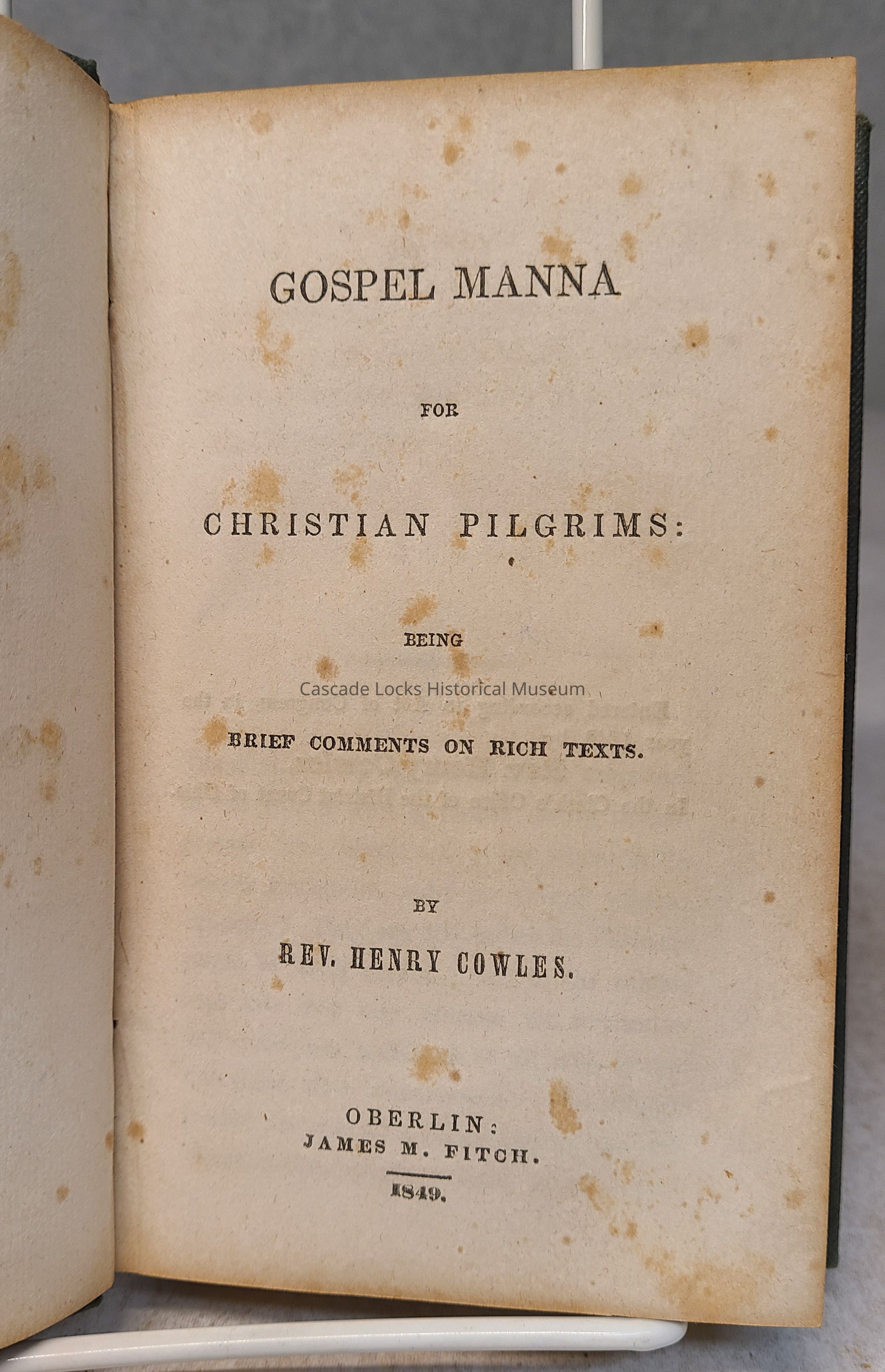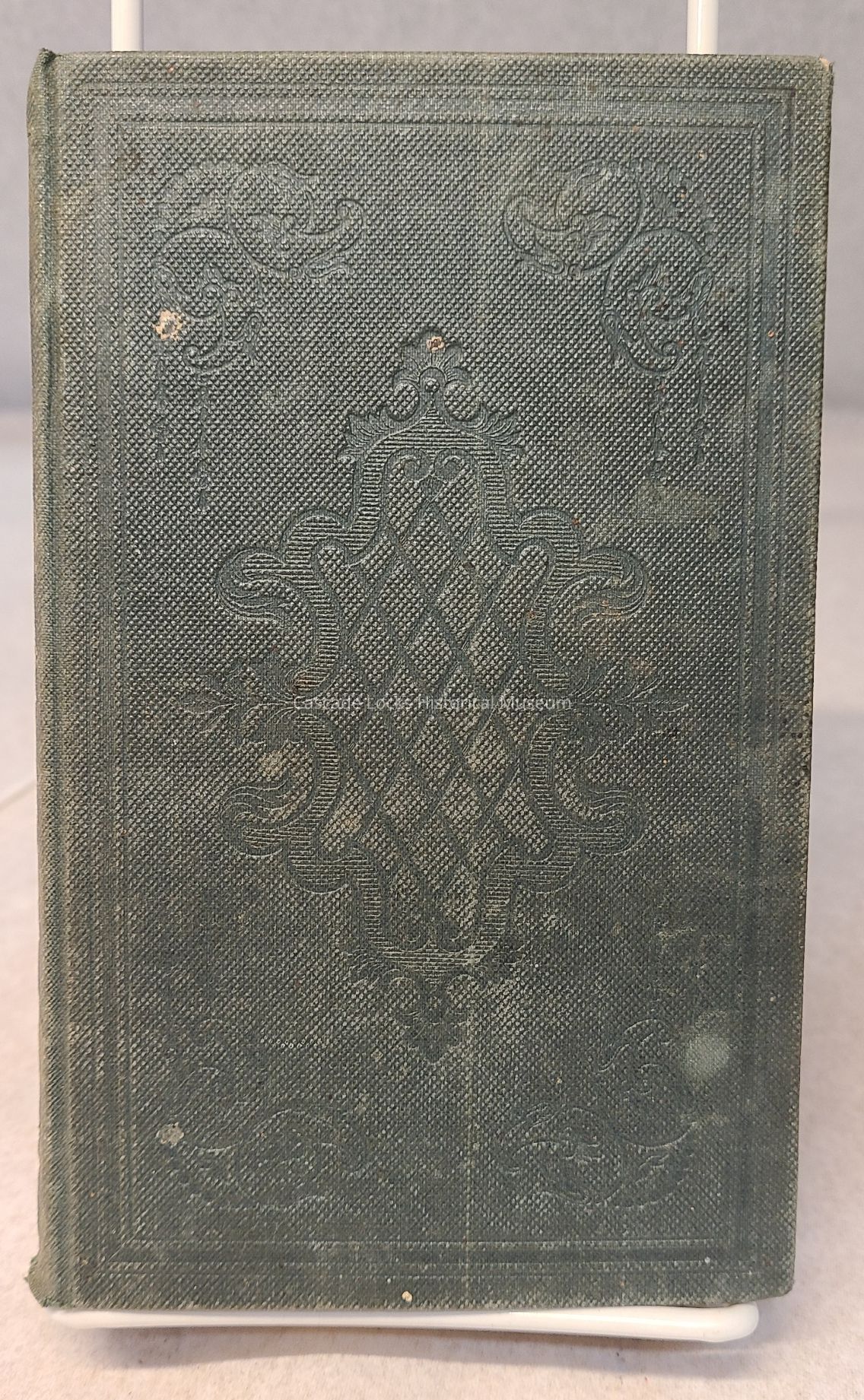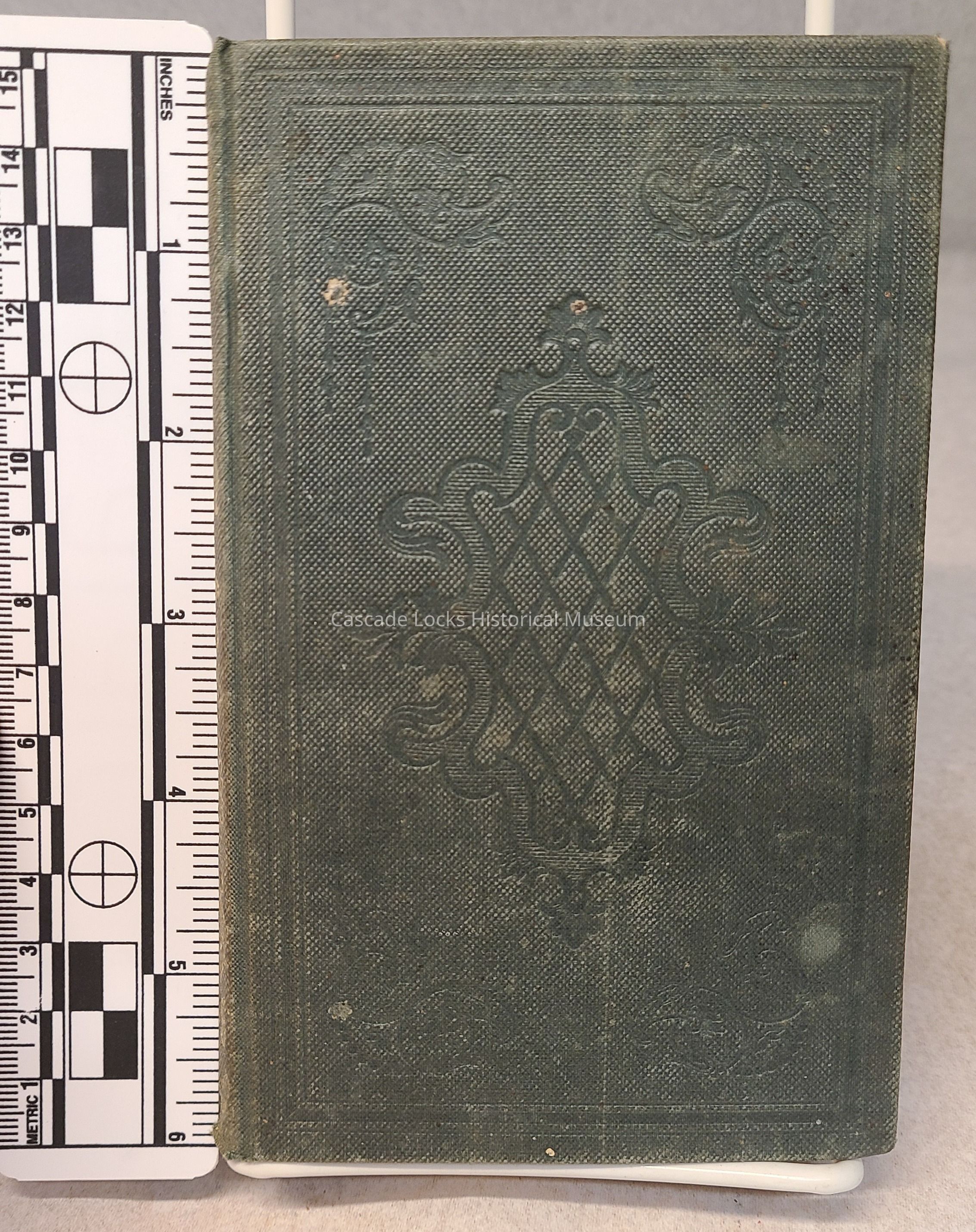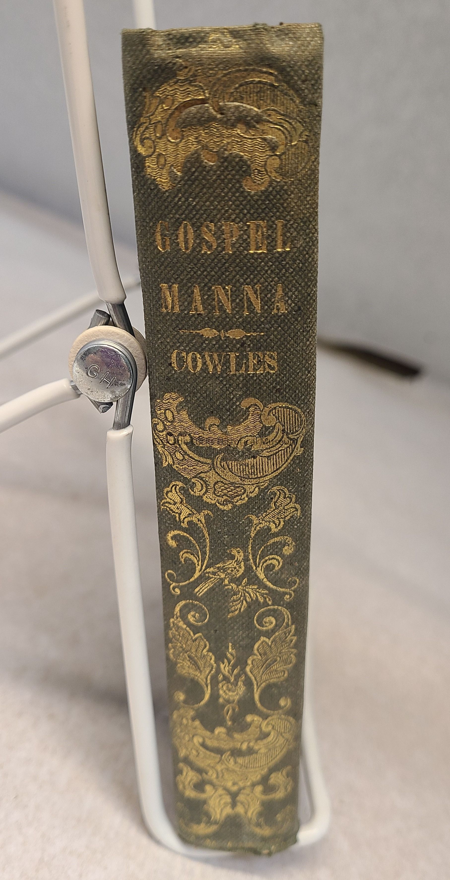 Book, dark green with engraved details. On the spine there is gold font and details. Title: Gospel Manna