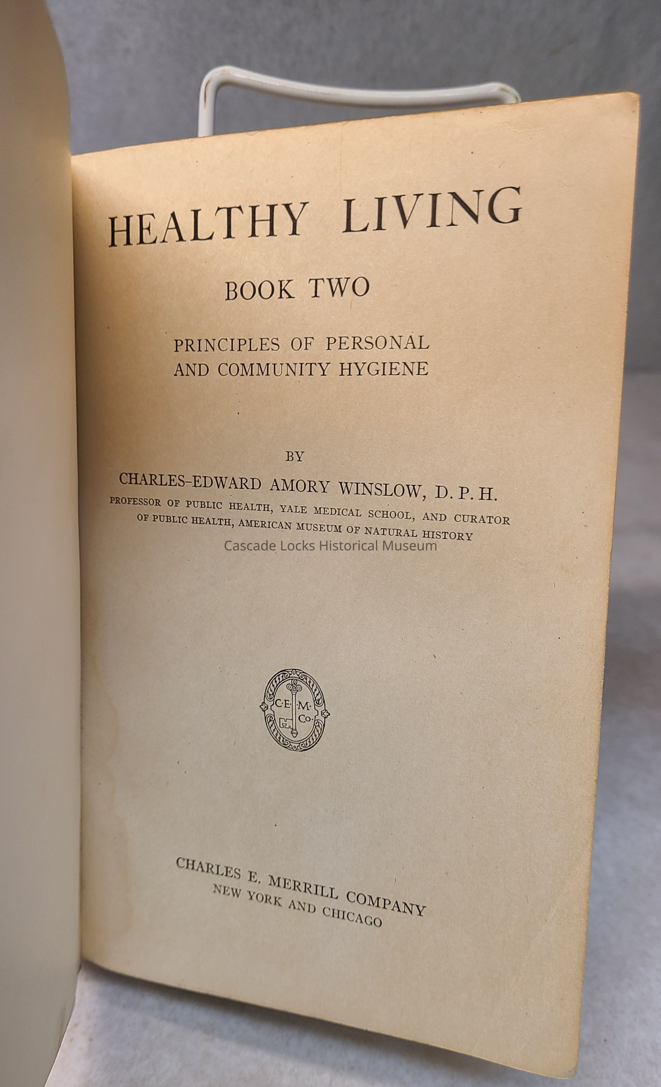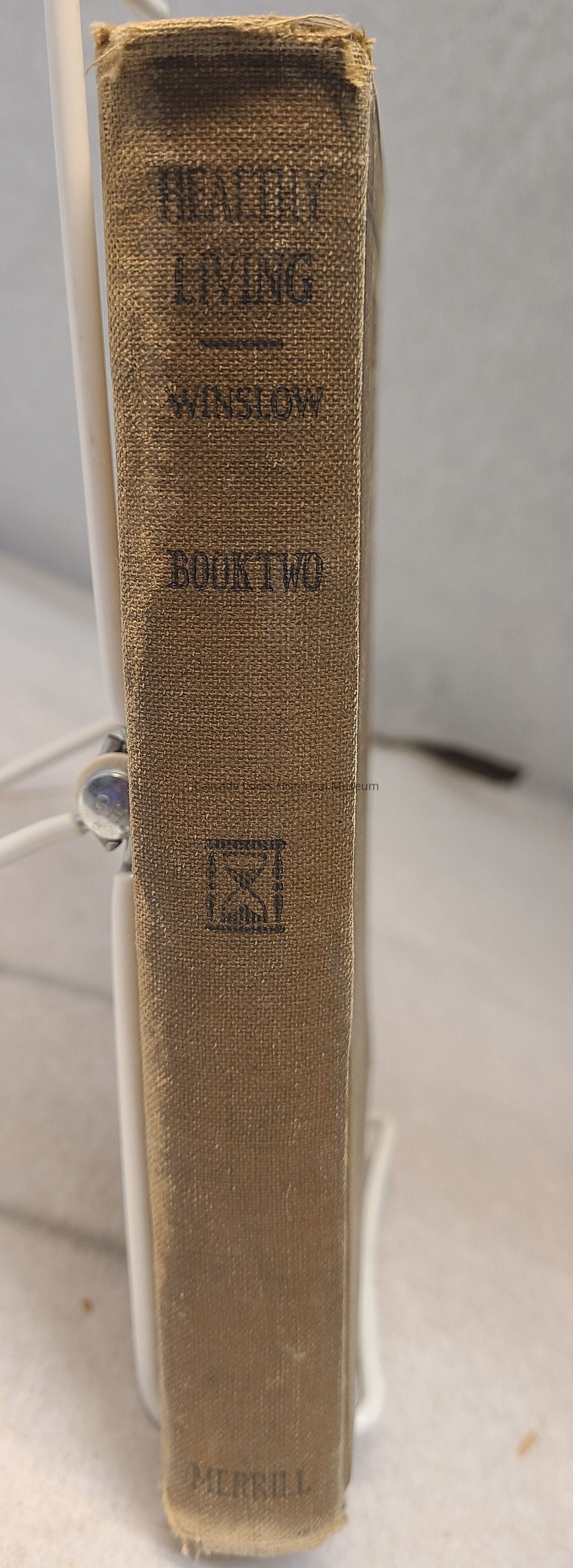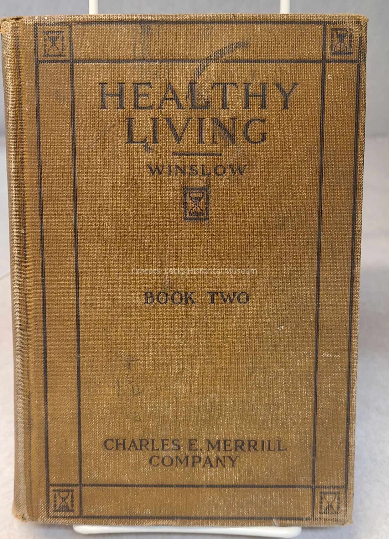 Book, yellowish tan fabric cover with black font and details. Title: Healthy Living