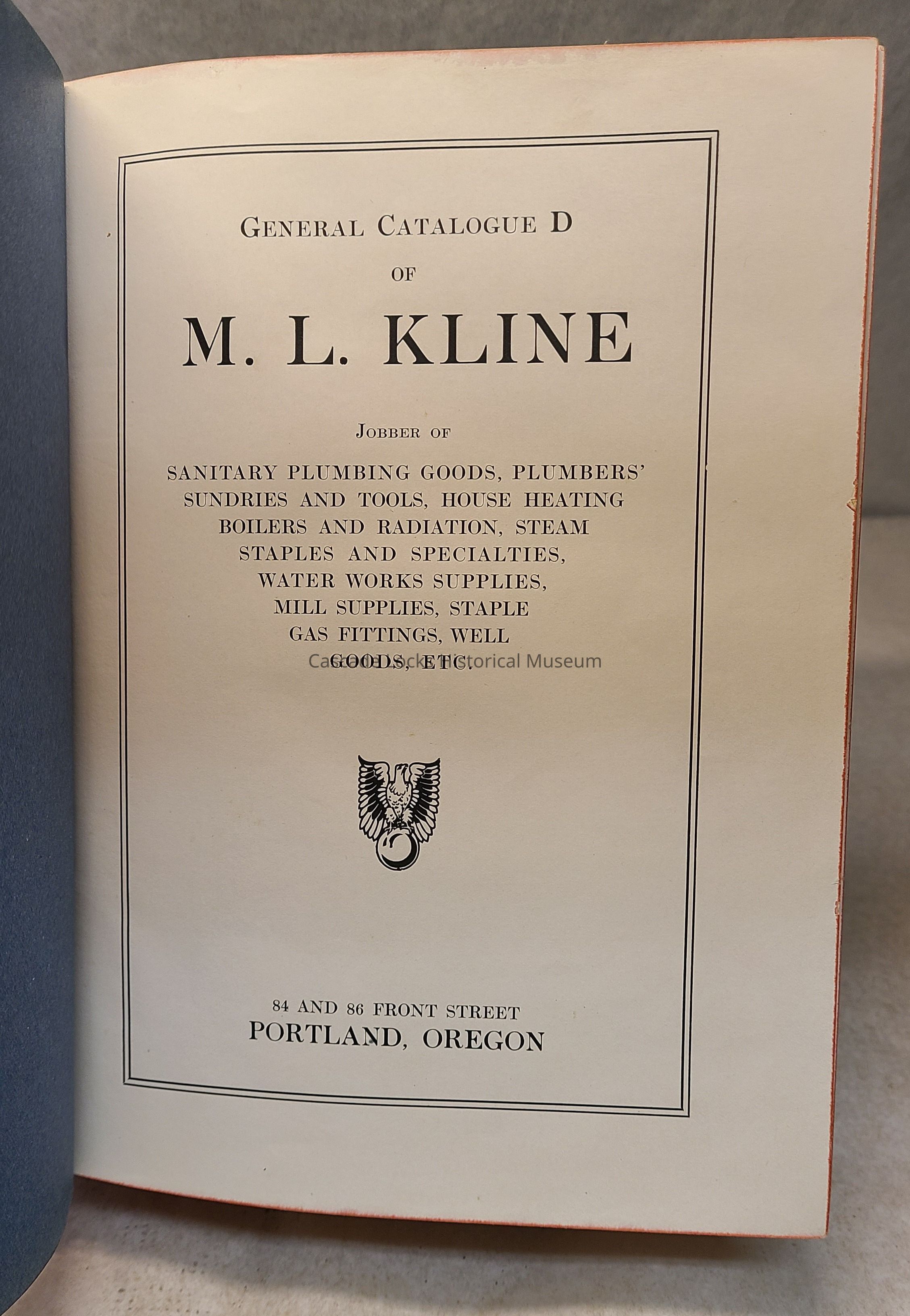 Title: M. L. Kline, Catalogue D. Portland, Oregon. Plumbing, Heating, & Steam Supplies.Lexicon