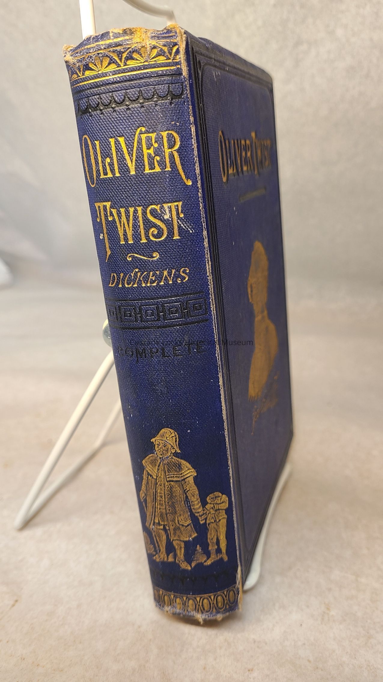 Book. Title- Oliver Twist. Book is hard cover. The cover is purple with gold font and gold portrait of a man.