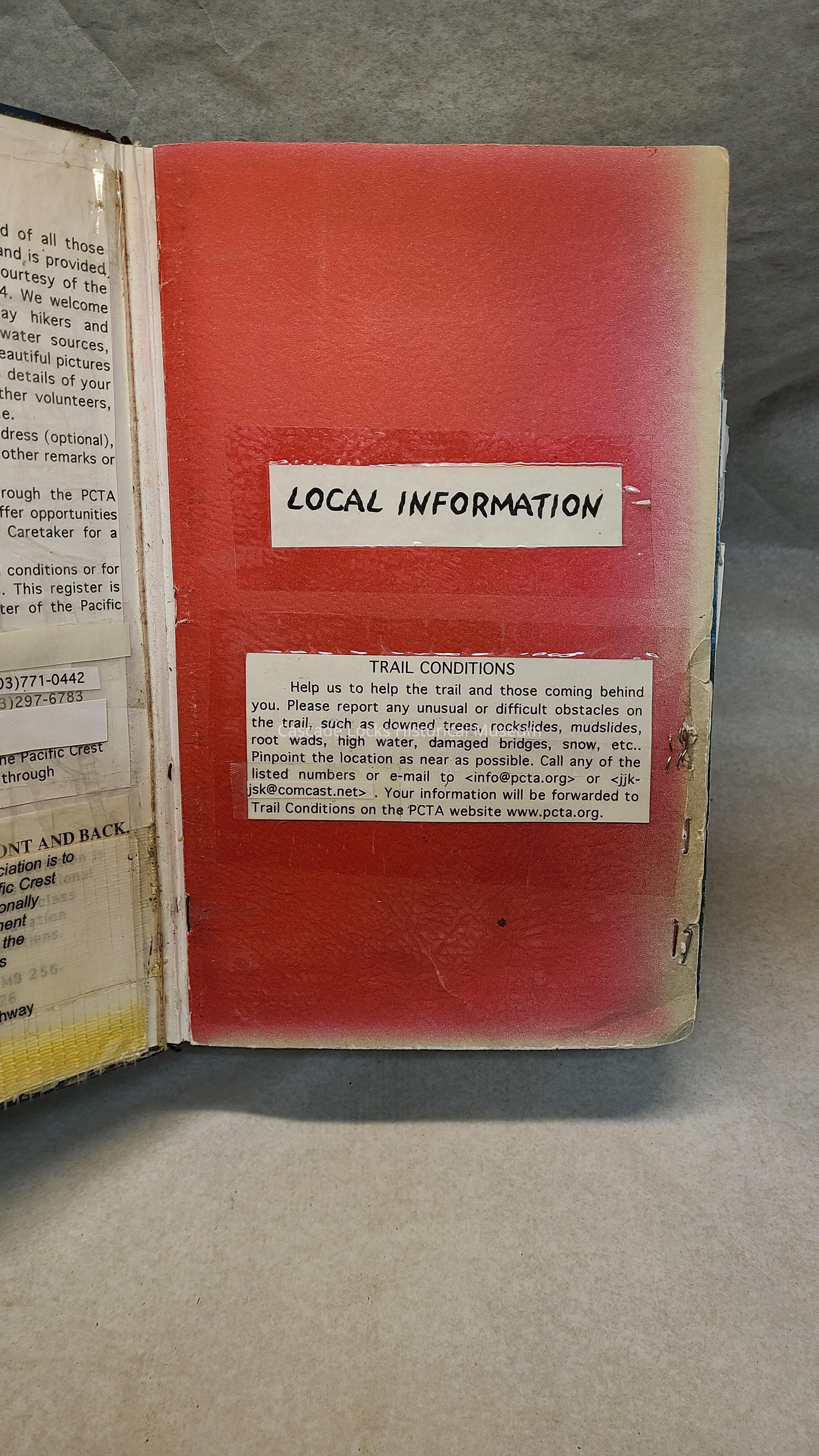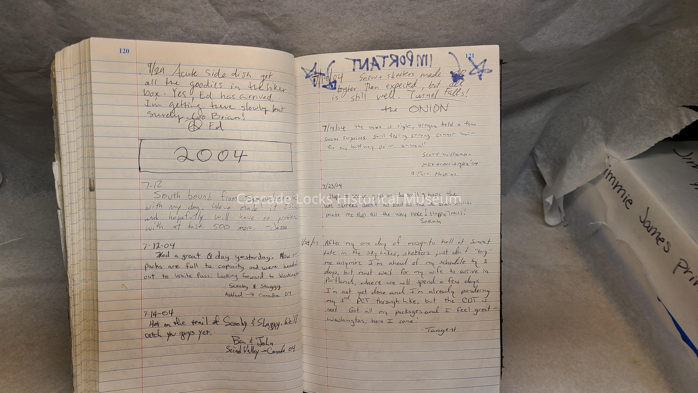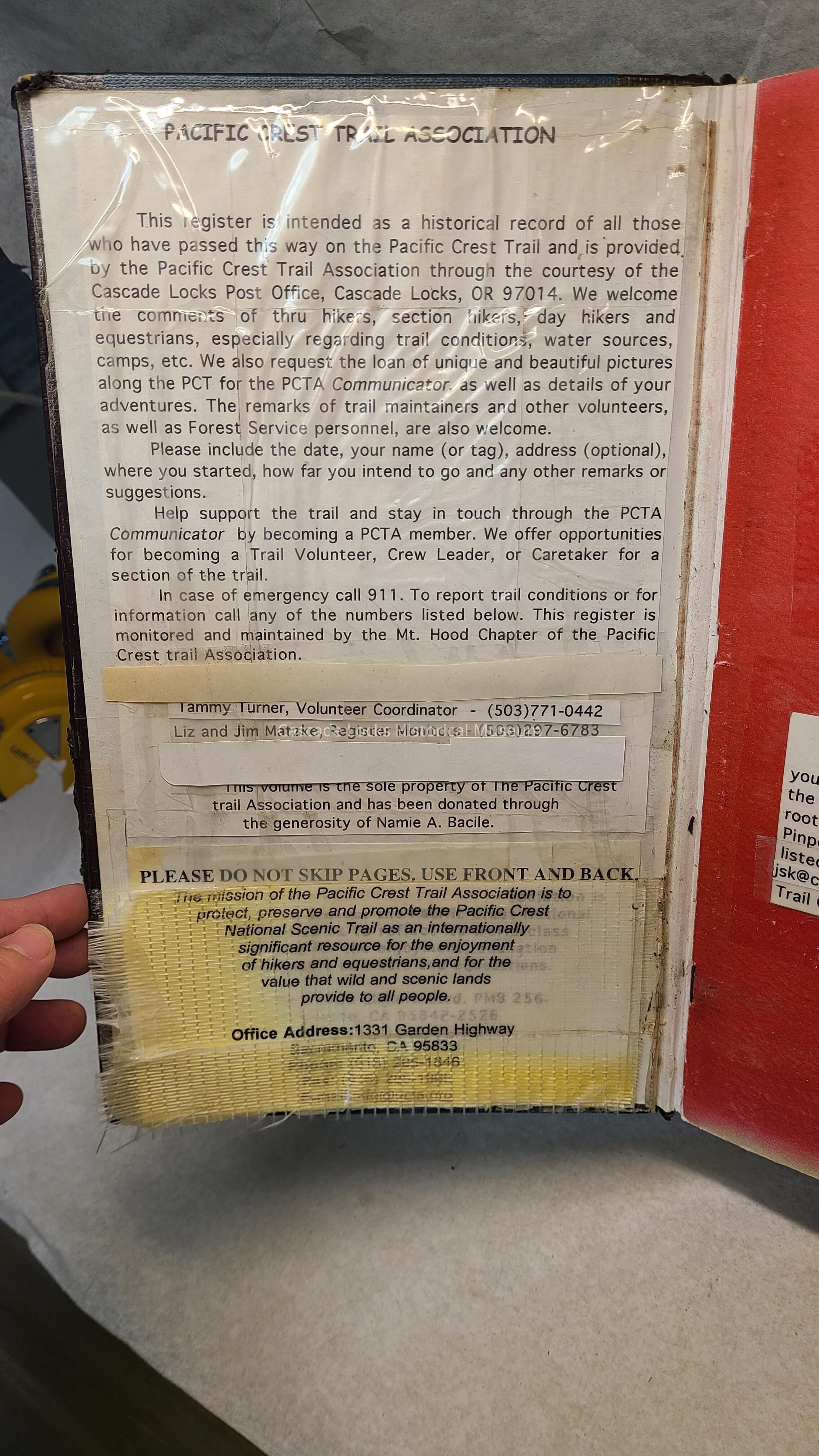 Pages are lined notebook paper that people hiking the PCT would sign and write inscriptions from August 16, 2000 to Oct 4, 2021.Transcription