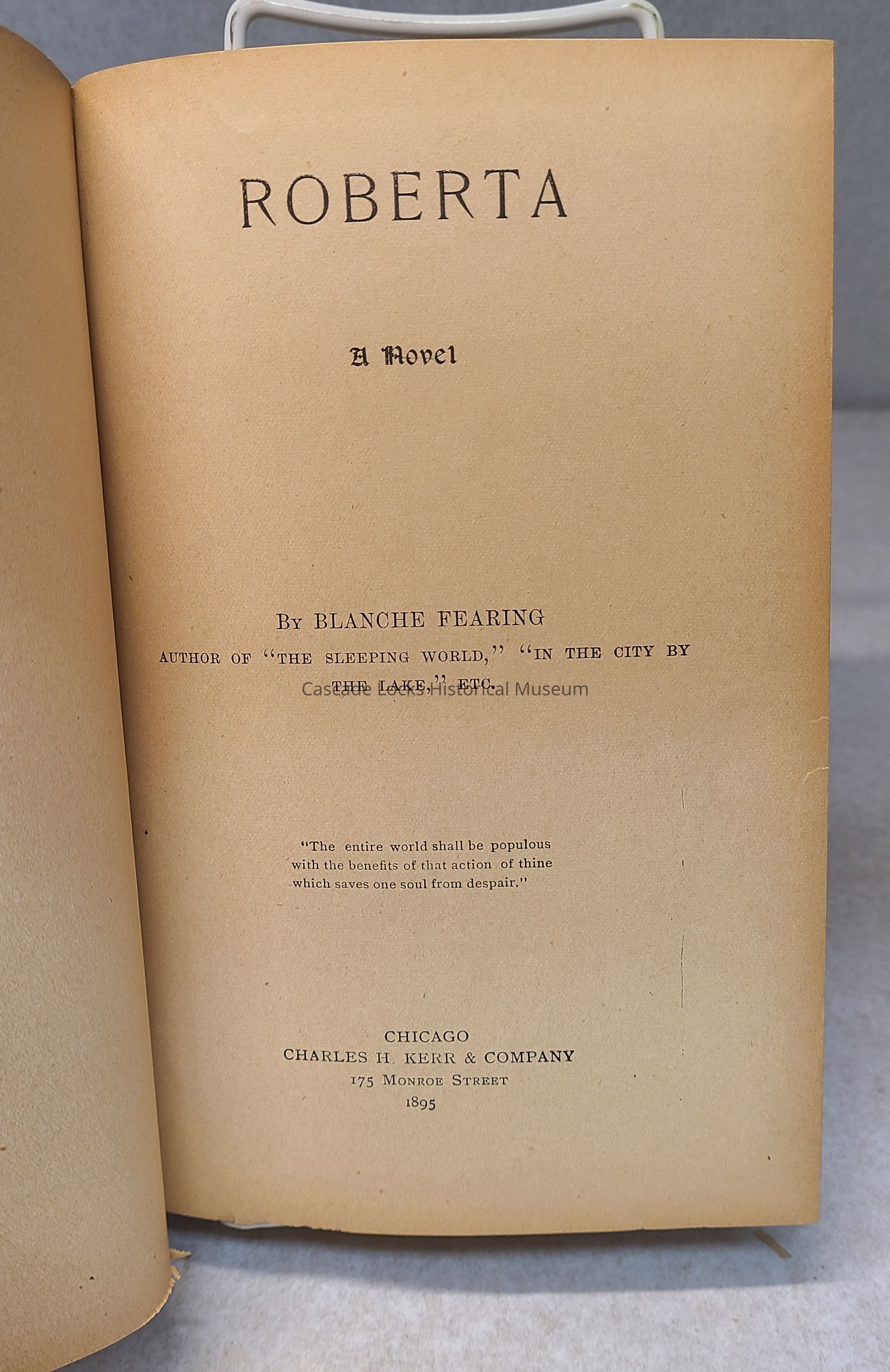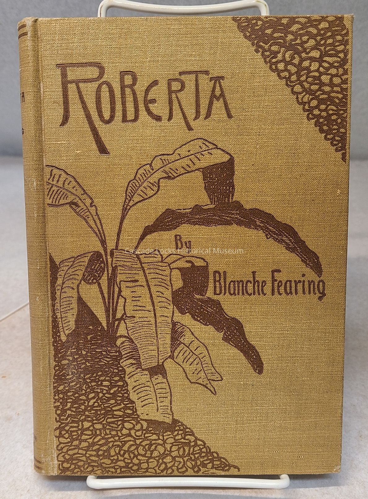 Book, tan cover brown detail and font. Title: Roberta, by Blanche Fearing.