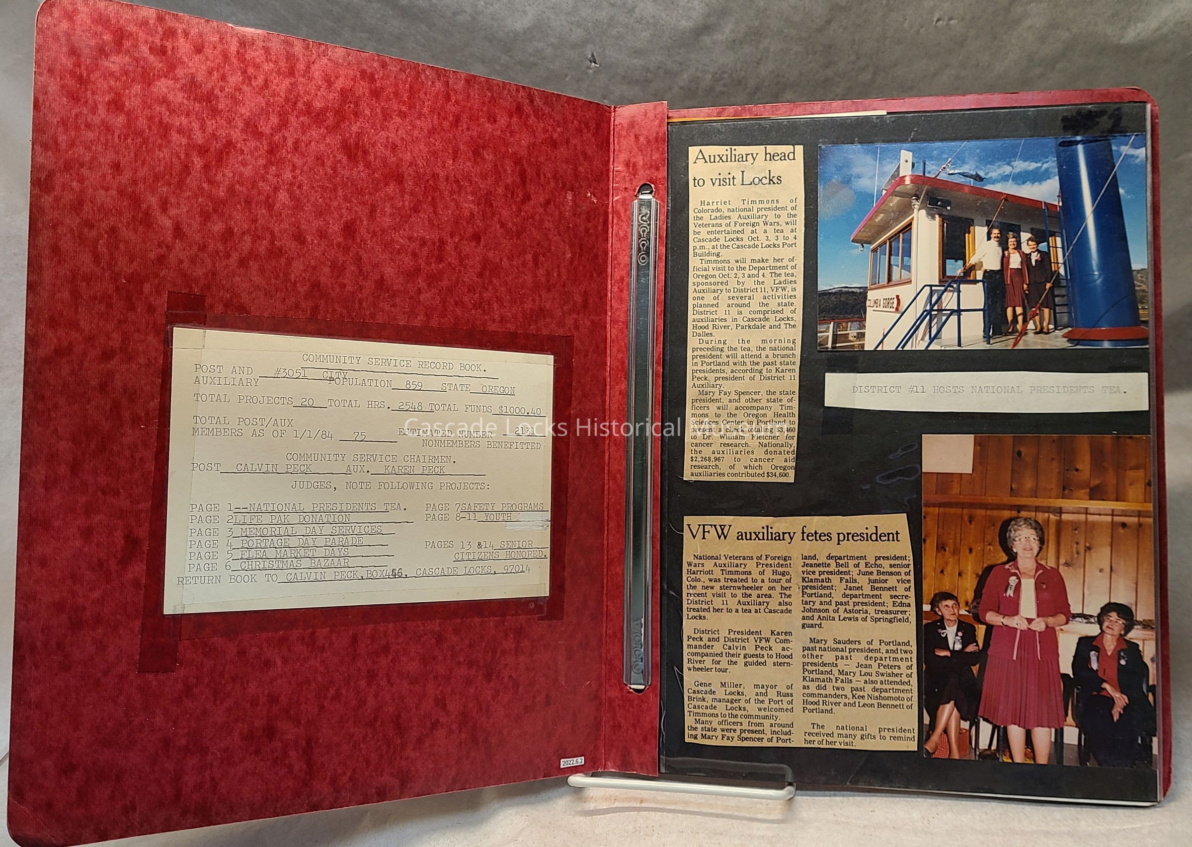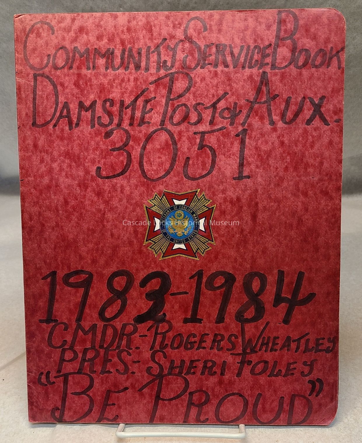 Community Service Book Damsite Post & AUX #3051. 1983-1984 CMDR- Rogers Wheatley, PRES- Sheri Foley. Be Proud.Language