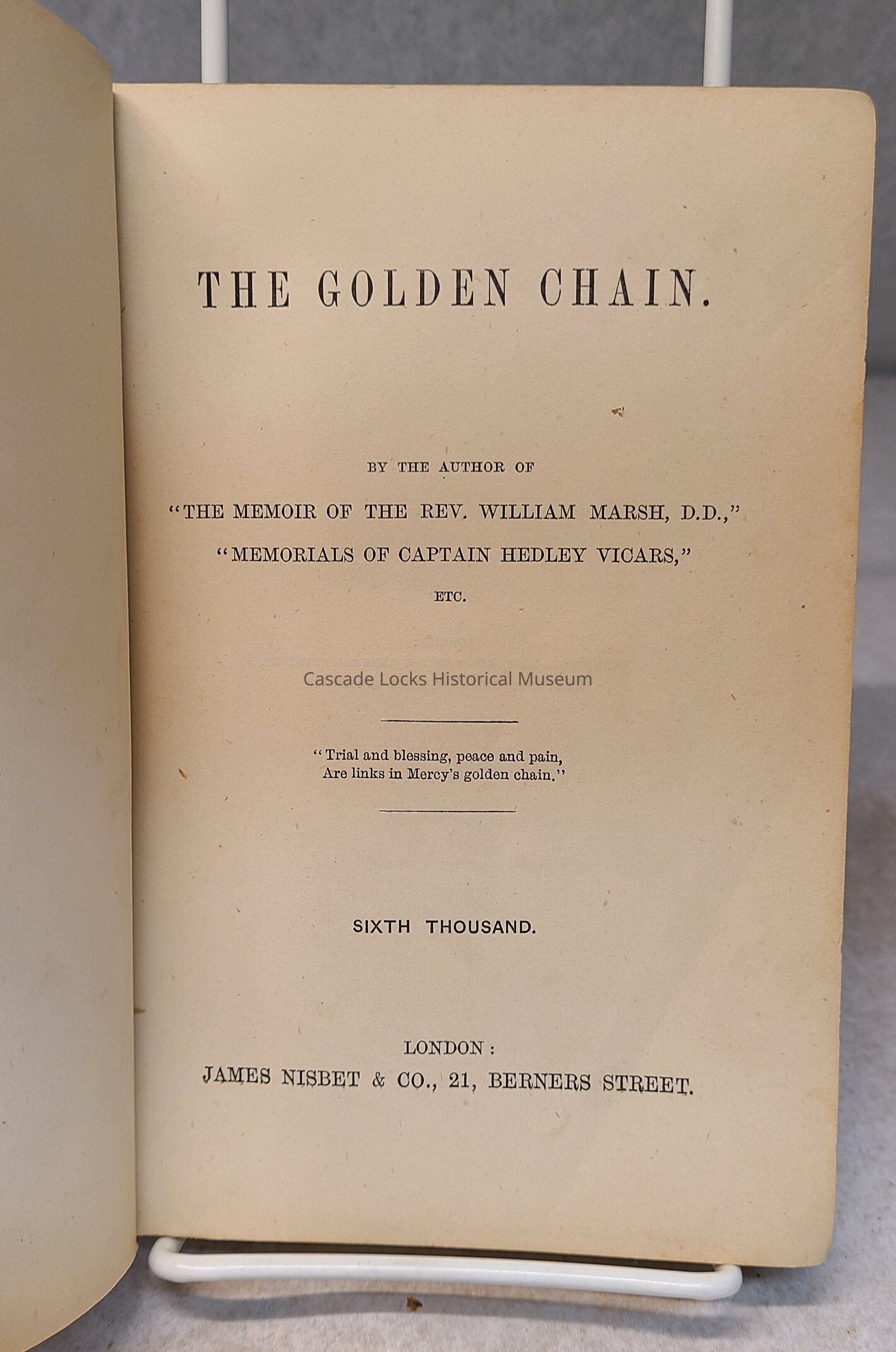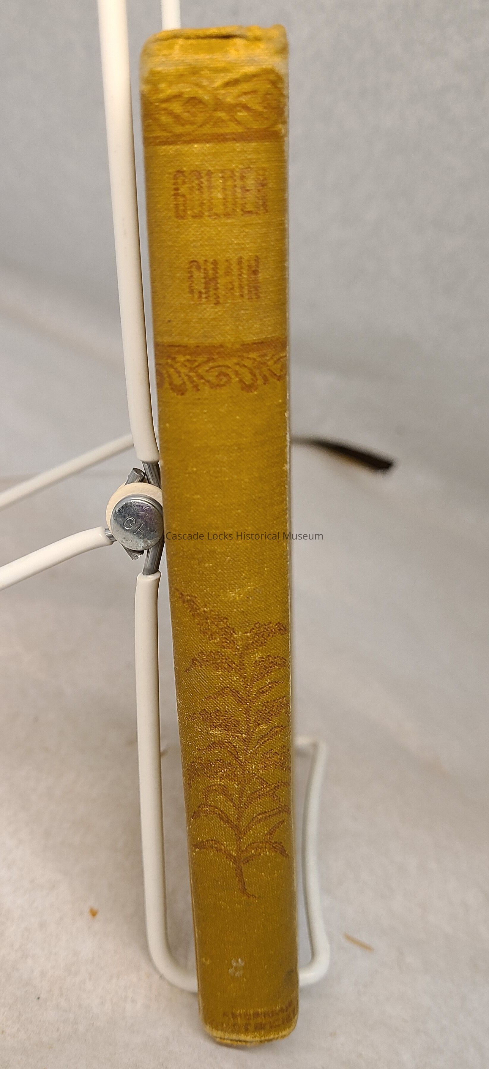 Book, yellow with raised detail. The spine has orange-ish red font and detail. Title: The Golden Chain