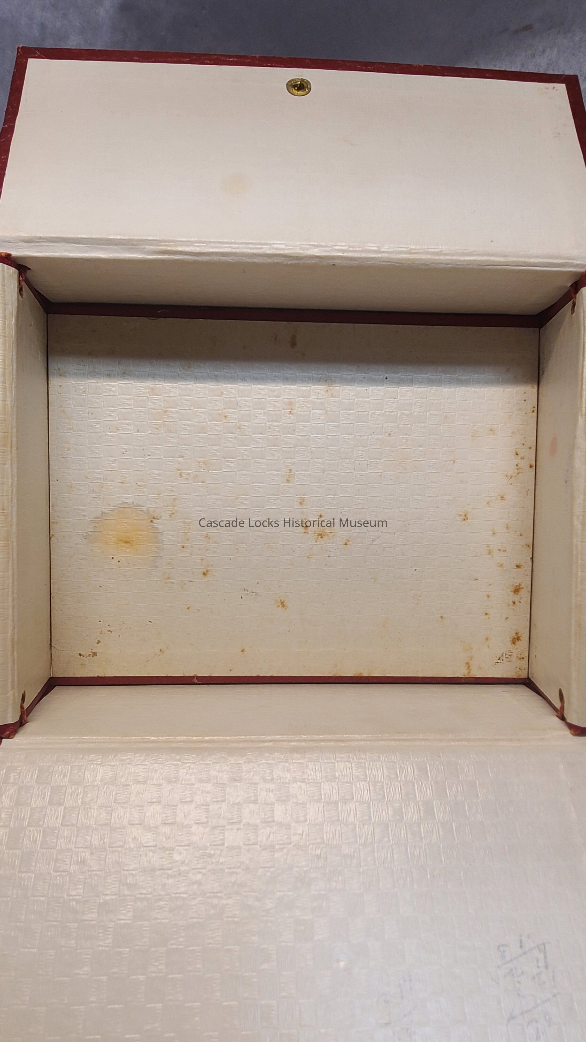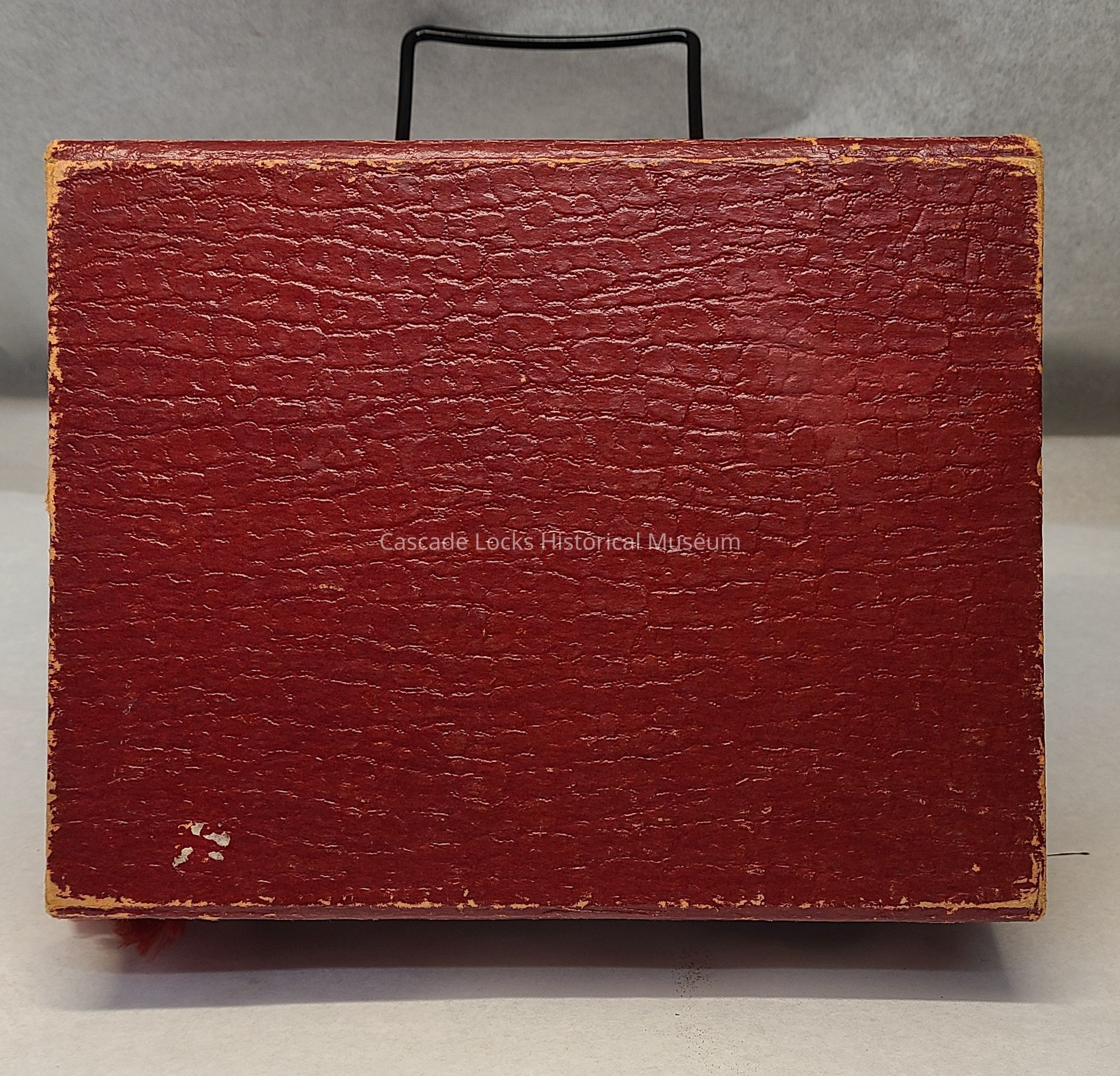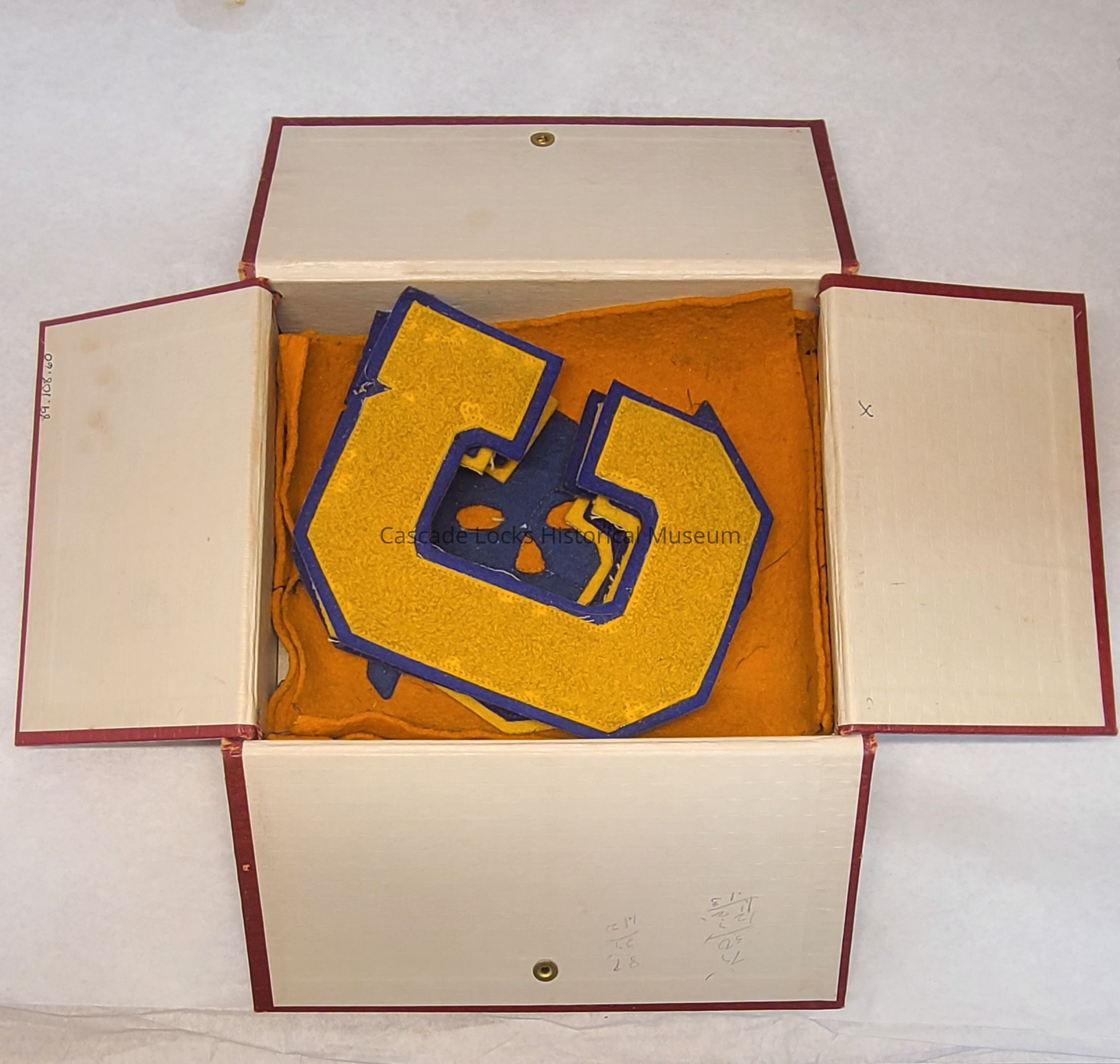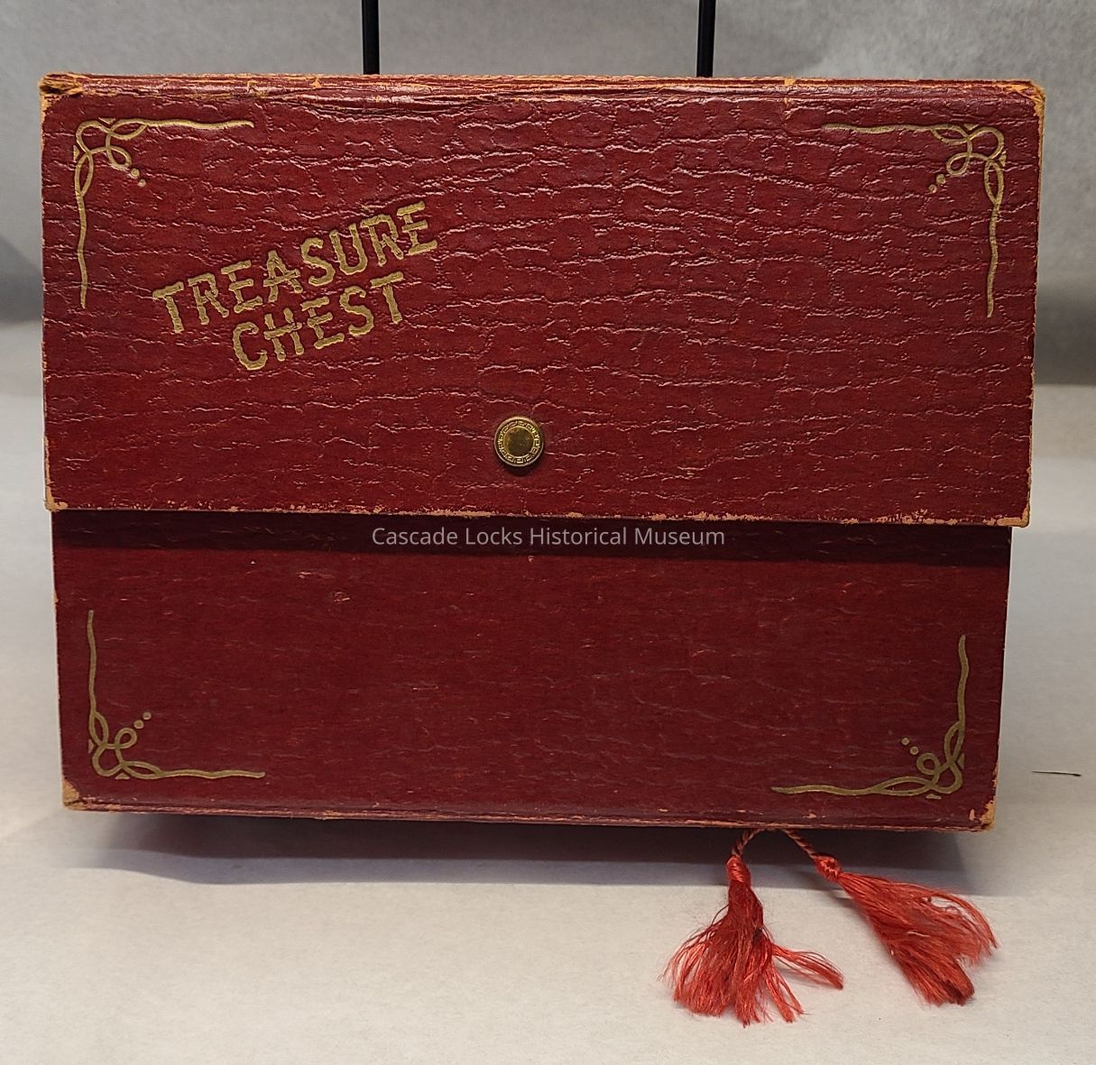 Red box that folds and snaps together and tension fitted with a string. Gold font on the front of the box reads, "Treasure Chest." Inside the box is filed with four Letterman's patches, two mascot patches, and three coins.
