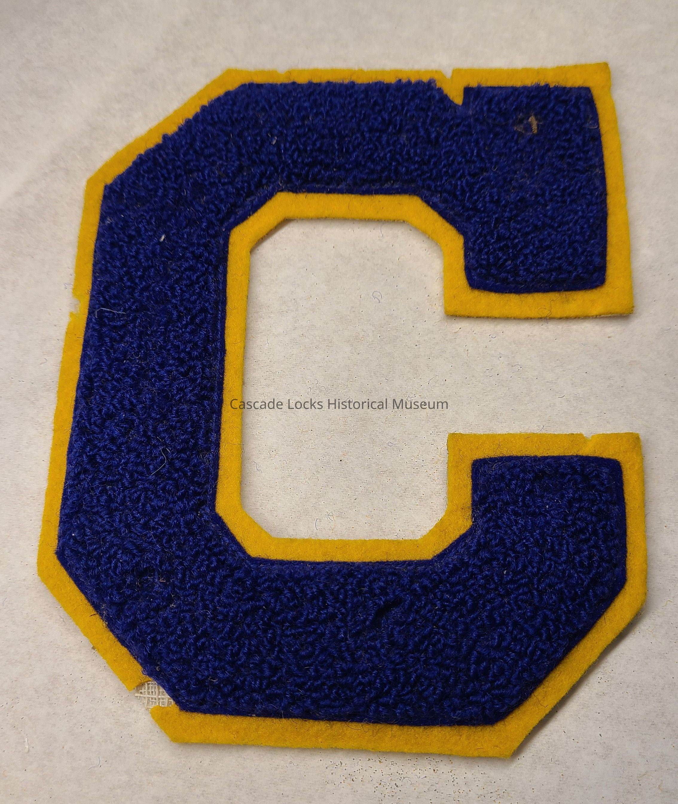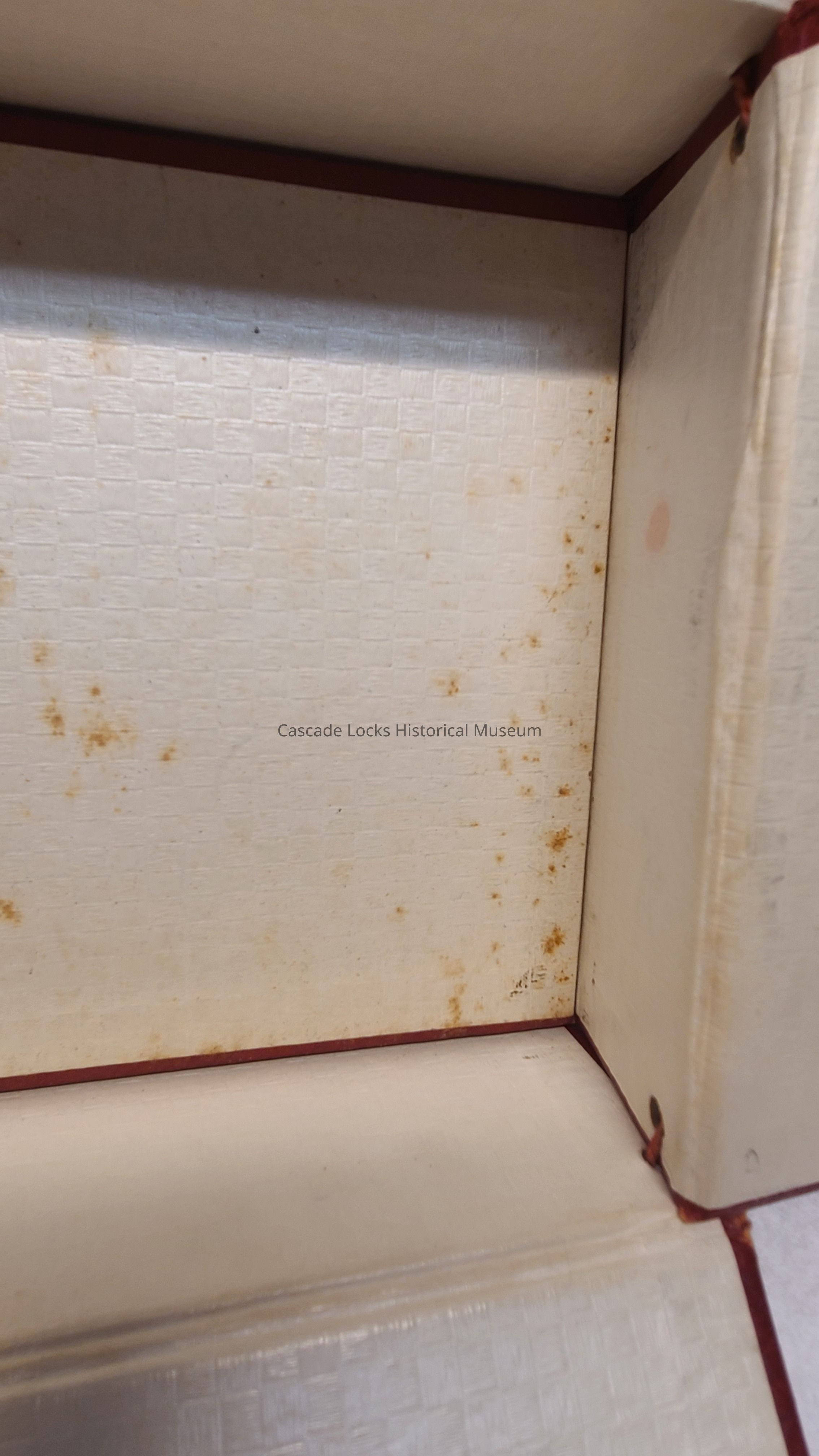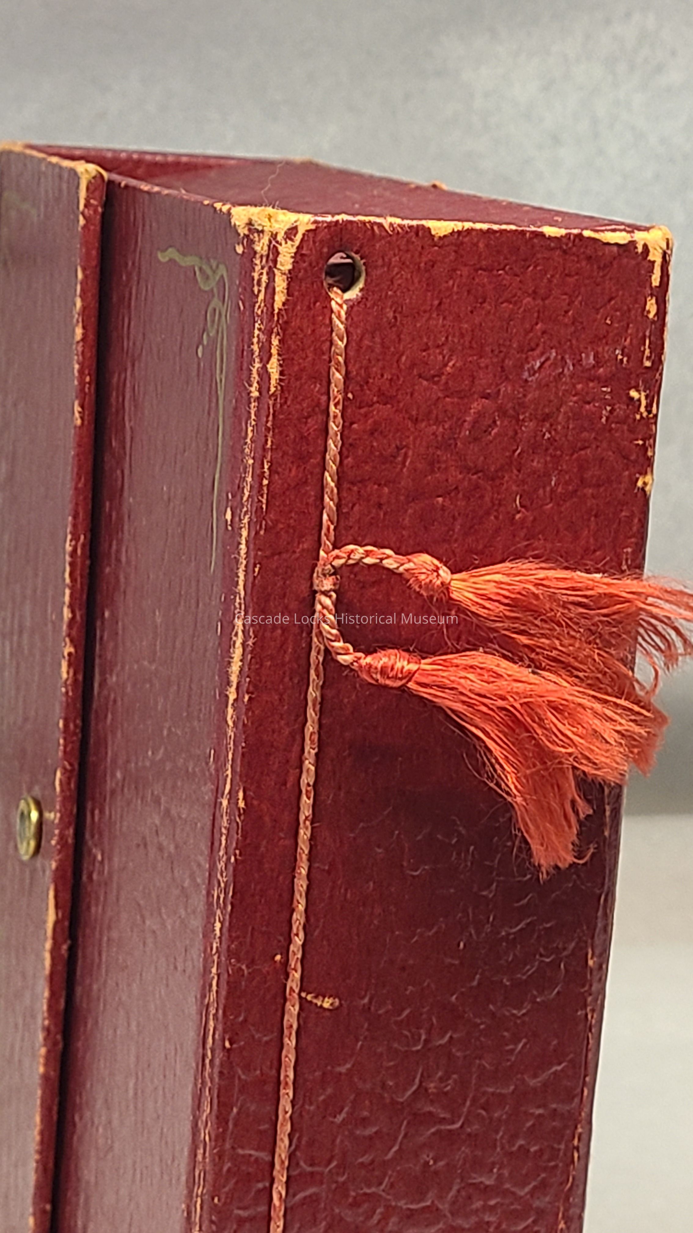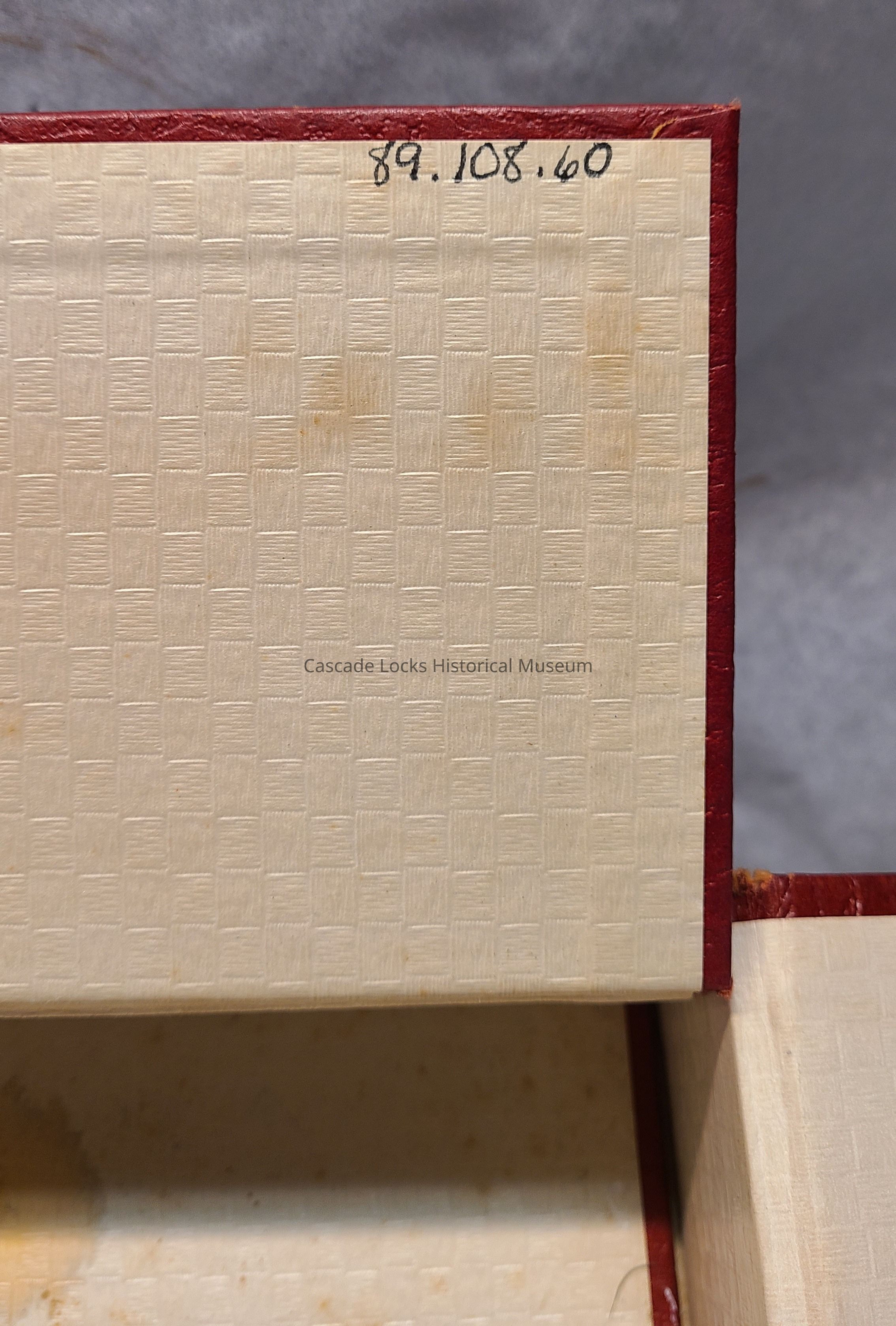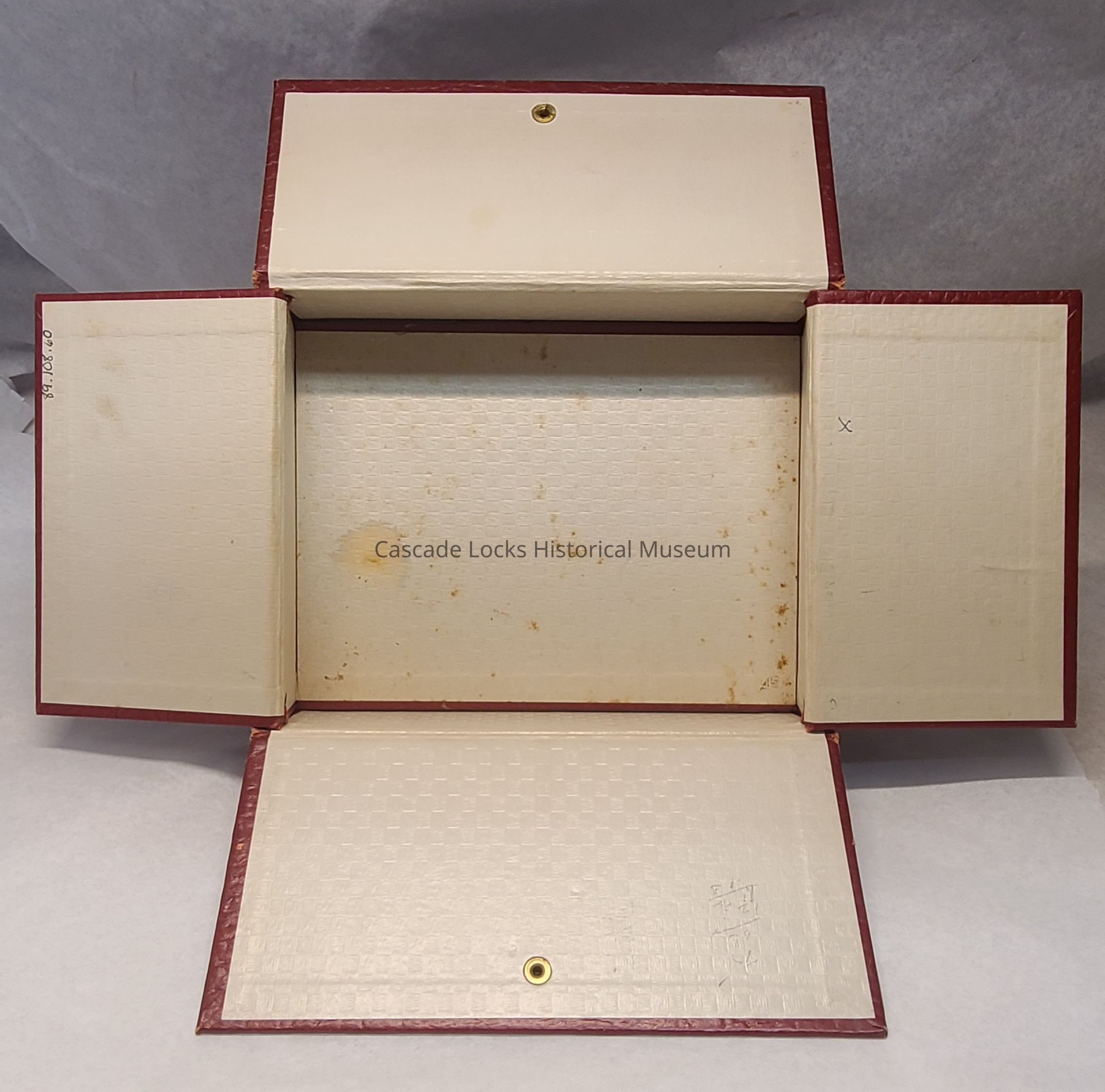 Red box that folds and snaps together and tension fitted with a string. Gold font on the front of the box reads, "Treasure Chest." Inside the box is filed with four Letterman's patches, two mascot patches, and three coins.