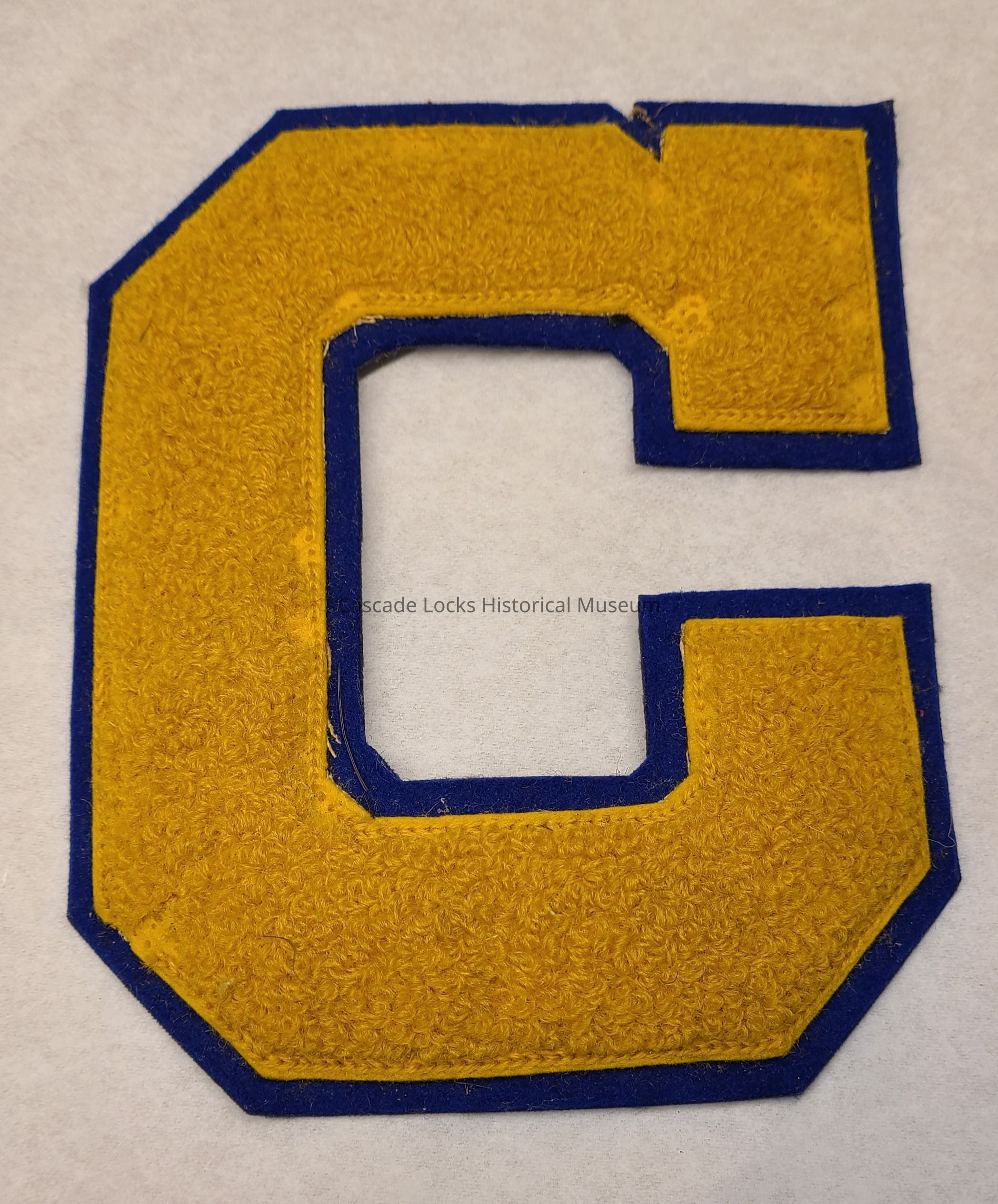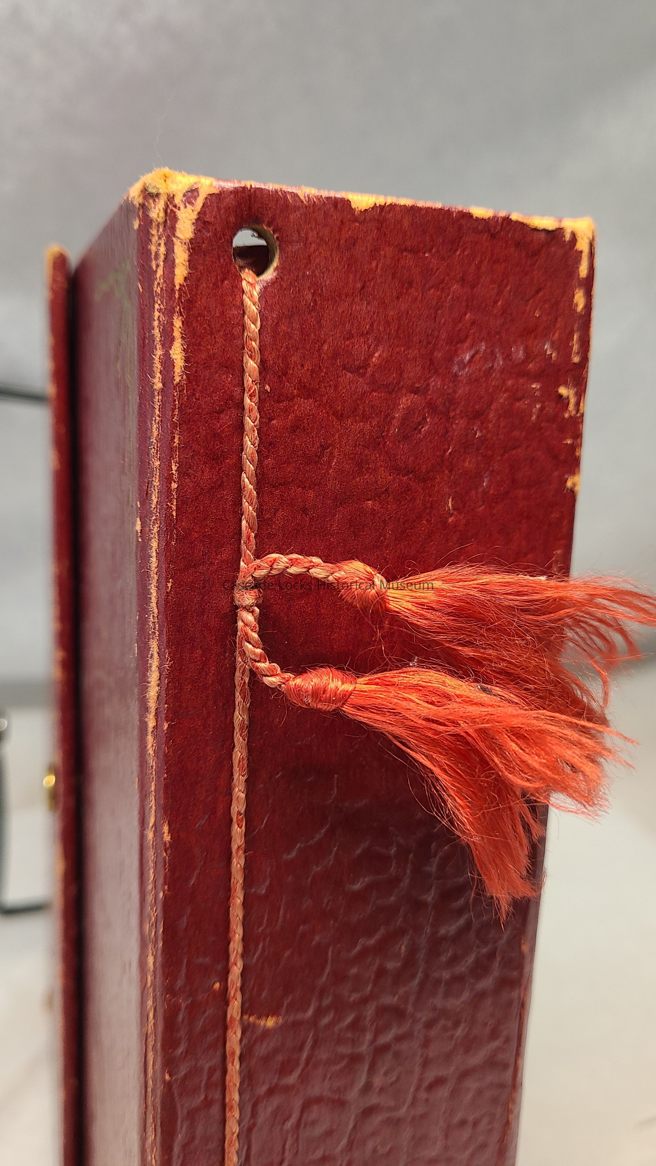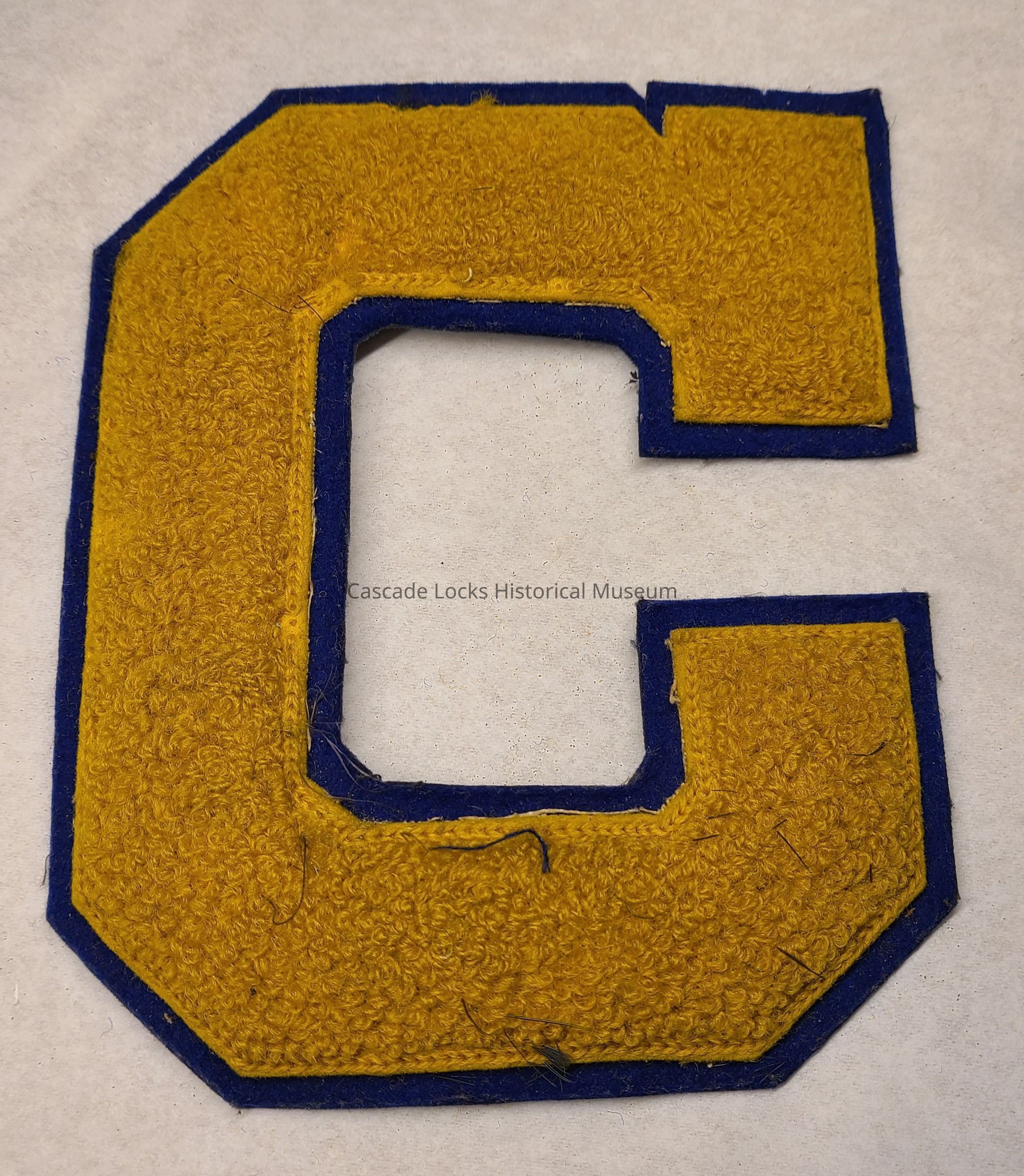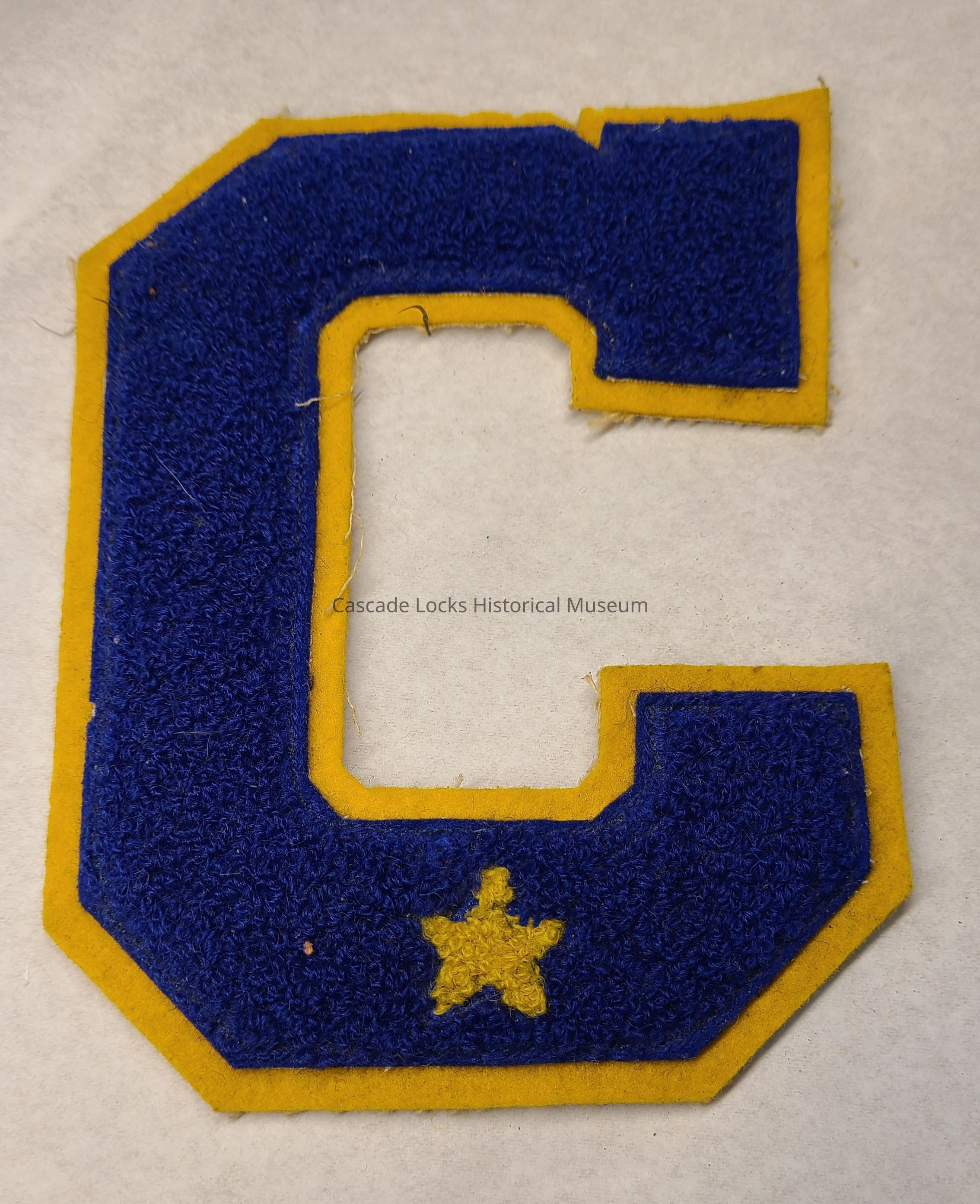 Red box that folds and snaps together and tension fitted with a string. Gold font on the front of the box reads, "Treasure Chest." Inside the box is filed with four Letterman's patches, two mascot patches, and three coins.