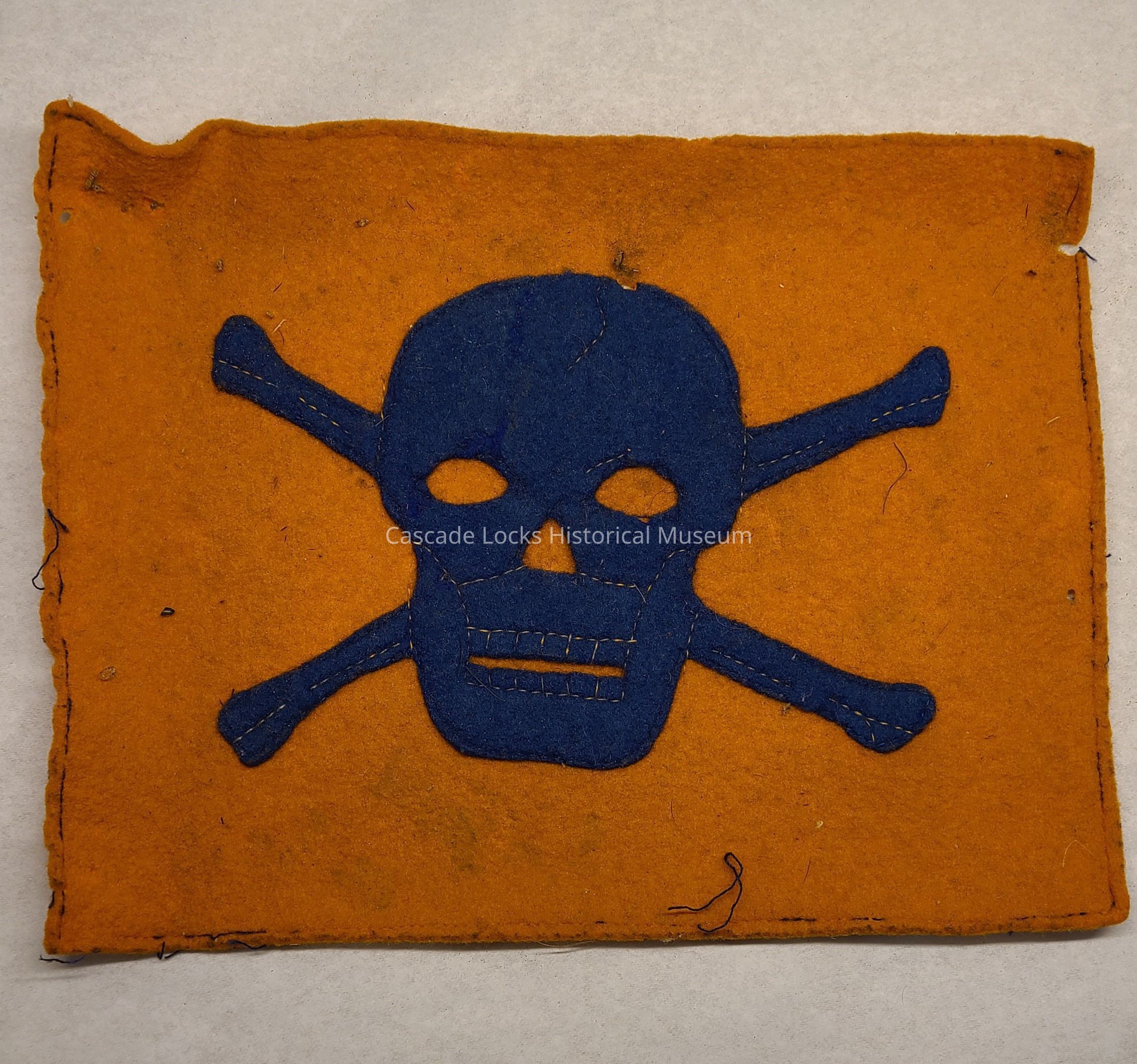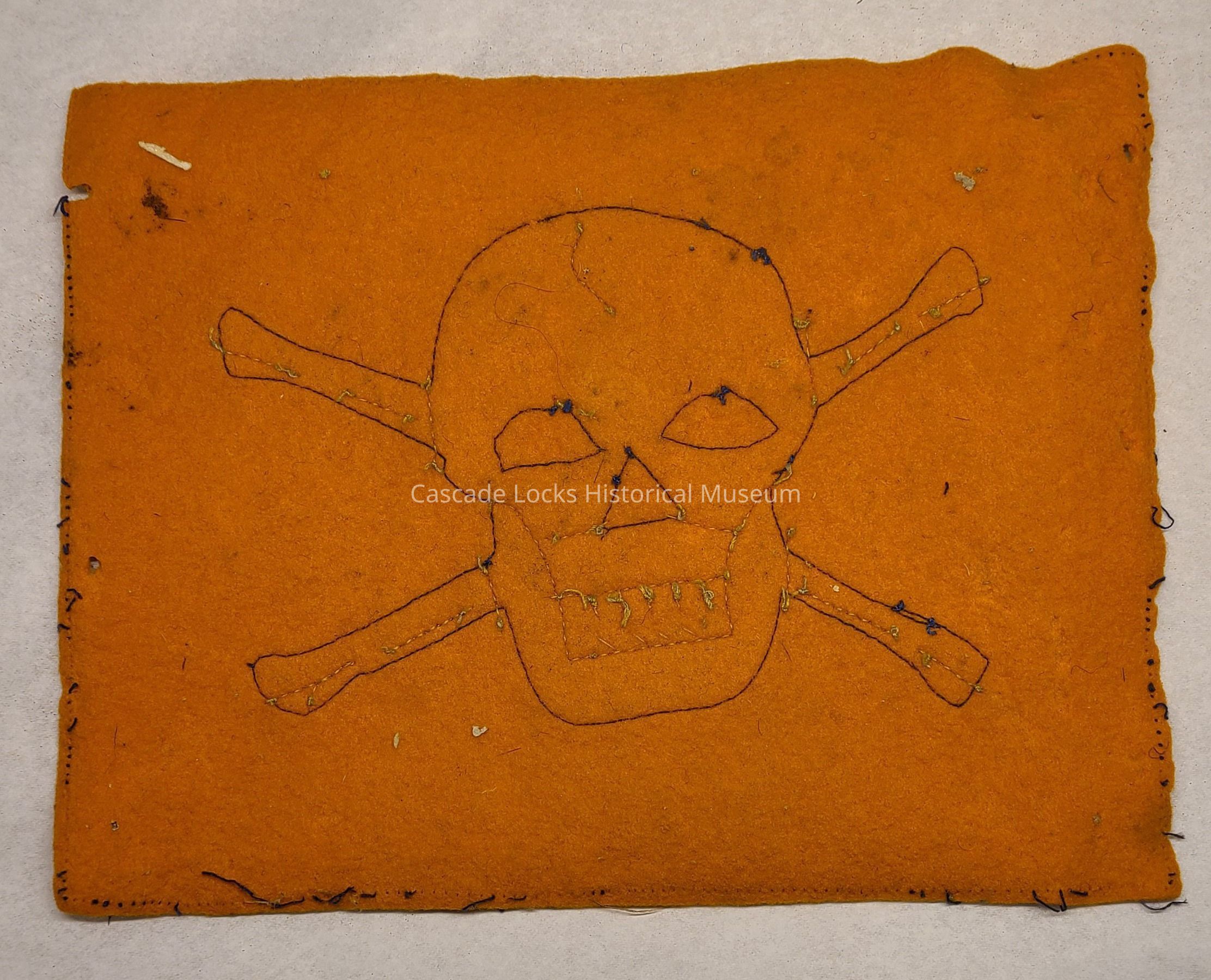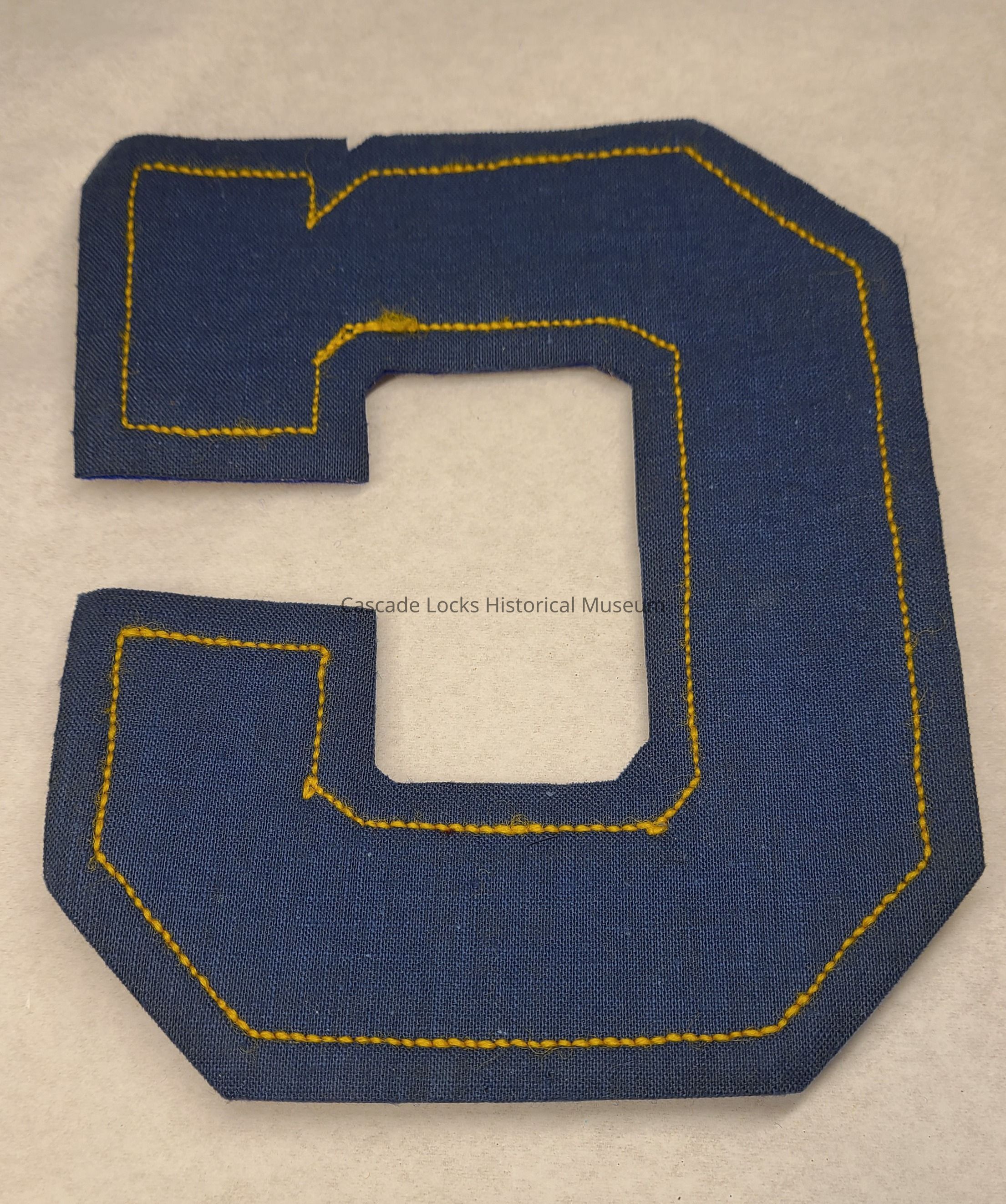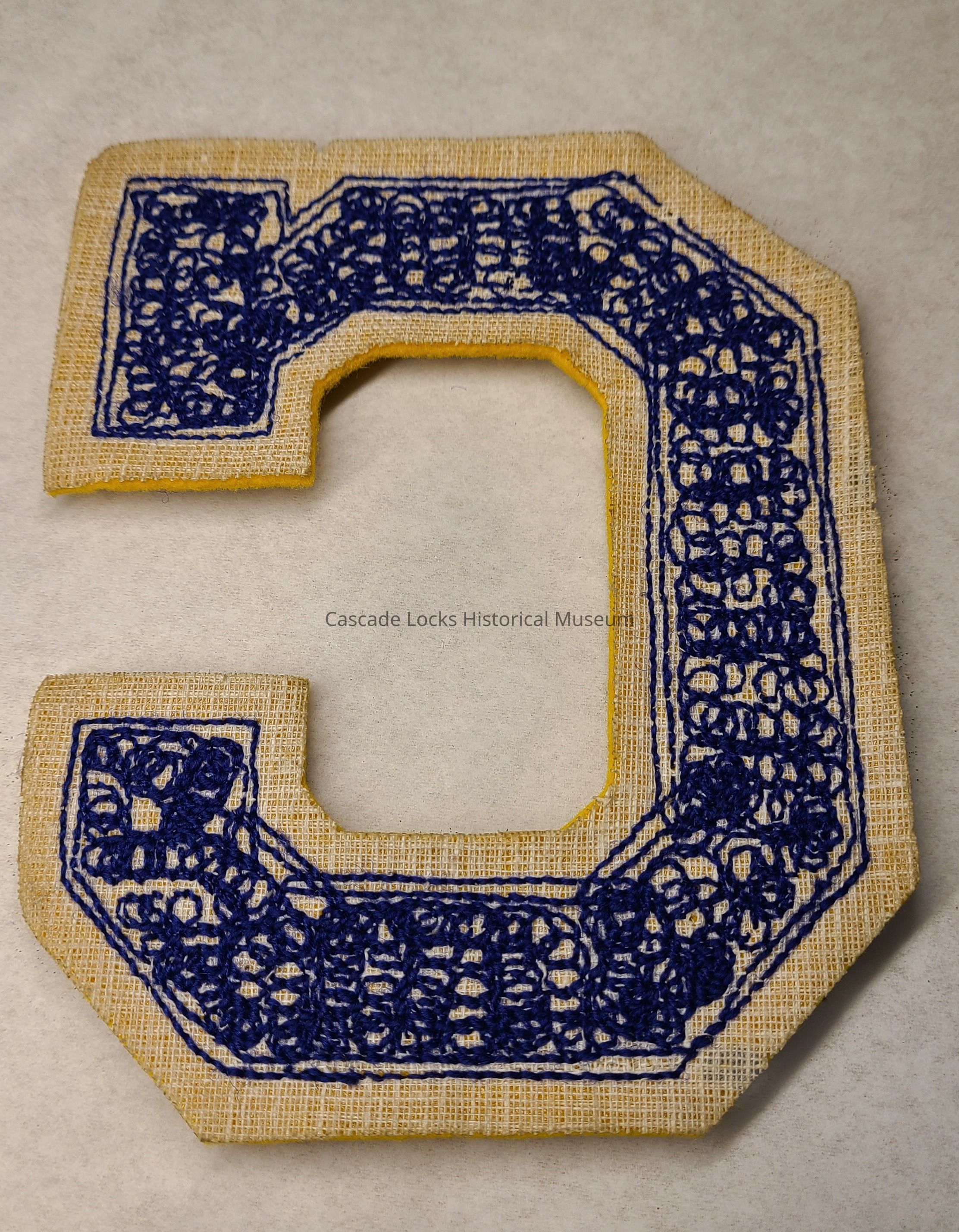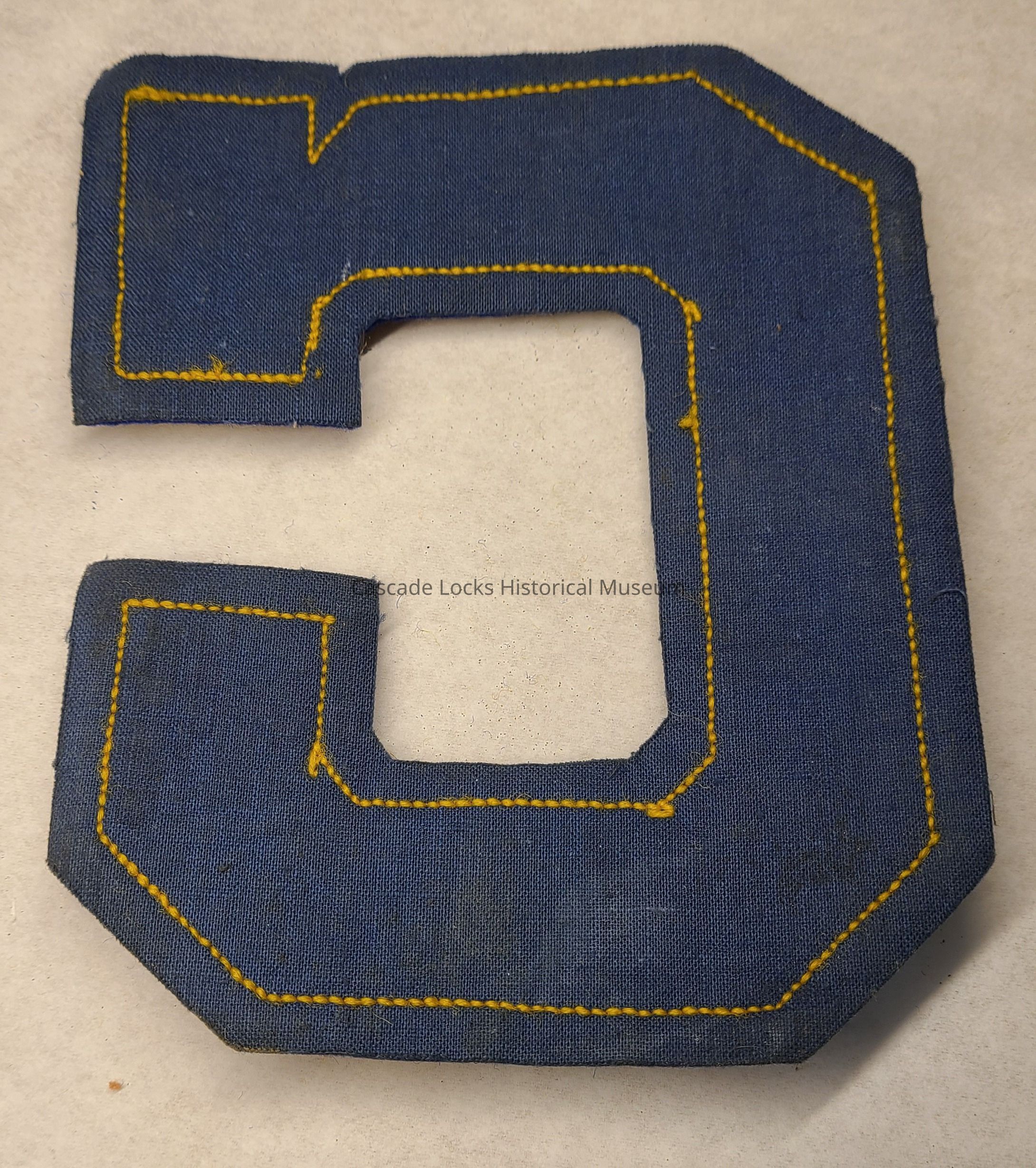 Red box that folds and snaps together and tension fitted with a string. Gold font on the front of the box reads, "Treasure Chest." Inside the box is filed with four Letterman's patches, two mascot patches, and three coins.
