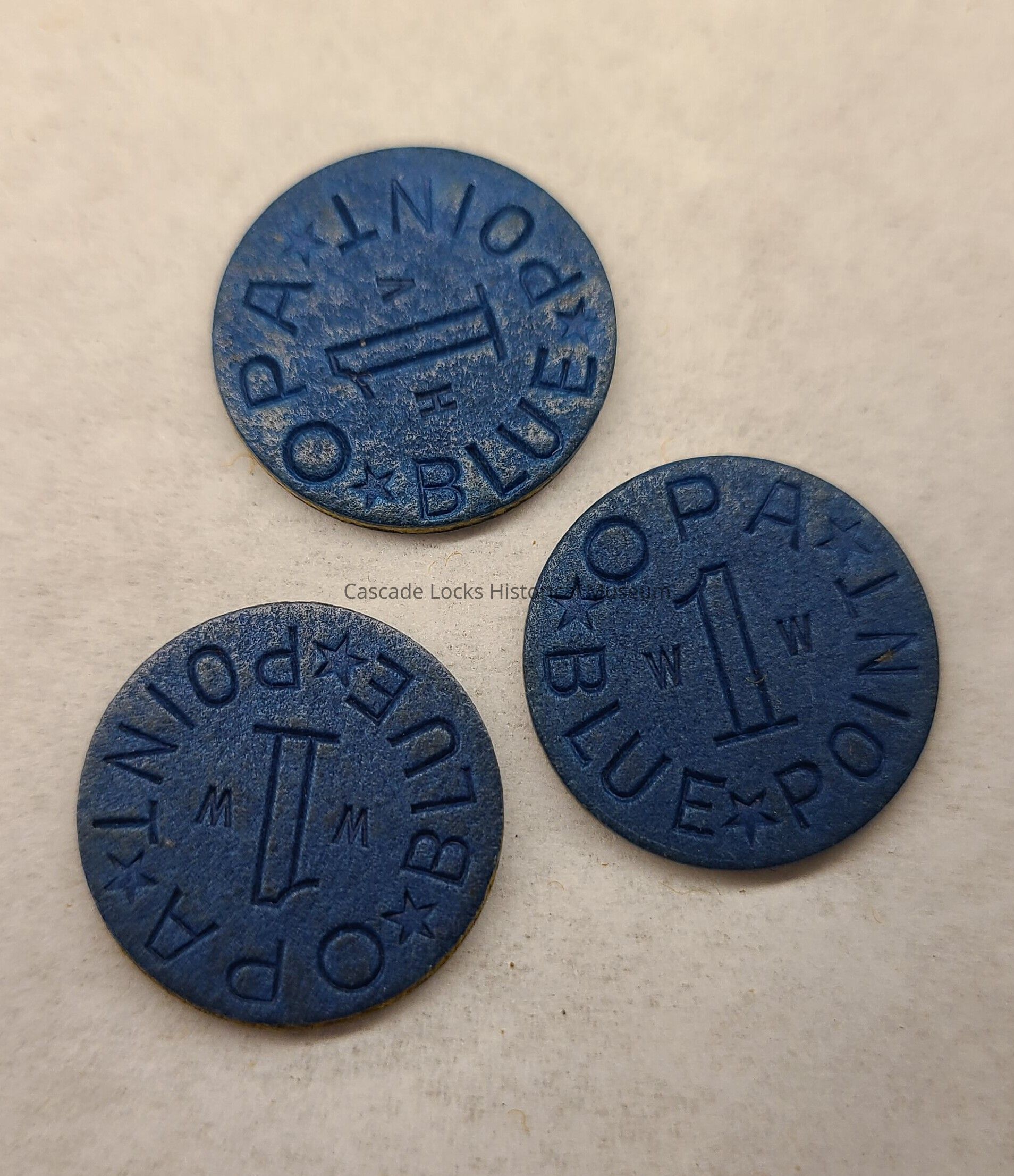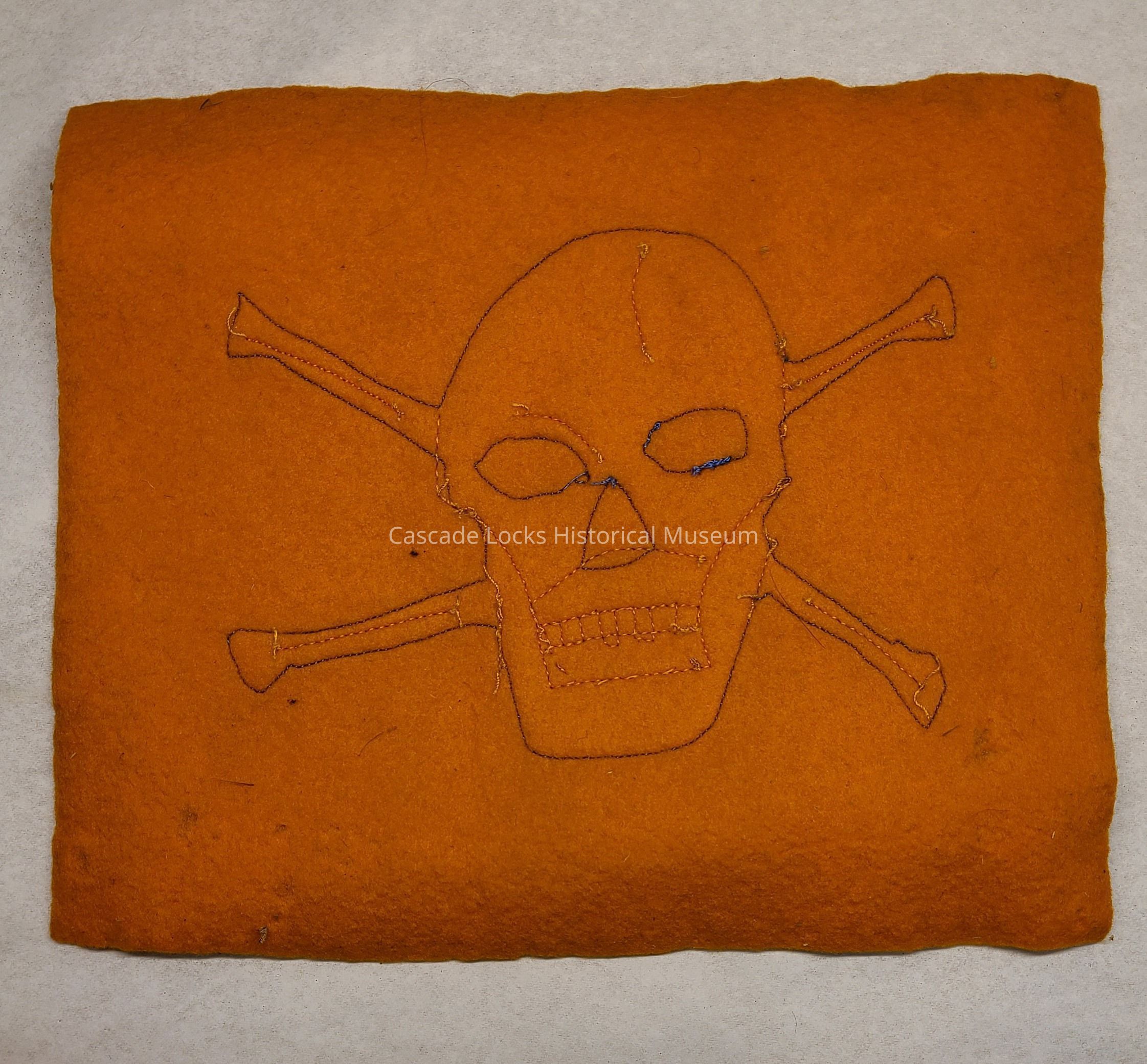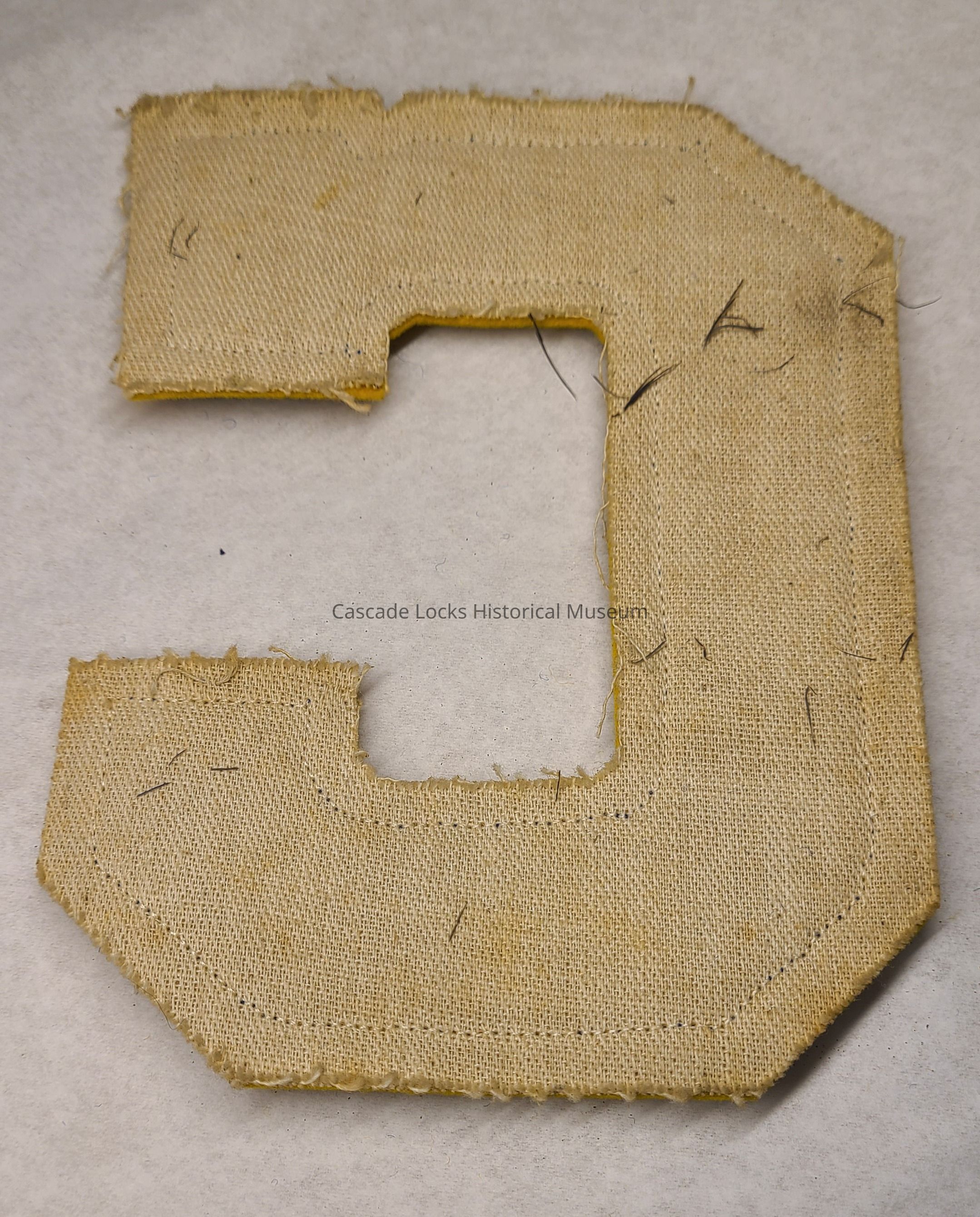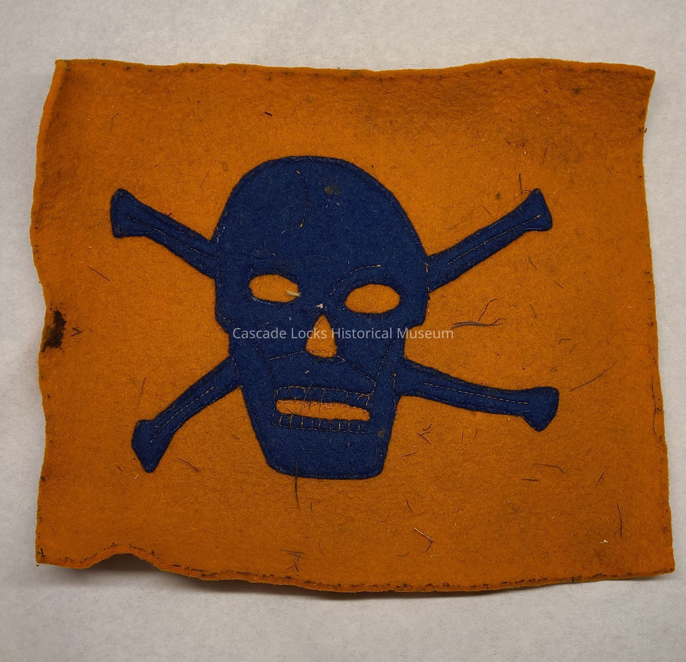 Red box that folds and snaps together and tension fitted with a string. Gold font on the front of the box reads, "Treasure Chest." Inside the box is filed with four Letterman's patches, two mascot patches, and three coins.