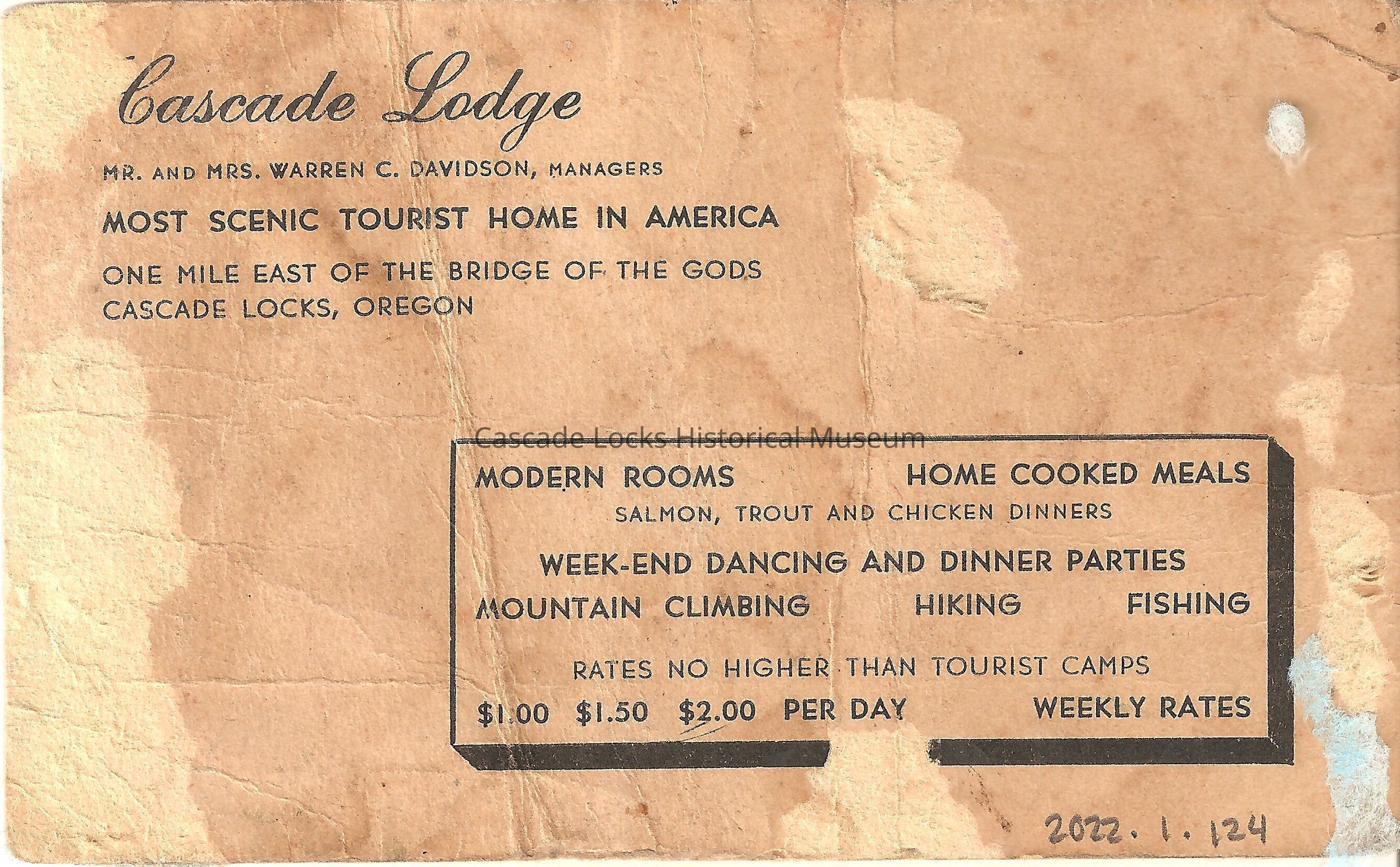 Back of image reads, "Cascade Lodge, Mr. and Mrs. Warren C. Davidson, Managers. Most scenic tourist home in America. One mile east of the Bridge of the gods. Cascade Locks, Oregon. Modern Rooms, Home cooked Meals, Salmon, Trout and Chicken Dinners, Week-end Dancing and Dinner Parties, Mountain Climbing, Hiking, Fishing, Rates No Higher Than Tourist Camps, $1.00, "1.50, $2.00 Pre Day, Weekly Rates."Lexicon