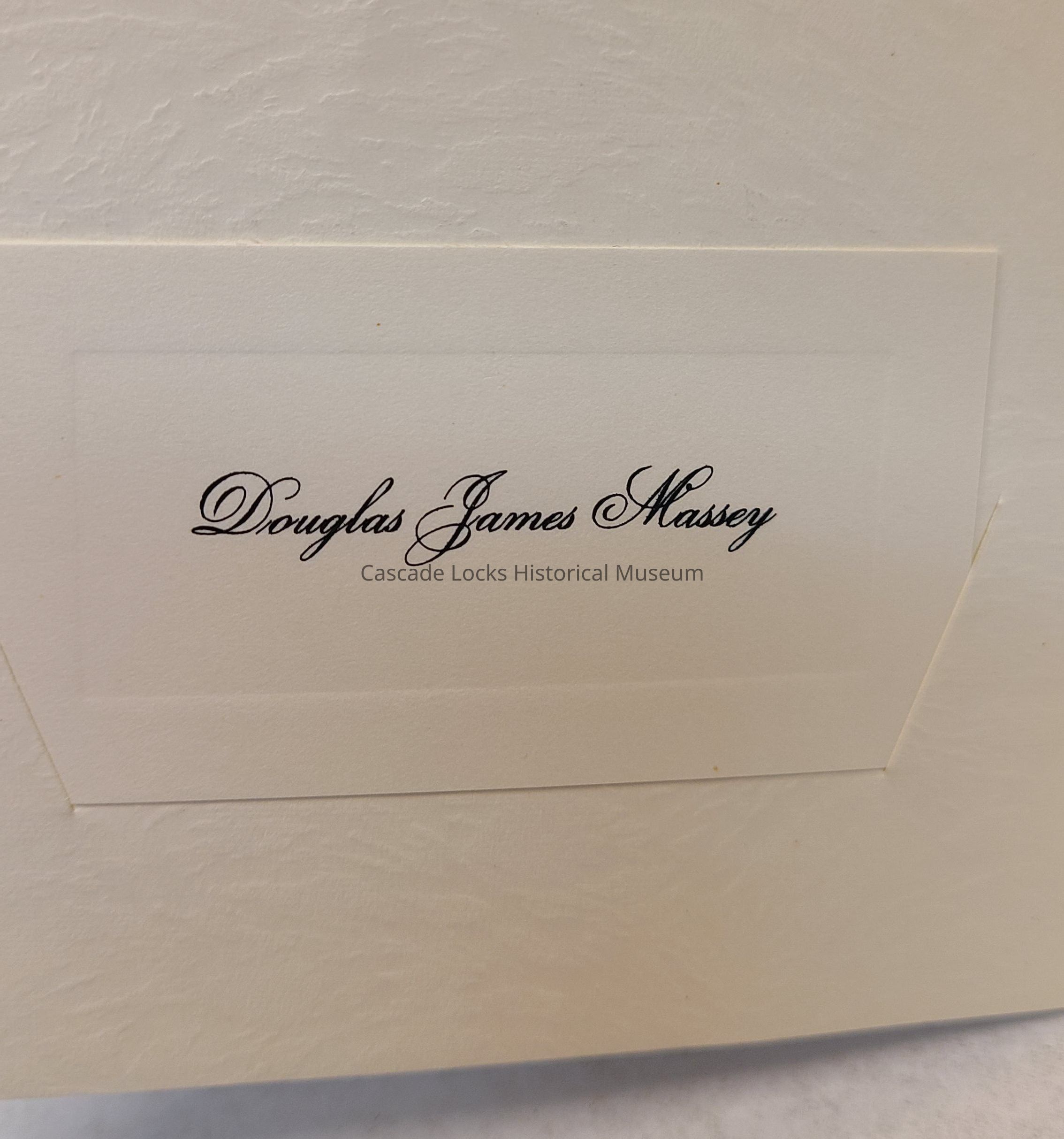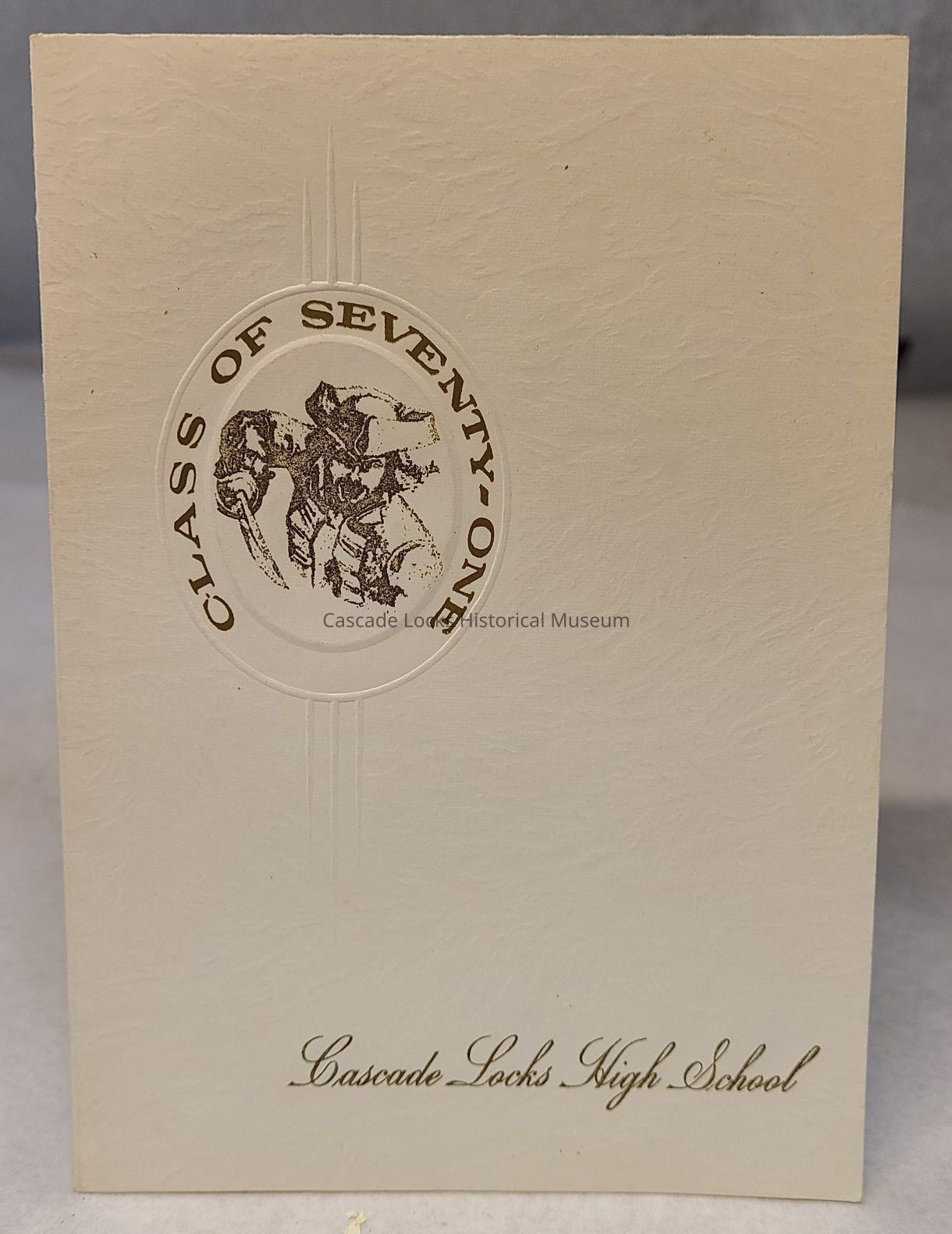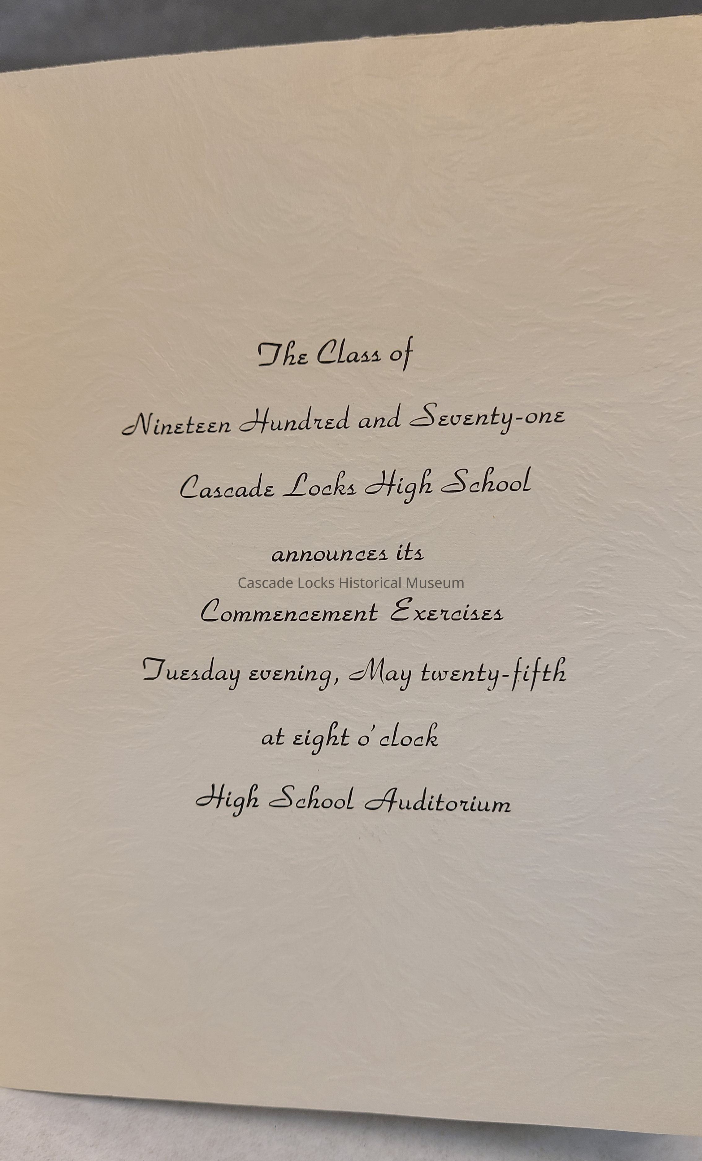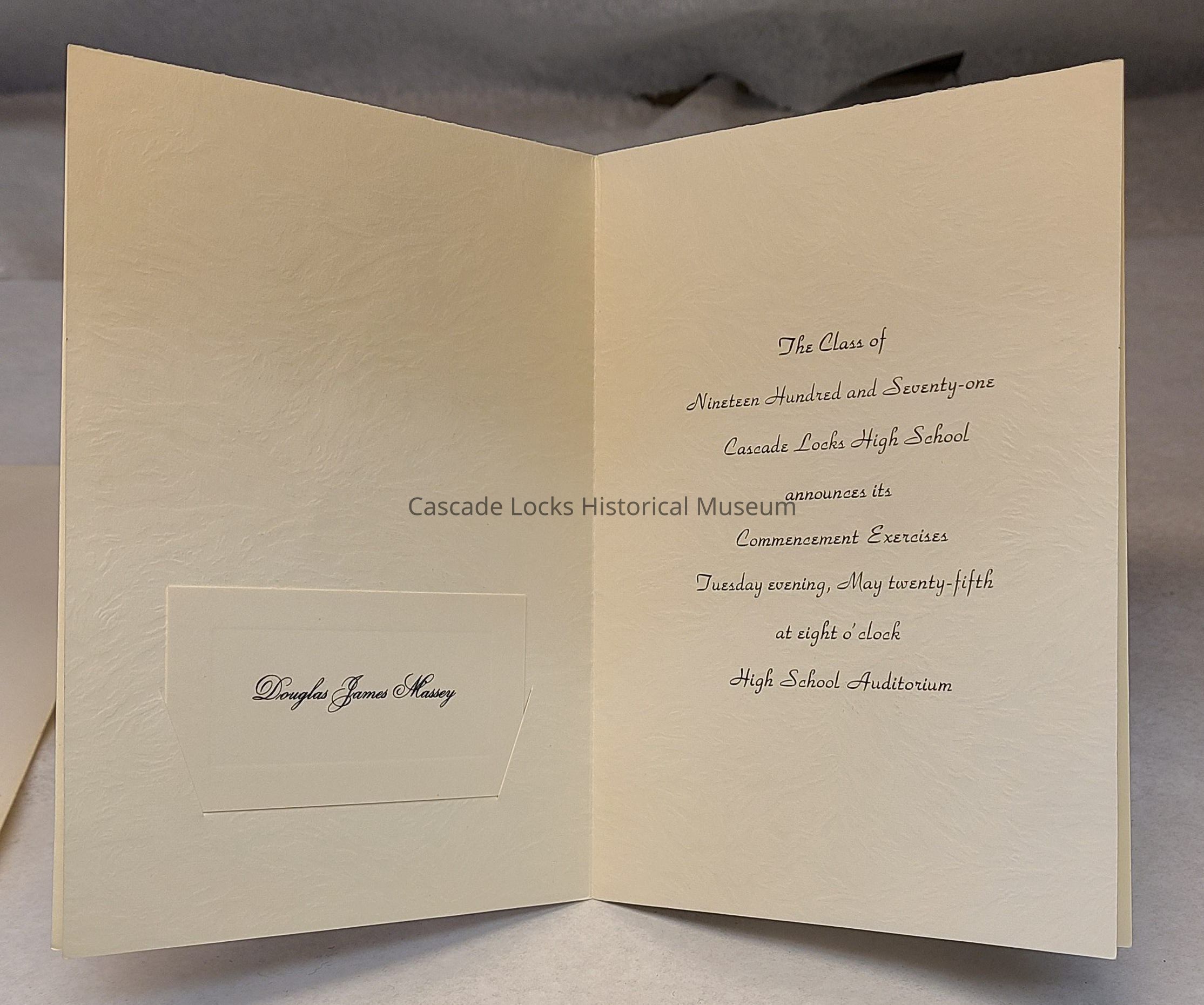 Graduation announcement for Douglas James Massey class of 1971. Card is white with gold details and font. Inside the card is black font that gives commencement information and the name of Douglas James Massey.