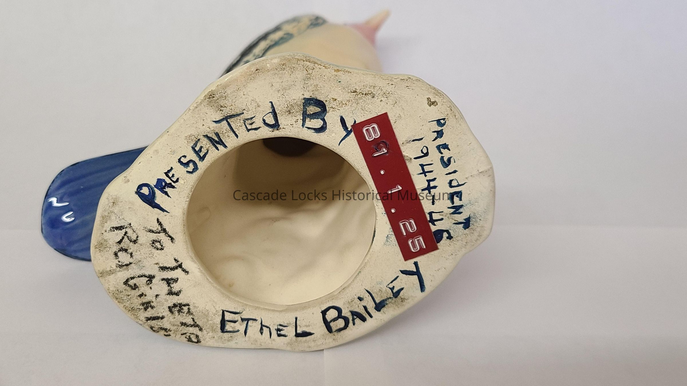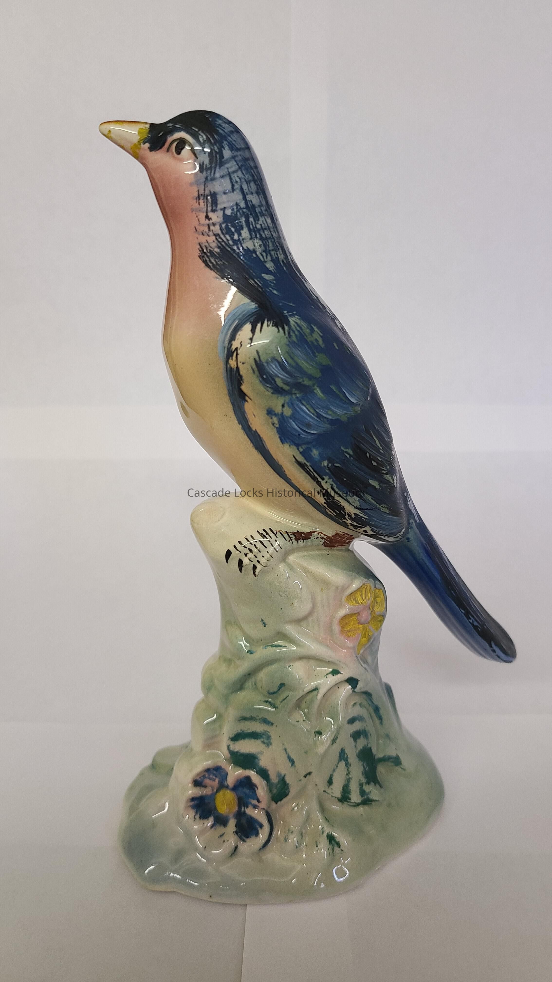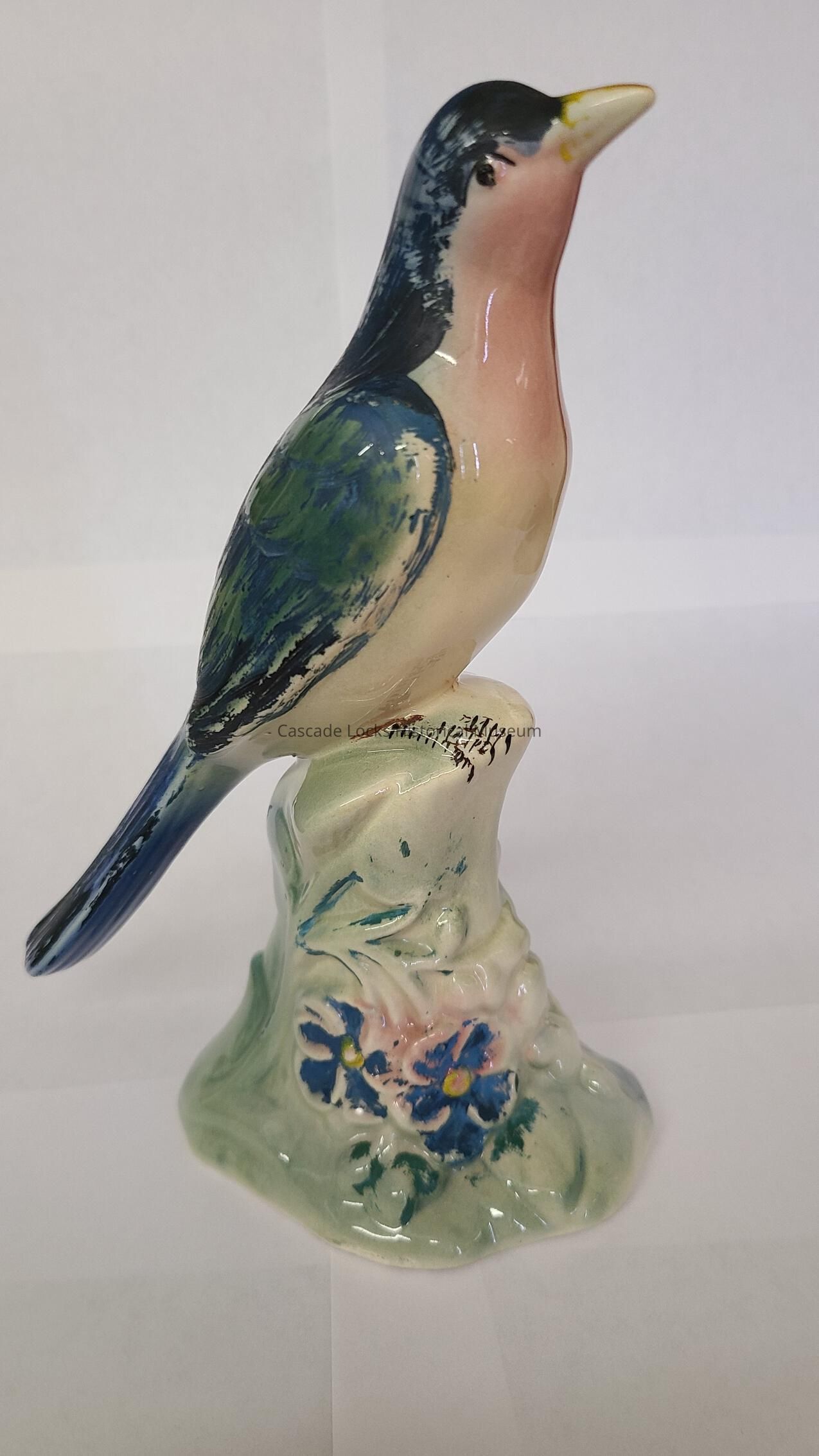 Ceramic with white base and glazed light blue, light green and pink. then paint is applied over the top of the glaze. painted blue bird with glazed green wings and under glaze of blue and painted yellow beak. Neck is glazed pink and chest is glazed green. Face and legs are painted with black and dark brown. Base is glazed light blue, light pink and light green. Flowers on base are painted blue with yellow centers and green leafs and yellow with no center coloring of the flower. On bottom someone wrote in blue paint and charcoal pencil.