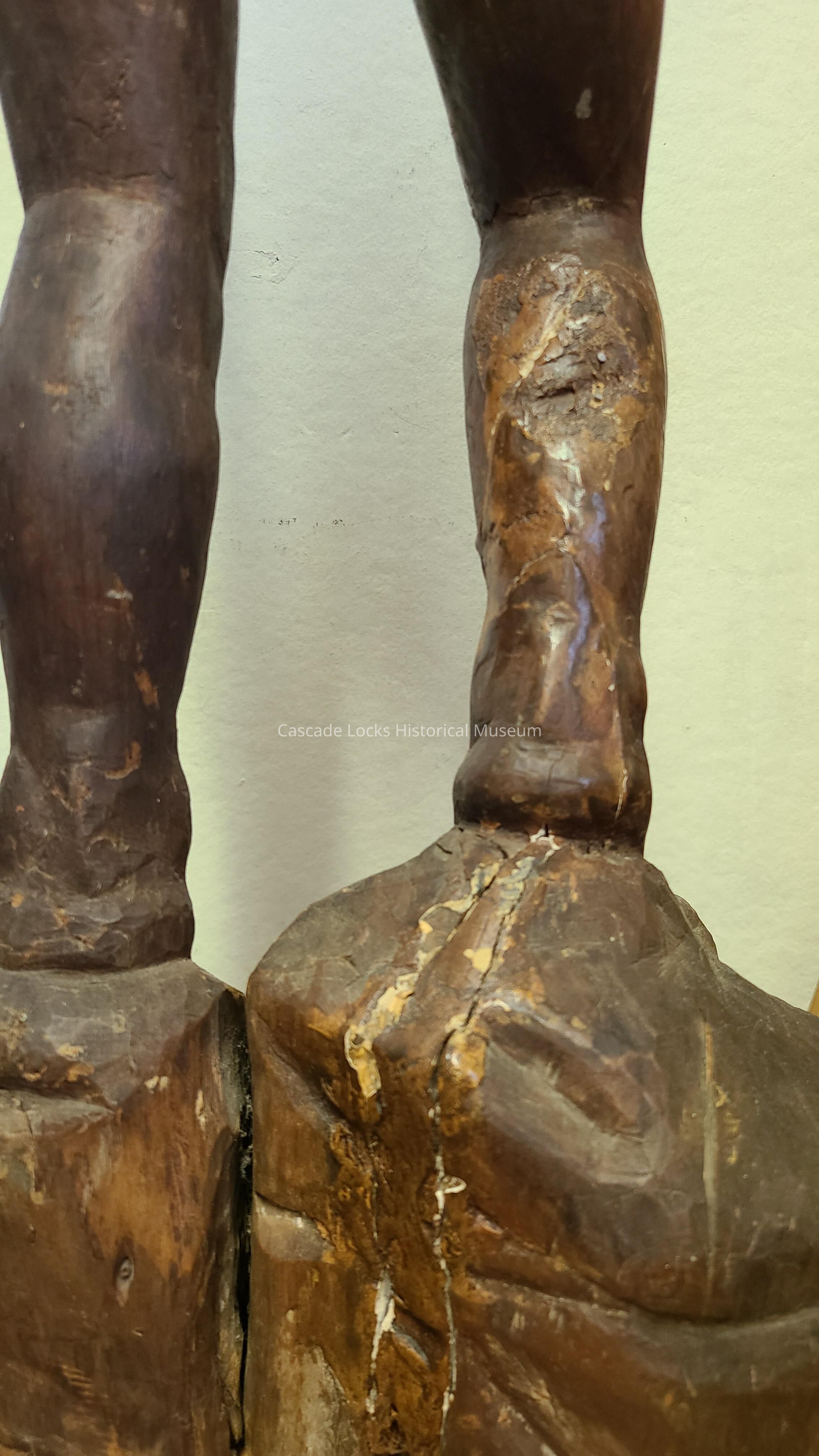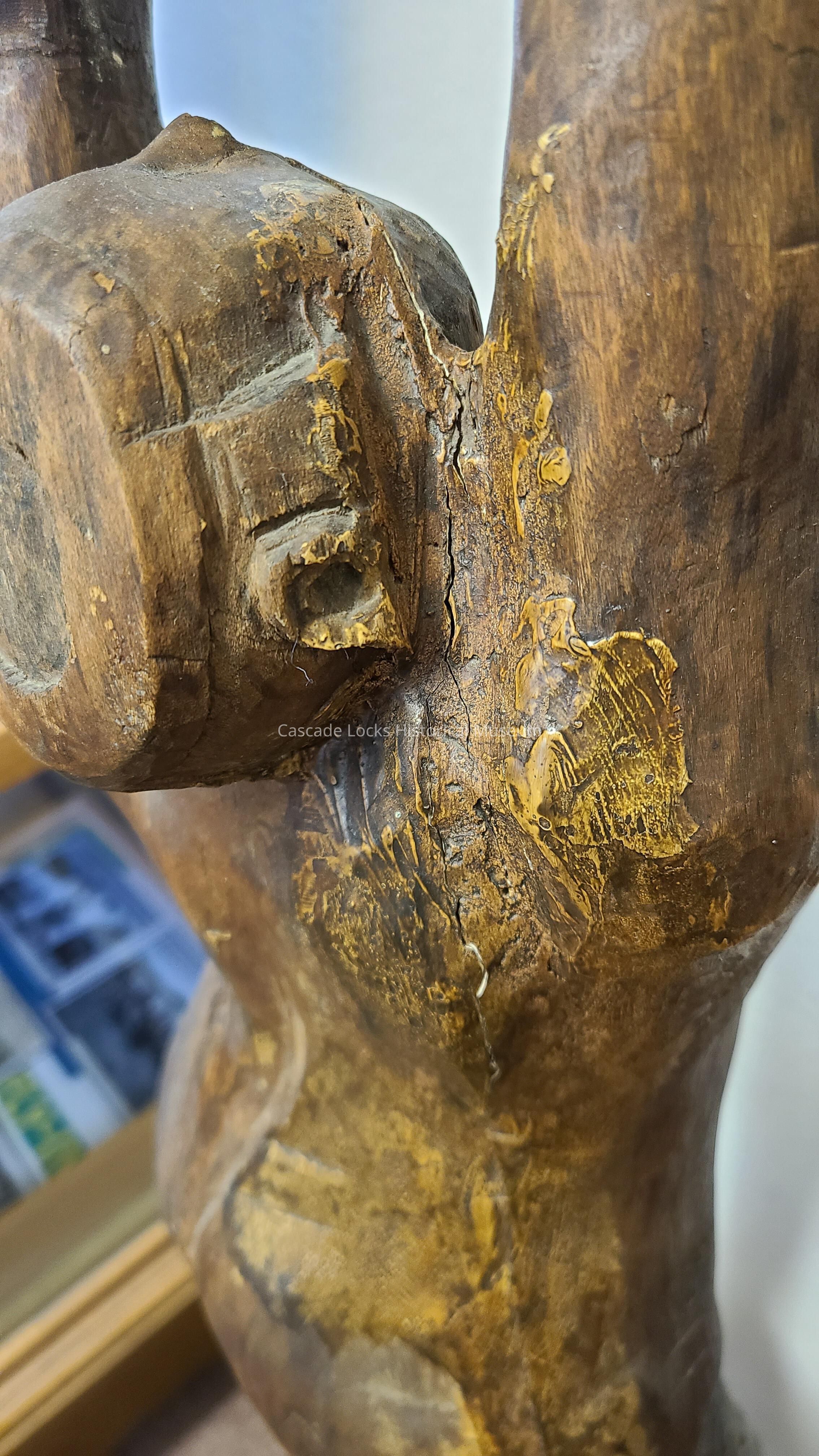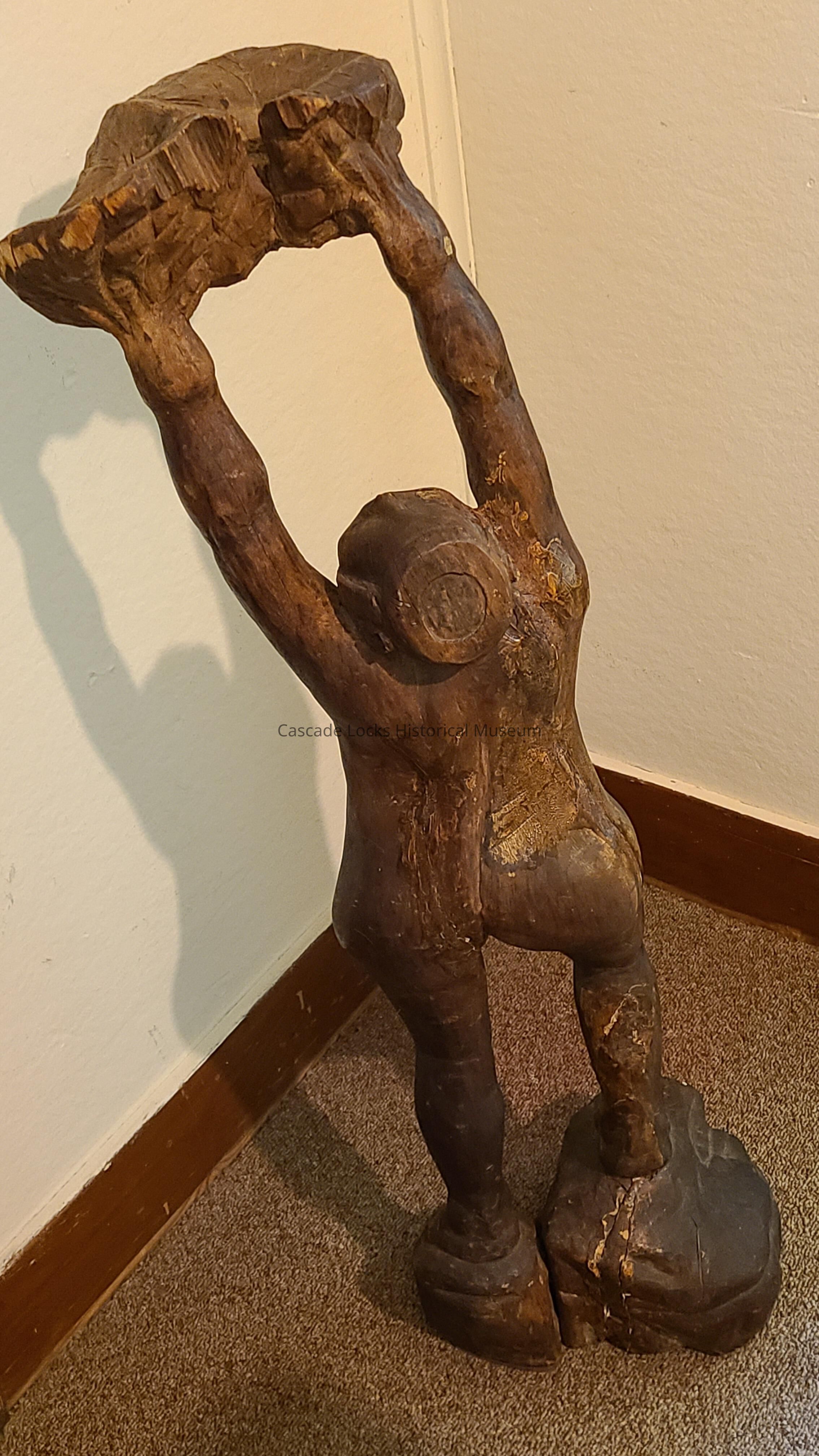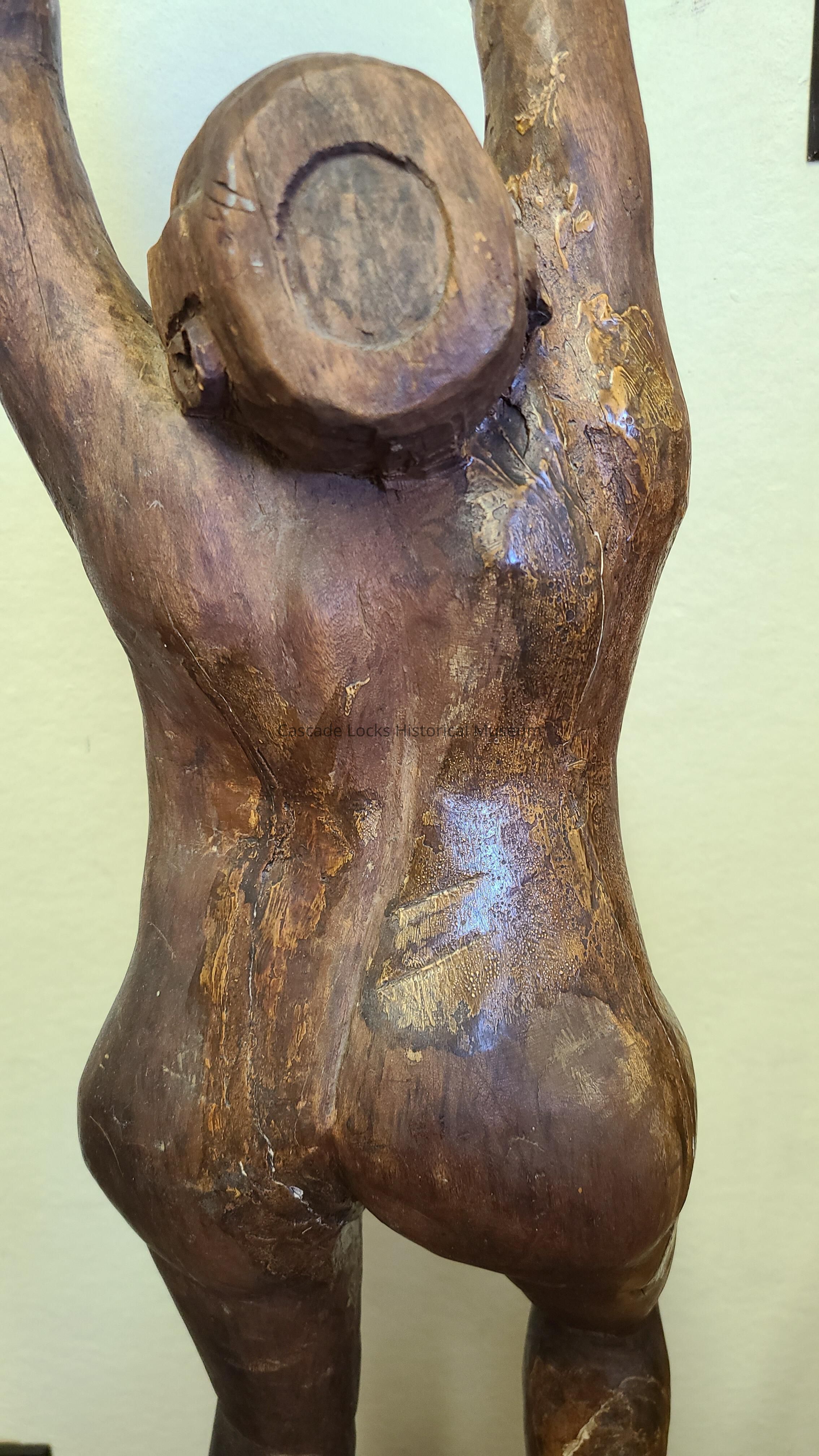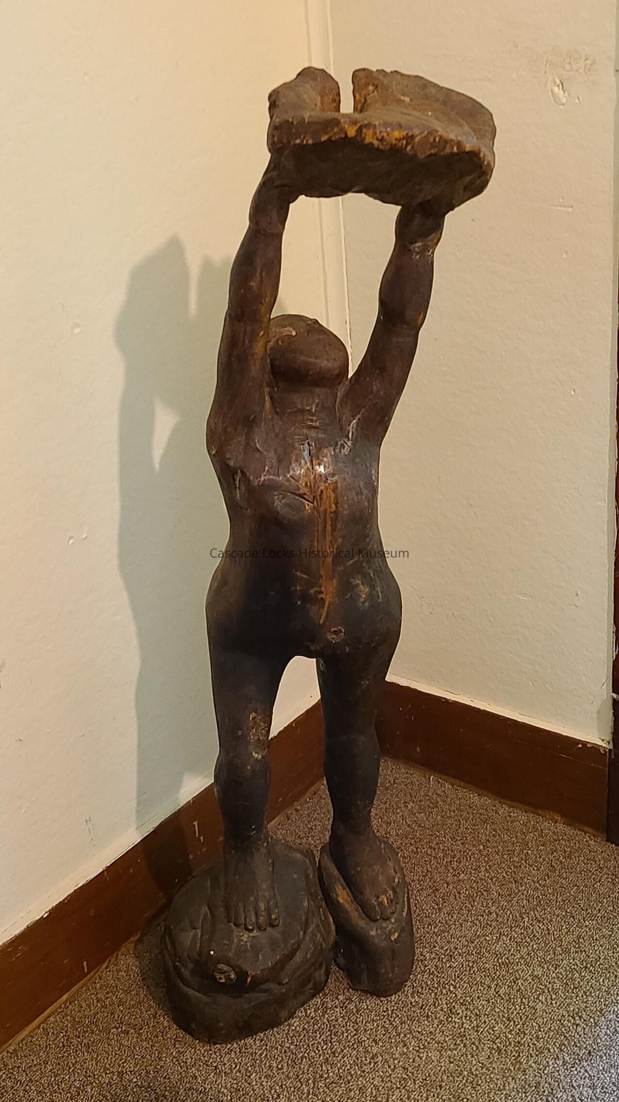 Statue of a person holding an object up to the sky made of a solid piece of wood. The statue is in a contrapposto stance meaning legs are apart and most weight resides on one leg. The head is facing the sky and appears to have a hat on.Lexicon