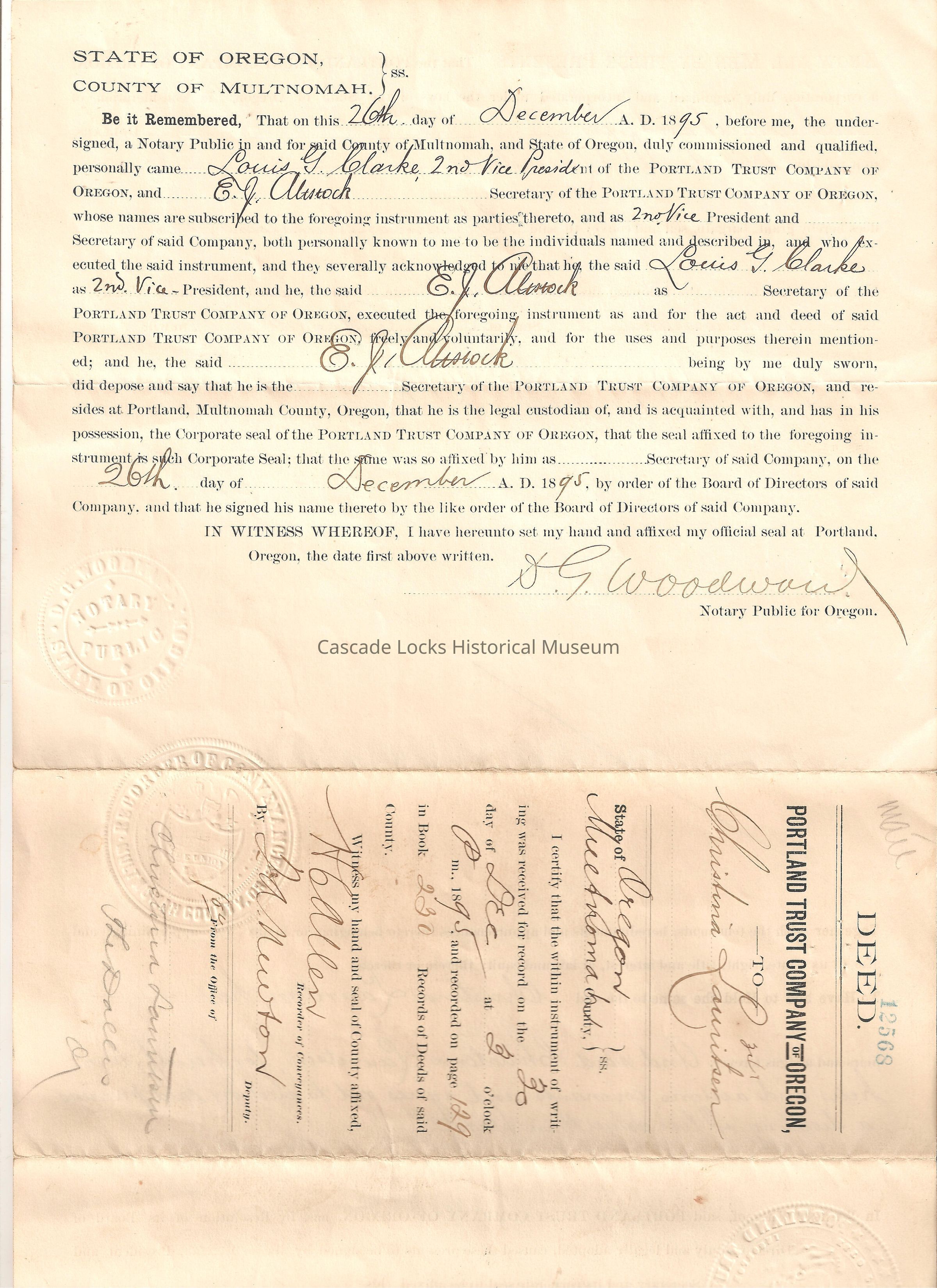 To be remembered. That on this day of December A.D. 1895, before me the undersigned, a Notary Public in and for said County of Multnomah, and State of Oregon, duly commissioned and qualified personally came Louis G. Clarke 2nd Vice President of the Portland Trust Company of Oregon whose names are subscribed to the forgoing instrument as parties thereto, and as 2nd Vice President and secretary of said company, both personally and known to me to be the individuals named and described in, and who executed the said instruments, and they severally acknowledged to me that he, the said Louis G. Clarke as 2nd Vice President, and he, the said E. J. Altstock as Secretary of the Portland Trust Company of Oregon, executed the foregoing instruments as and for the act and deed of said Portland Trust Company of Oregon, freely and voluntarily, and for the uses and purposes there in mentioned; and he, the said E. J. Altstock being by me duly sworn, did dispose and say that he is the ____ secretary of the Portland Trust Company, and resides at Portland, Multnomah County, Oregon, that he is the legal custodian of, and is acquainted with, and has in his possession, the corporate seal of the Portland Trust Company of Oregon, that the seal affixed to the foregoing instrument in such corporate seal; that the same was so affixed by names _____ secretary of the said company, on the 26th day of December A.D. 1895, by order of the Board of Directors of the said company. and that he signed his name thereto the like order of the Board of Directors of said company, in witness whereof, I have hereunto set my hand and affixed my official seal at Portland, Oregon, the date first above written. D. G. Woodward Notary Public for Oregon.