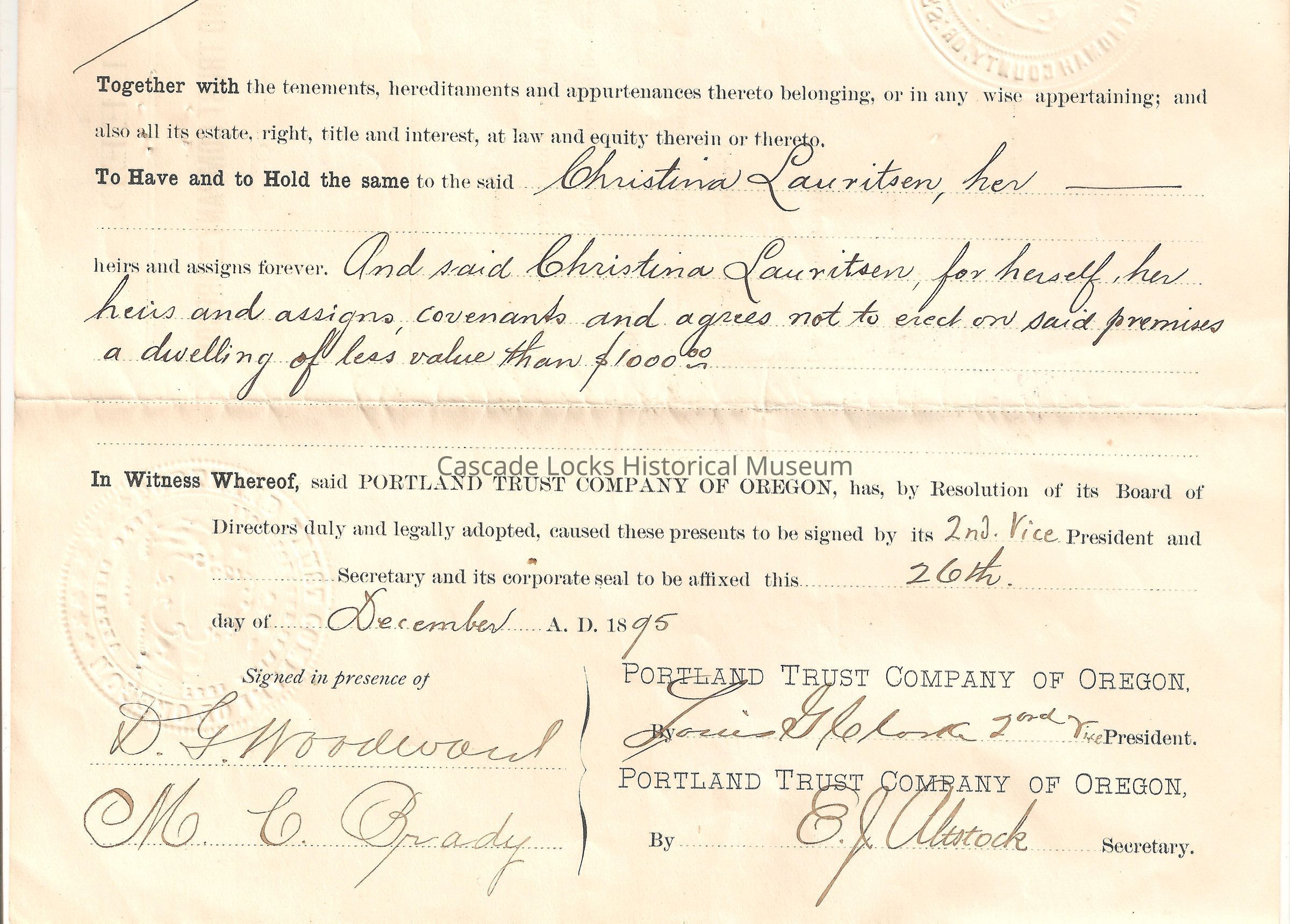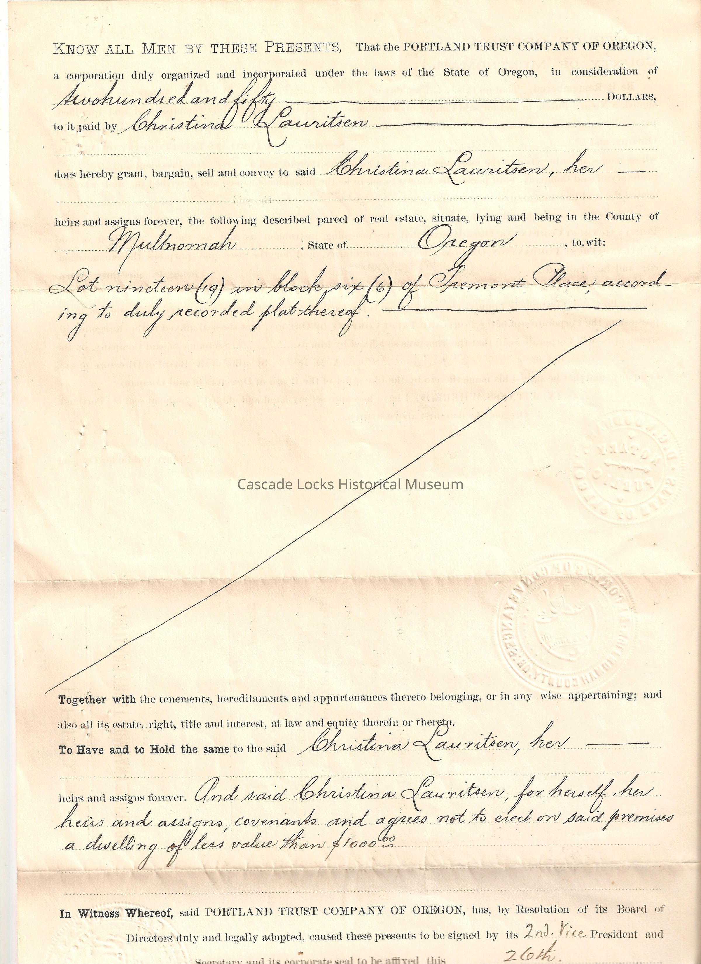 Know all men by these presents, that the Portland Trust Company of Oregon, a corporation duly organized and incorporated under the laws of the State of Oregon, in consideration at Two Hundred and Fifty Dollars to it paid by Christina Laurtsen, her heirs and assign forever, the following, described parcel of Real Estate, lying and being in the County of Multnomah, State of Oregon, to wit: Lot nineteen (19) in Block six (6) of Fremont Place according to duly recorded plot thereof together with tenements, hereditaments and appurtenances there to belonging , orin any wise appertaining; and also its estate , right, title and interest, at law and equality therein or thereto. To have and to hold the same to the said Christina Laurtsen her heirs and assigns forever. And said Christina Laurtsen, for herself, her heirs and assigns, covenants and agrees not to each on said premise a dwelling of less value than $1000.00. In witness whereof , said Portland Trust Company of Oregon, has by, resolution of its Board of Directors duly and legally adopted, caused these presents to be signed by its 2nd vice President and secretary and its corporate seal to be affixed this 26th day of December A.D. 1895.