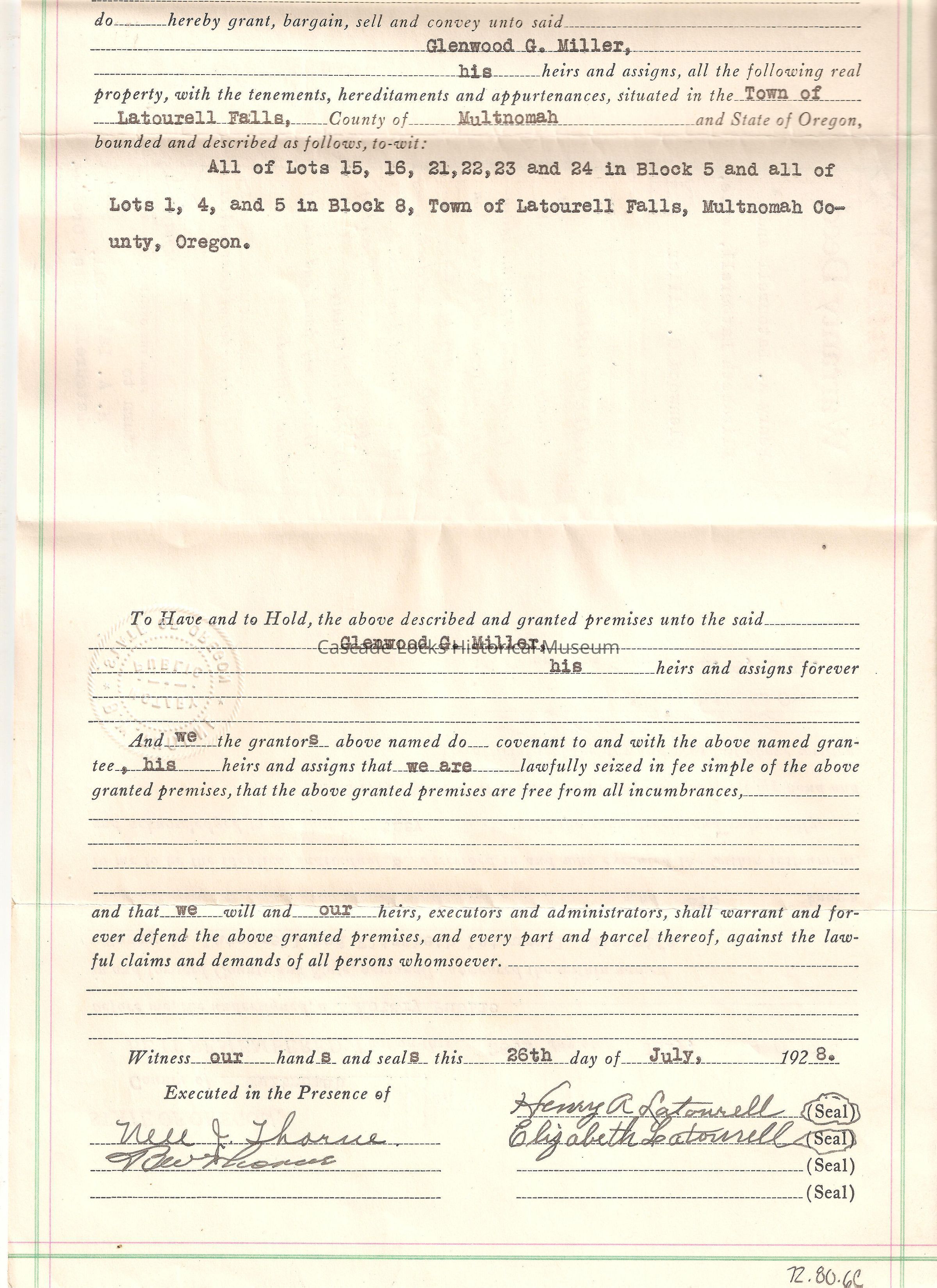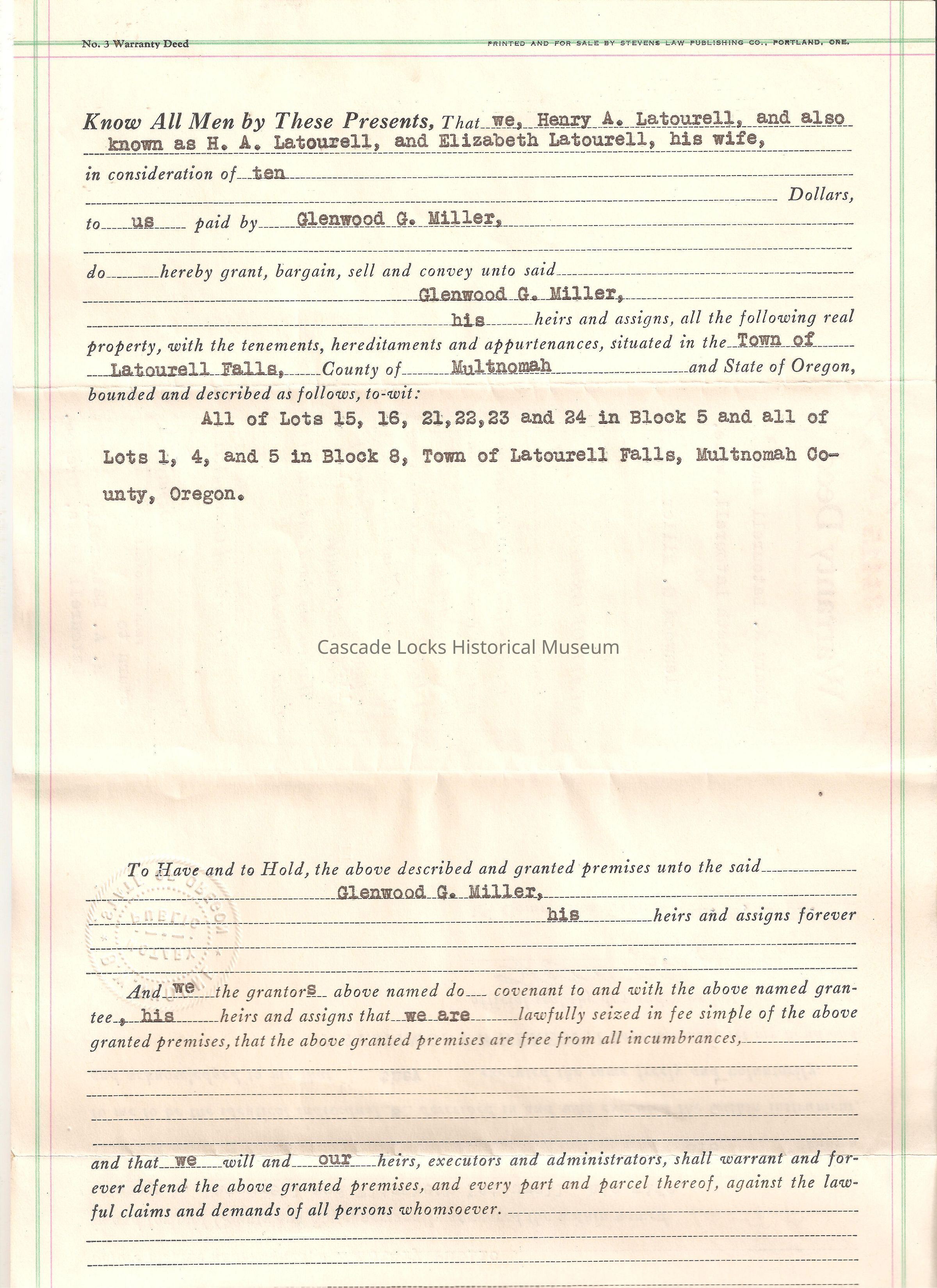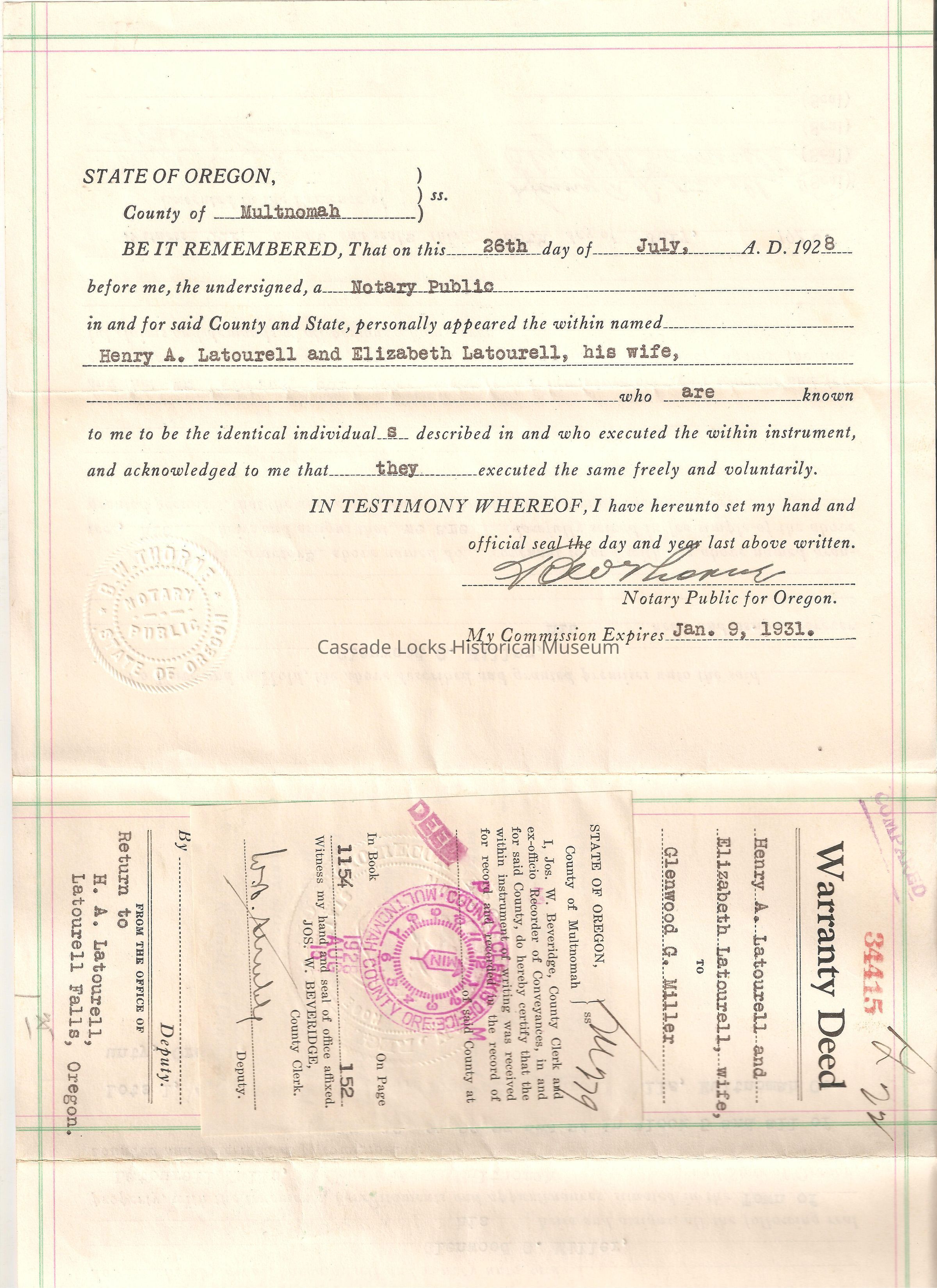 Compared 34415 Warranty Deed. H. A. Latourell and Elizabeth Latourell, wife, to Glenwood G. Miller. State of Oregon County of Multnomah }SS I, Jos. W. Beveridge, County Clerk and ex- officio recorder of conveyance in and for said county, do hereby certify that the within instrument of writing was received for record and recorded in the record of ( Multnomah County Stamp,, Aug 15, 1928) of said county at In Book 1154 on page 152 witness my hand and seal of office affixed. Jos. W. beveridge County Clerk. W. A. Shubly Deputy by __ Deputy. From the office of return to H. A. Latourell, Latourell Falls, Oregon.