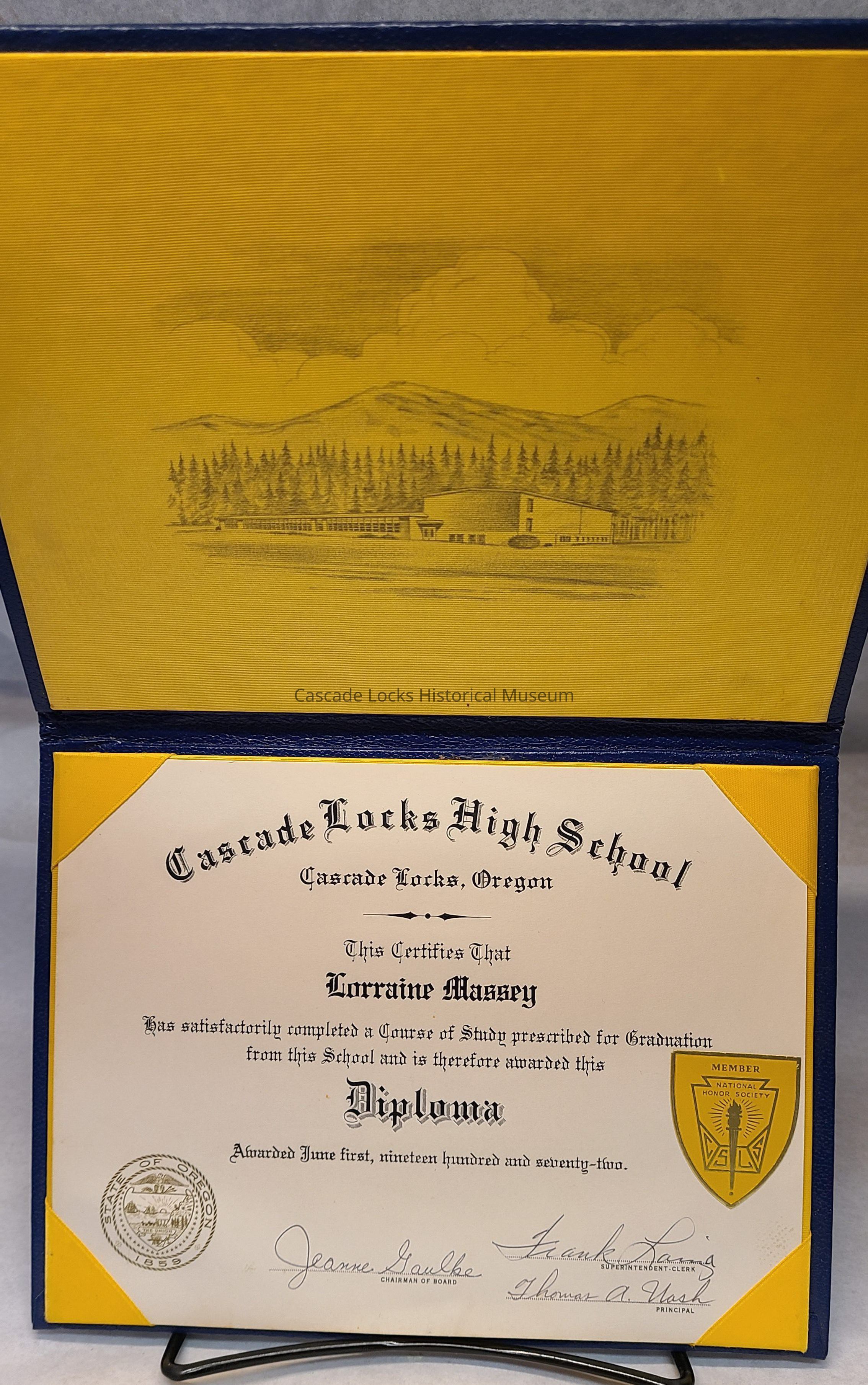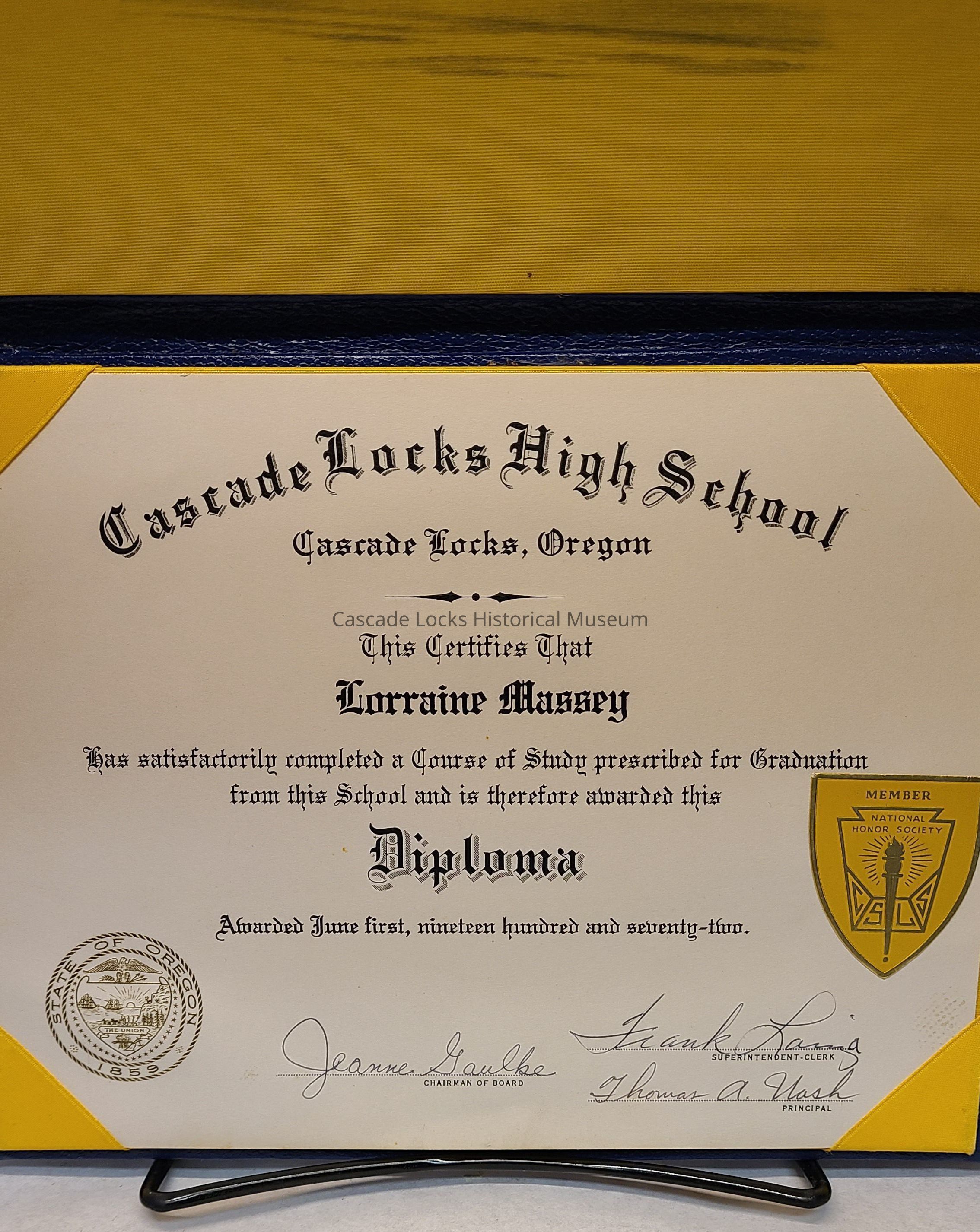 Document reads, "Cascade Locks High School, Cascade Locks Oregon. This certifies that Lorraine Massey has satisfactory completed a course of study prescribed for Graduation from this school and is therefore awarded this Diploma. Awarded June first, nineteen hundred and seventy-two. (Signed) Chairman of Board, Superintendent-Clerk, Principle.