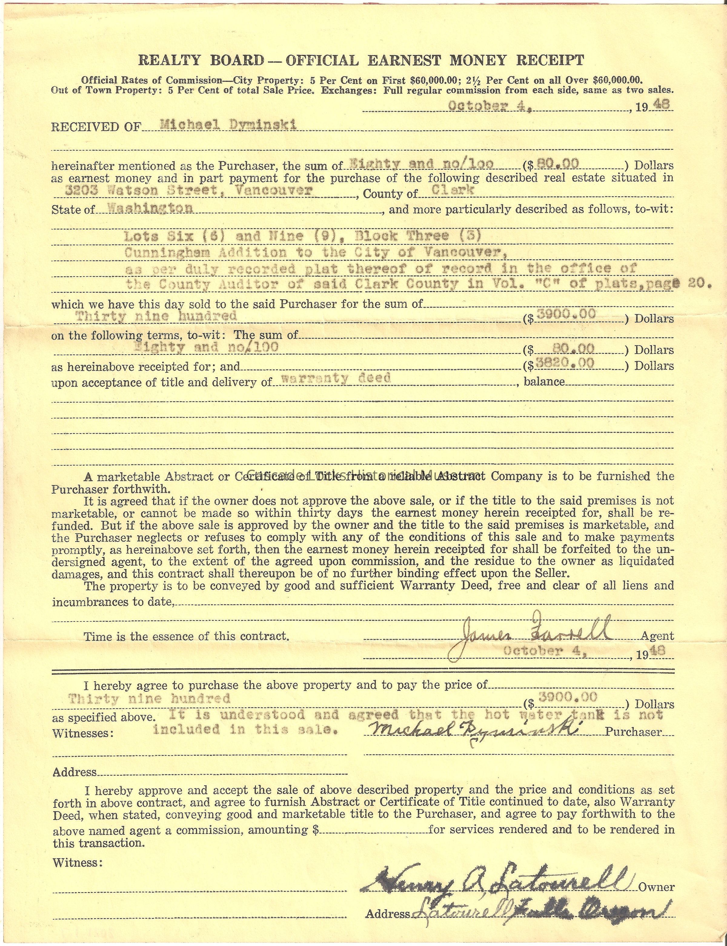 October 4, 1948. Received of Michael Dyminski hereinafter mentioned as the purchaser, the sum of Eighty and no over 100 ($80.00) dollars as earnest money and in part payment for the purchase of the following described real estate situated in 3203 Watson Street, Vancouver, County of Clark, State of Washington, and more particularly described as follows, to-wit: