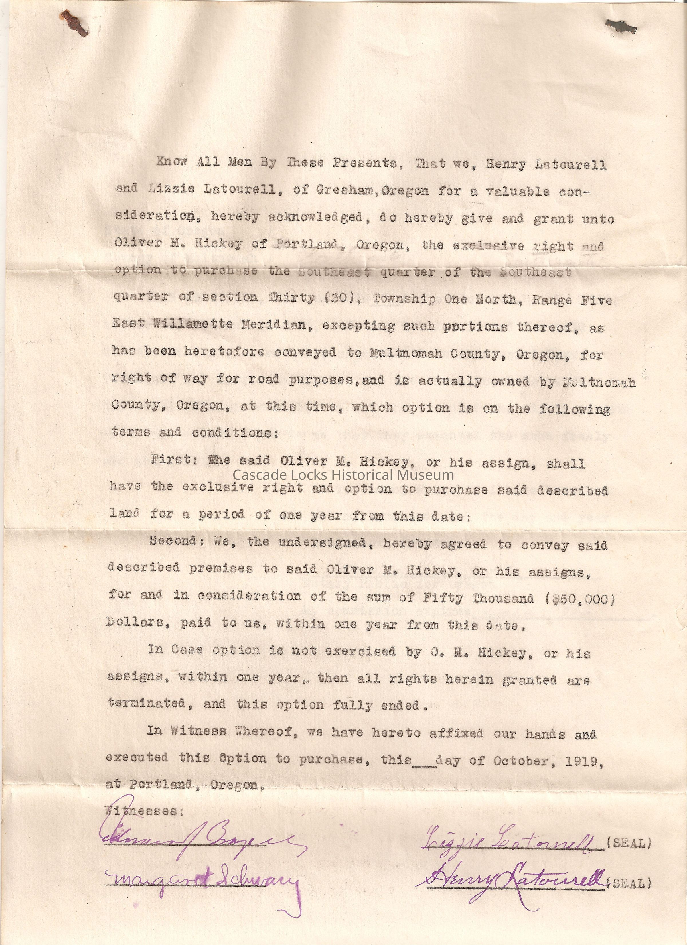 Know all men by these presents, that we, Henry Latourell and Lizzie Latourell, of Gresham, Oregon for a valuable consideration, hereby acknowledged, do hereby give and grant unto Oliver M. Hickey of Portland, Oregon, the exclusive right and option to purchase the southeast quater of the southeast corner of section thirty (30), Township One North, Range Five East Willimatte Meridian, excepting such portions thereof, as has been heretofore conveyed to Multnomah County, Oregon, for right of way for road purposes, and is actually owned by Multnomah County, Oregon, at this time, which option is on the following terms and conditions,