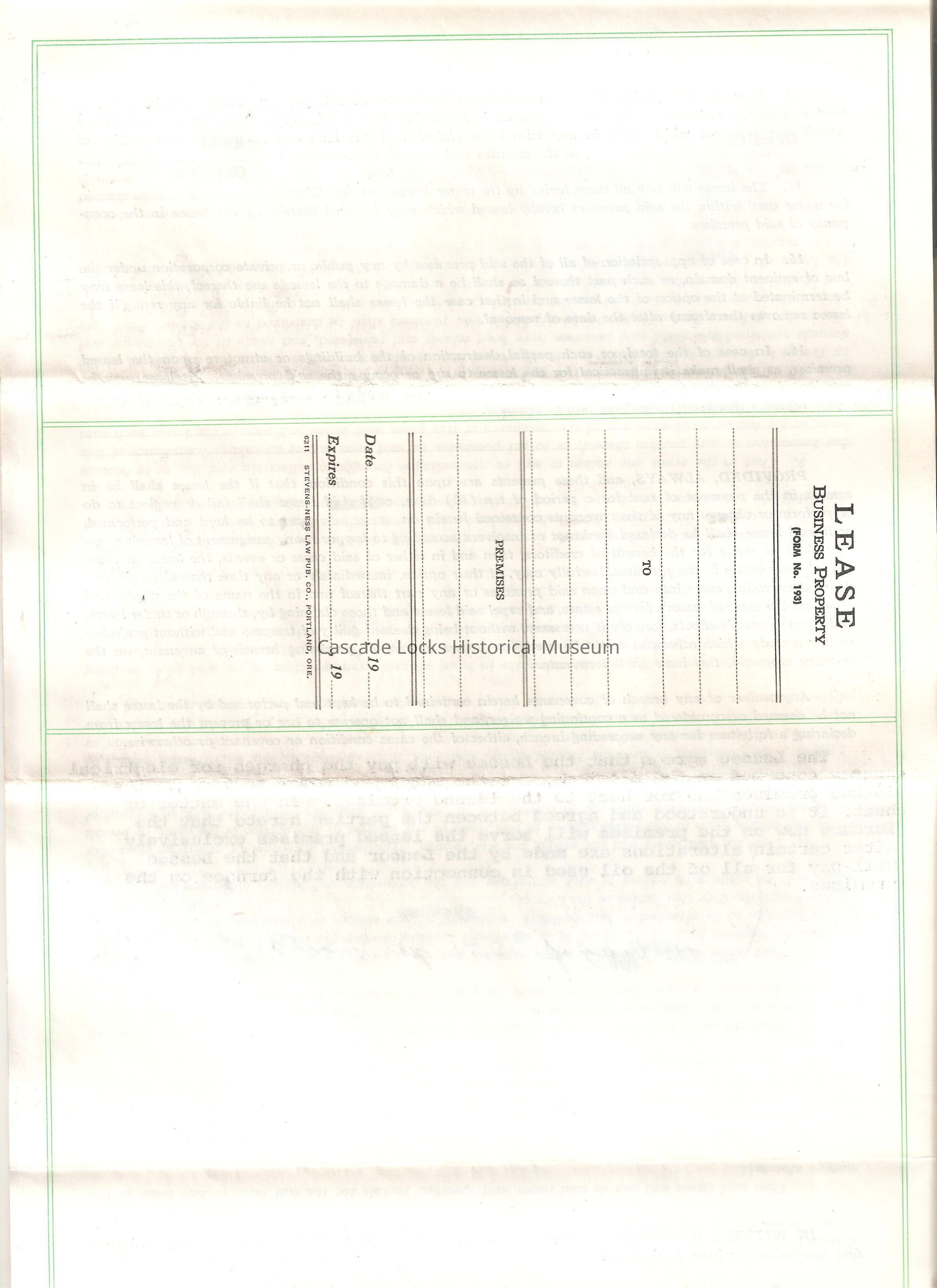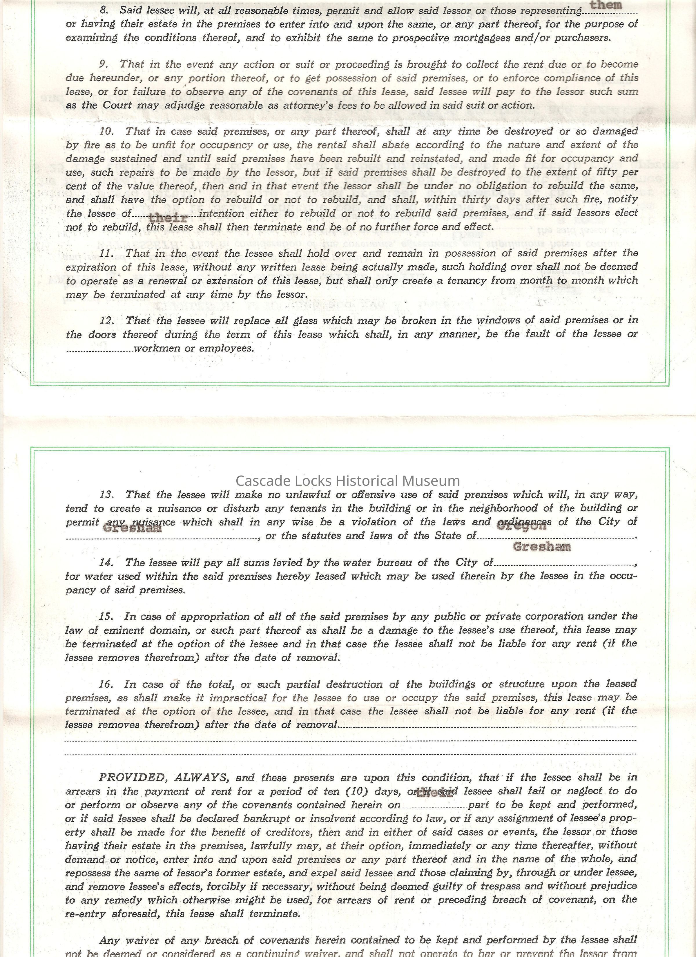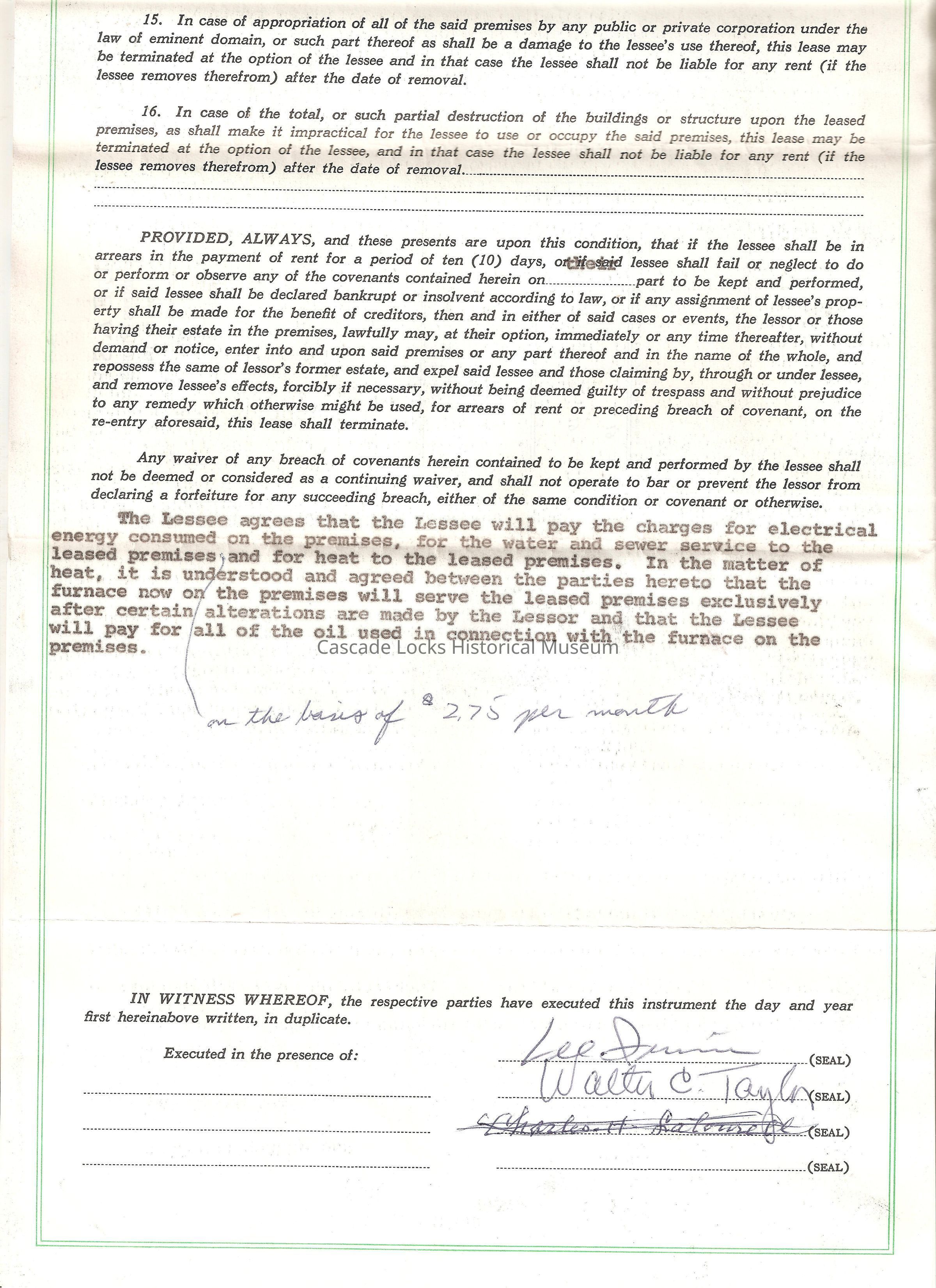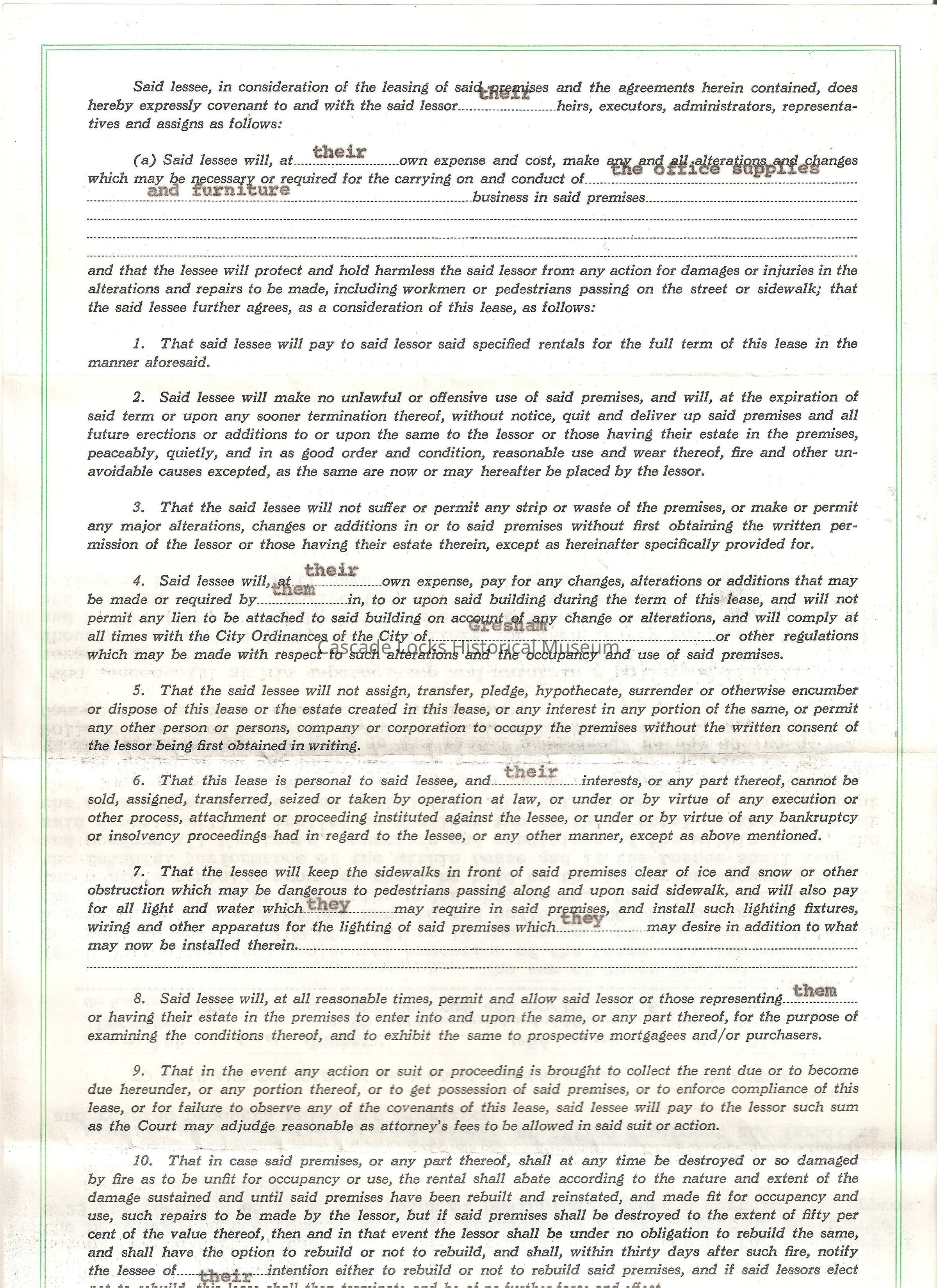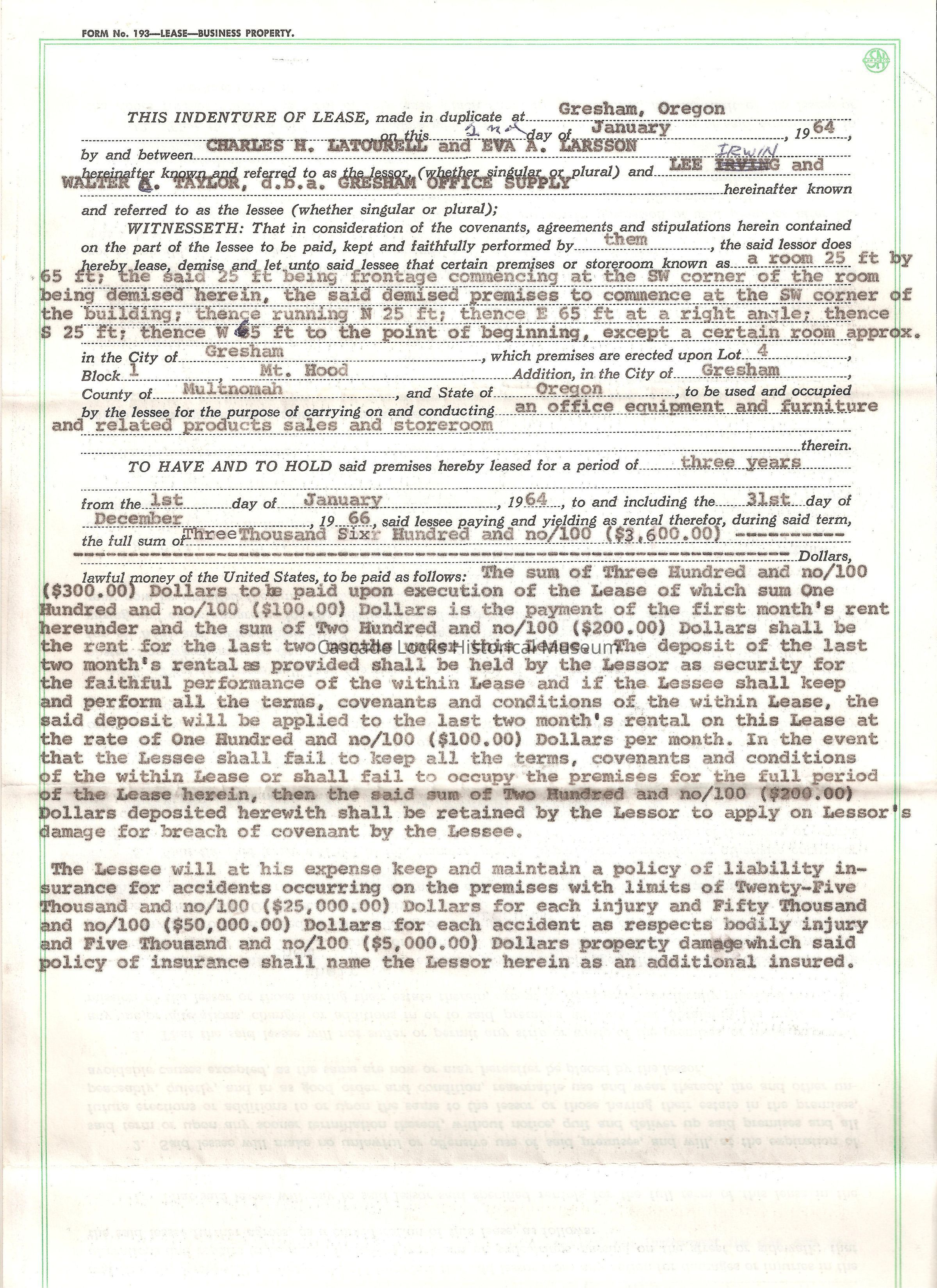 Jan 2, 1964. Lease between Charles H. Latourell/ Eva A. Larson and Walter Taylor. Storeroom in lot 4, Block 1, Mt. Hood, City of Gresham, County of Multnomah, State of Oregon. Used for an office equipment and furniture and related products sales and storeroom. Lease period 3 years from Jan 1st 1964 to Dec 1966 in the full sum of $3,600.00.Lexicon