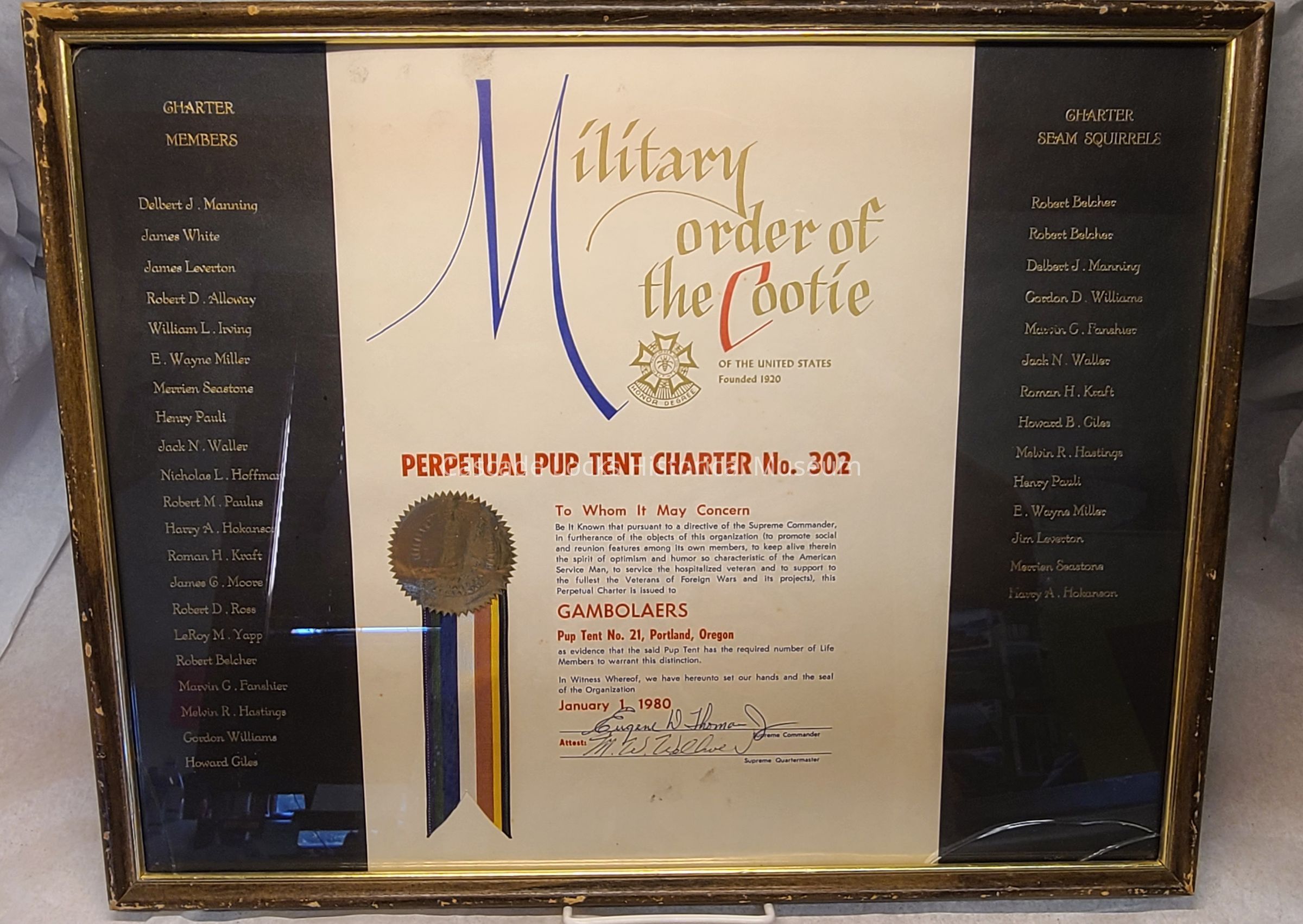 The document reads, "Military Order of the Cootie of the United States founded 1920. Perpetual pup tent charter No. 302. To whom it may concern. Be it known that pursuant to a directive of the Supreme Commander, in furtherance of the objects of this organization (to promote social and reunion features among its own members, to keep alive therein the spirit of optimism and humor so characteristic of the American Service Man, to service the hospitalized veteran and to support to the fullest the Veterans of Foreign Wars and its projects), this Perpetual Charter is issued to Gambolaers Pup Tent No. 21, Portland, Oregon, as evidence that the said Pup Tent has required number of Life Members to warrant this distinction. In Witness Whereof, we have hereunto set our hands and the seal of this Organization January 1, 1980 (Signed) Eugene W. Thomas J, Supreme Commander, Attest (Signed) M. W. Weller Supreme Quartermaster.