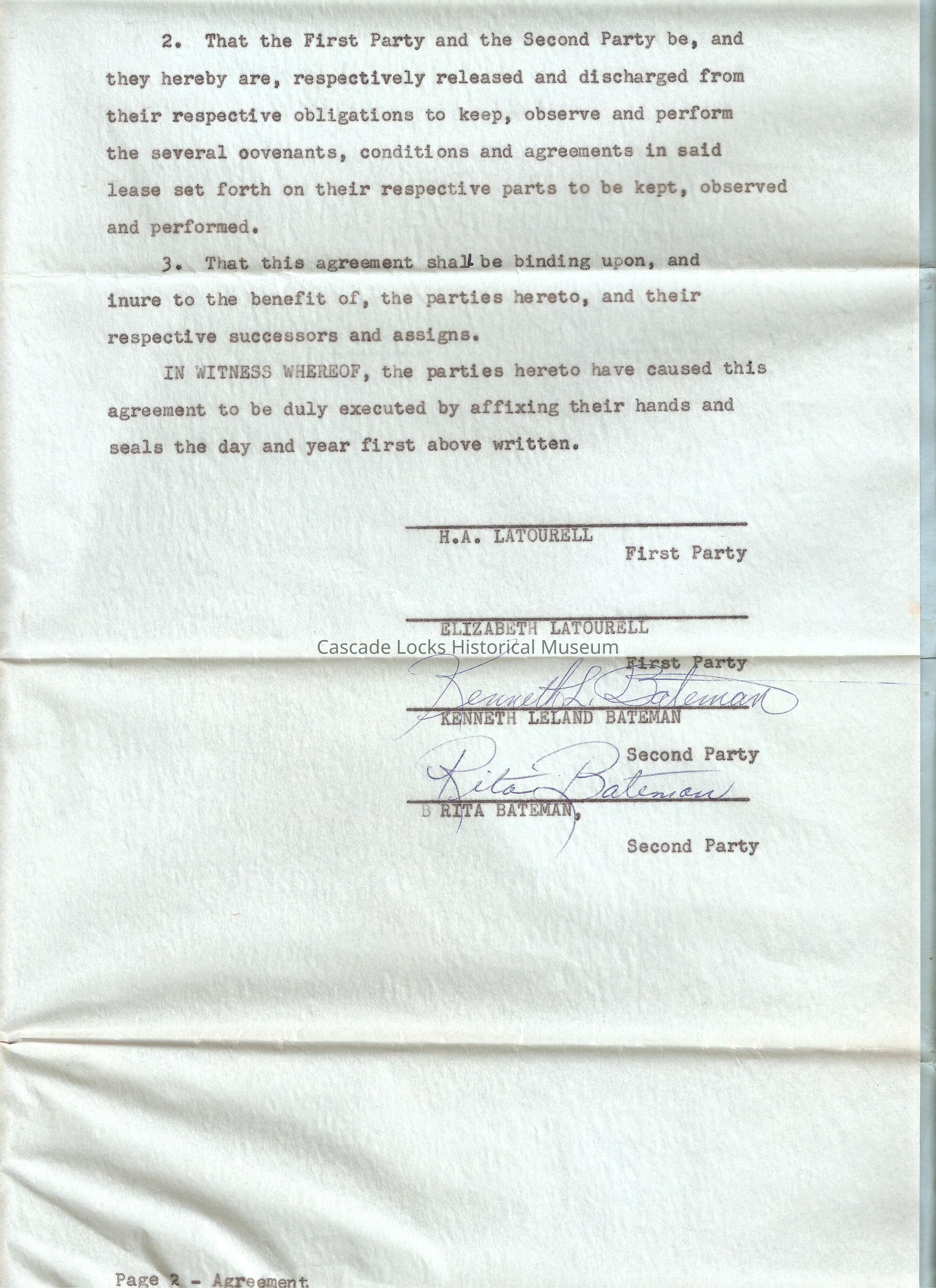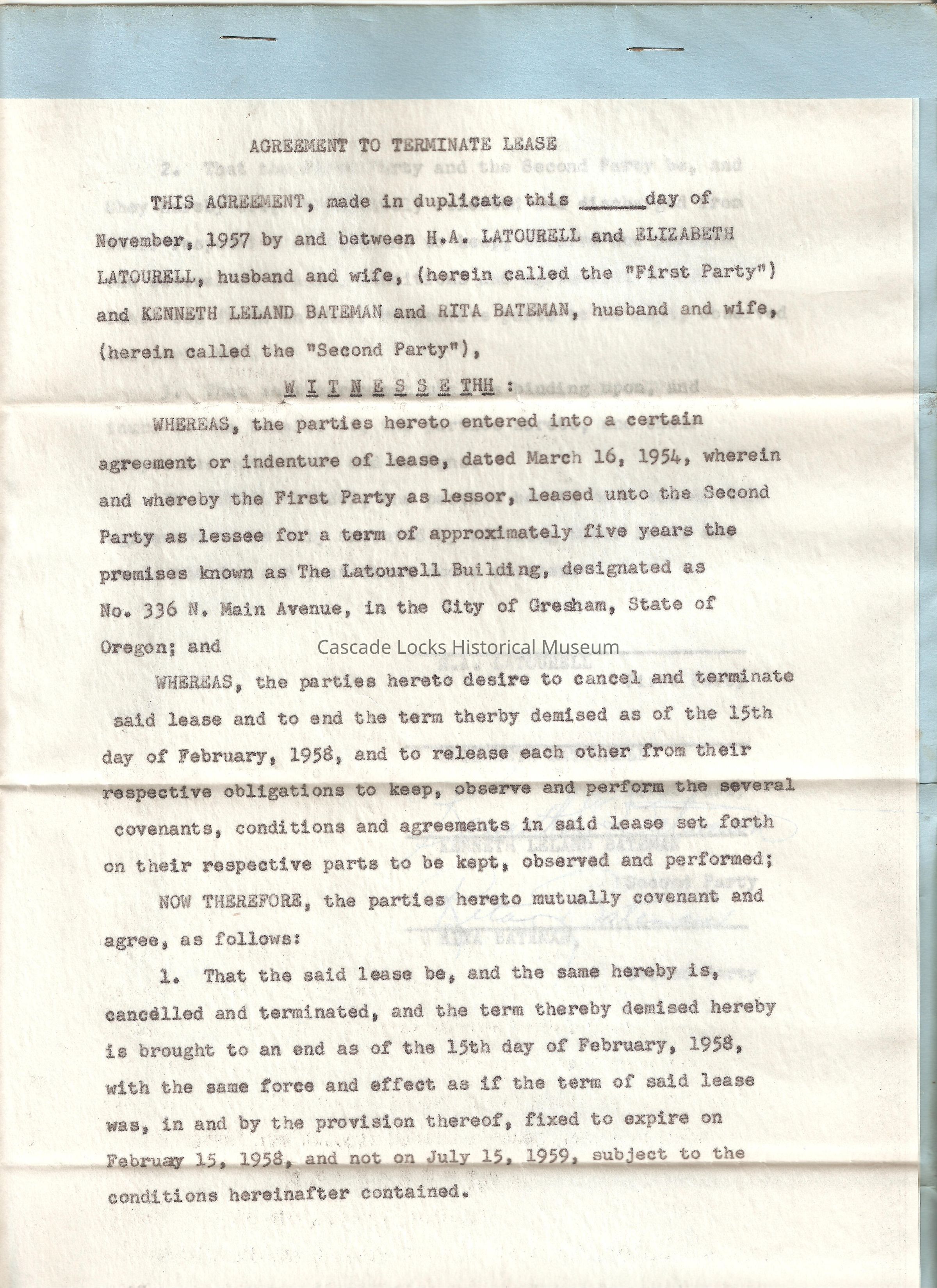 This agreement, made in dupliacte this __ day of November, 1957 by and between H. A. Latourell and Elizabeth, Husband and Wife, (herein called the "First Party") and kenneth LeLand Bateman and Rita Bateman, Husband and Wife, (herein called the "Second Party.")