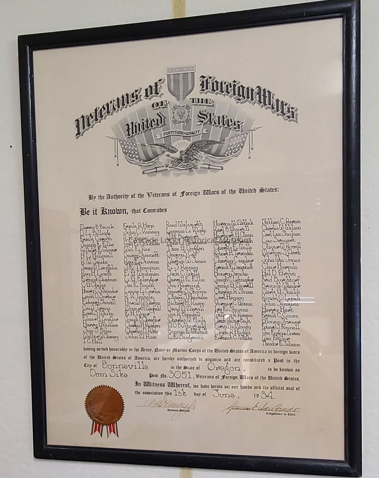 having served honorably in the Army, Navy, or Maine Corps of the United States of America in foreign wars of the United States of America, are hereby authorized to organized and are constituted a Post in the City of Bonneville in the State of Oregon, to be known as Damsite Post No. 3051, Veterans of Foreign Wars of the United States. In Witness Whereof, we have here unto set our hands and the official seal of the association this 1st day of June, 1934. (Signed) R. B. Haudy H., Adjutant General. (Signed) Commander in Chief."Lexicon