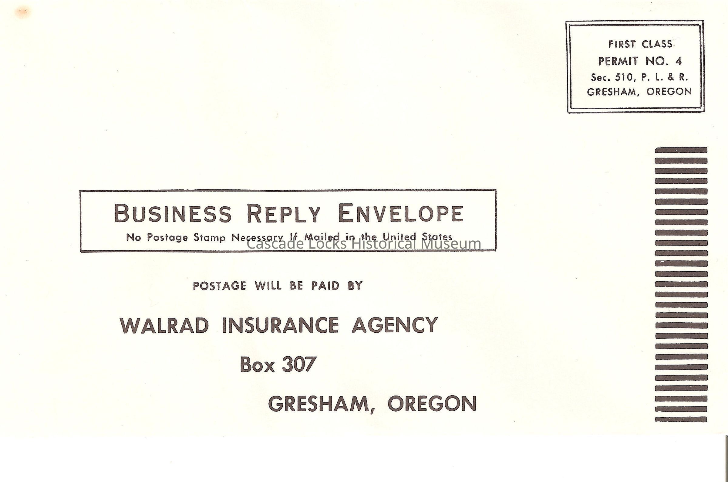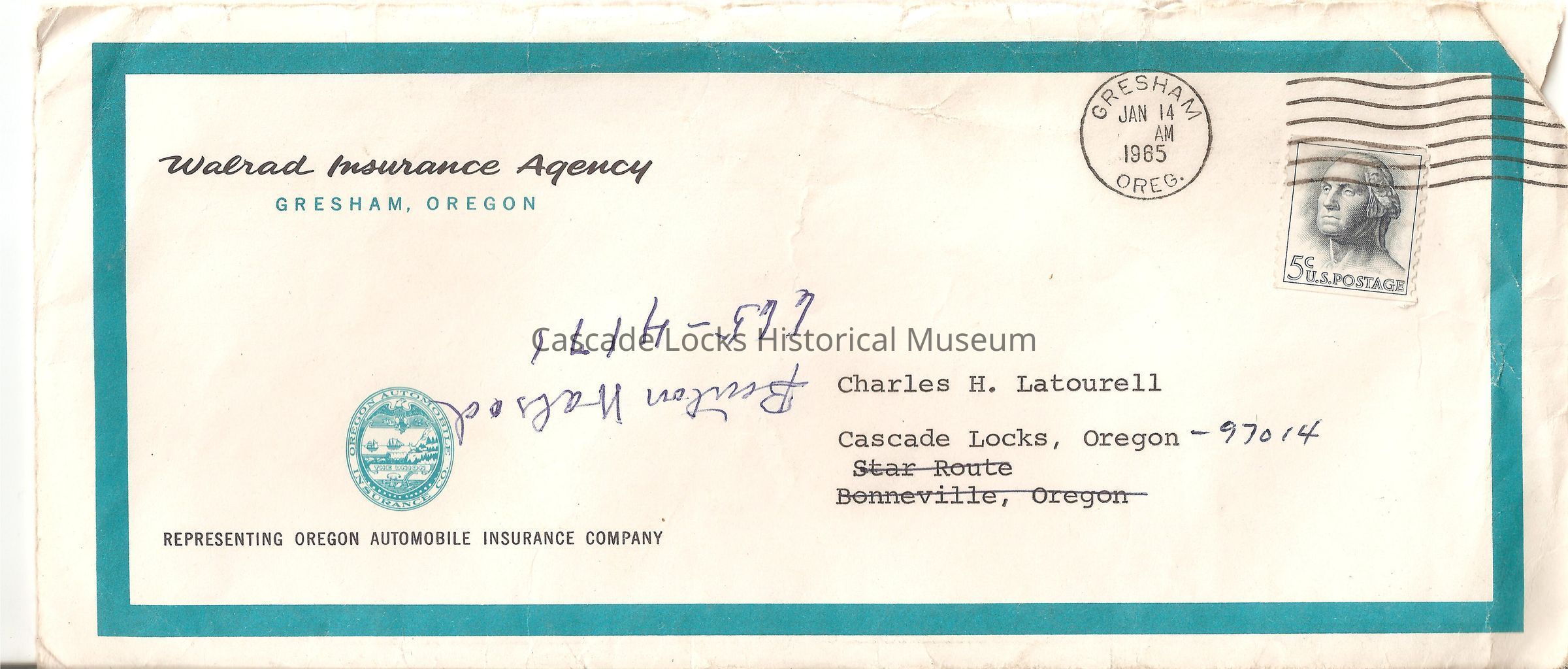 Charles H. Latourell. Cascade Locks, Oregon. 97014. Star Route, Bonneville, Oregon. Walrad Insurance Agency. Gresham, Oregon. Representing Oregon Automobile Insurance Company. Gresham Oreg. Jan 14, 1965 AM. Benton Walrad 665-4171. Bonneville Oreg. Jan 14, 1965 pm.