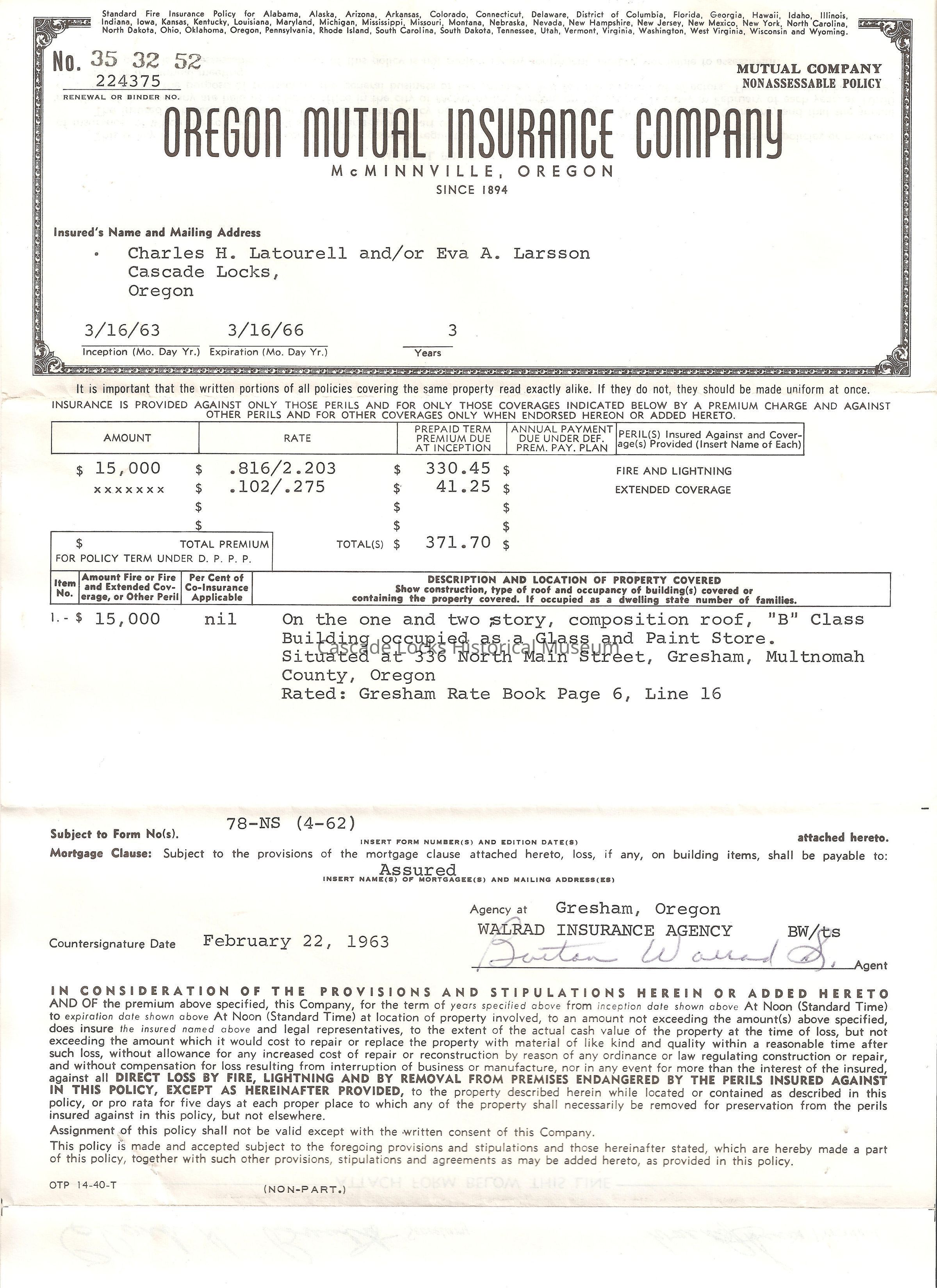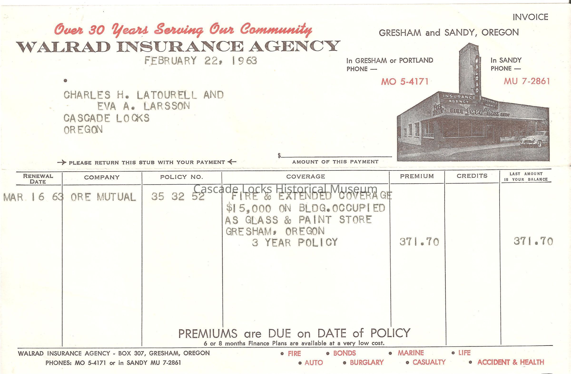 Summary of document. Document reads- Walrad Insurance Agency. February 22, 1963. (To) Charles H. Latourell and Eva A. Larson. Cascade Locks, Oregon. Renewal Date Mar 16, 1963. Company Ore Mutual. Policy No. 35 32 52. Coverage Fire & Extended coverage $15,000 on BLDG. Occupied as Glass & Paint Store. Gresham, Oregon. 3 Year Policy. Premium $371.70. Credits 0. Last amount is your balance 371.70.