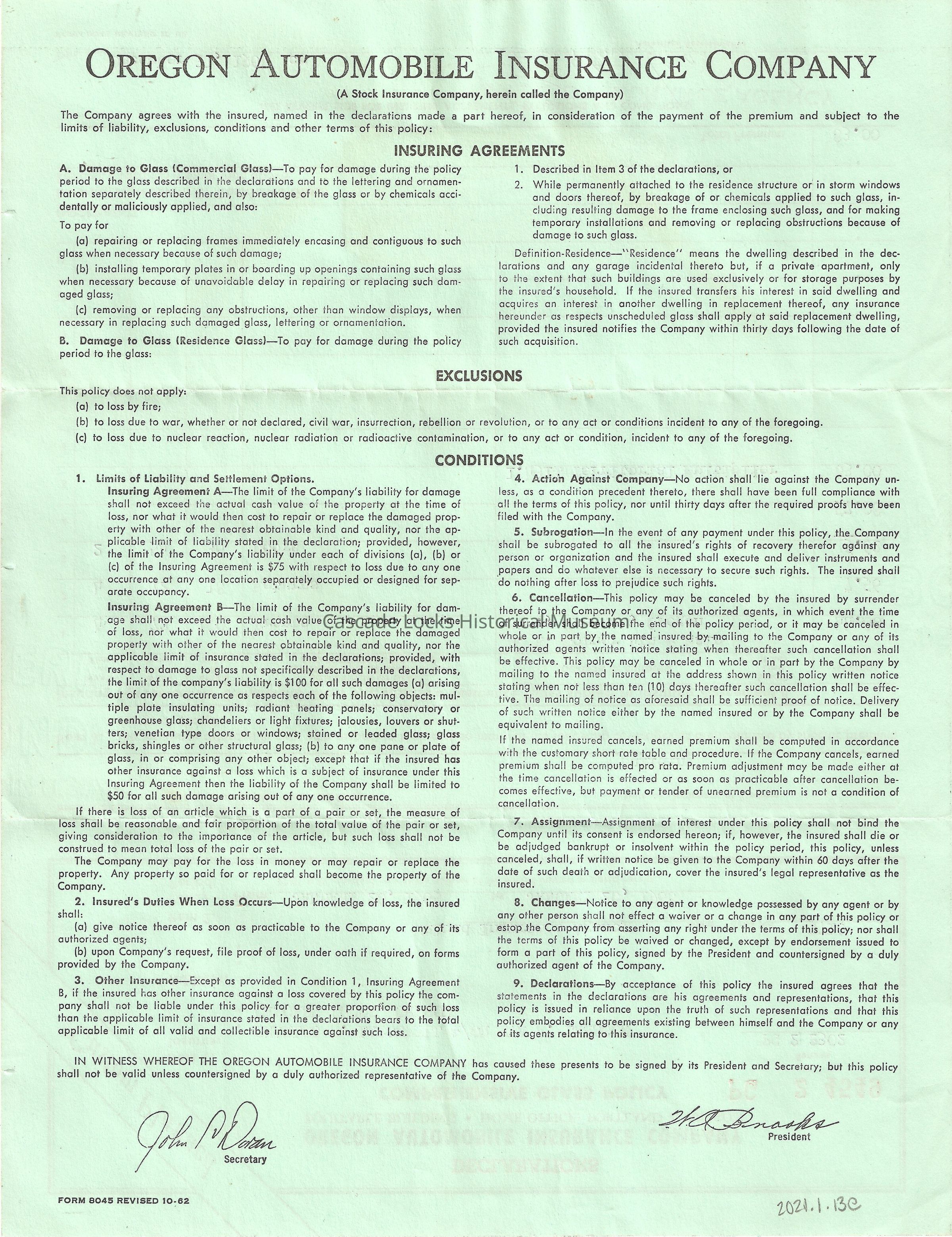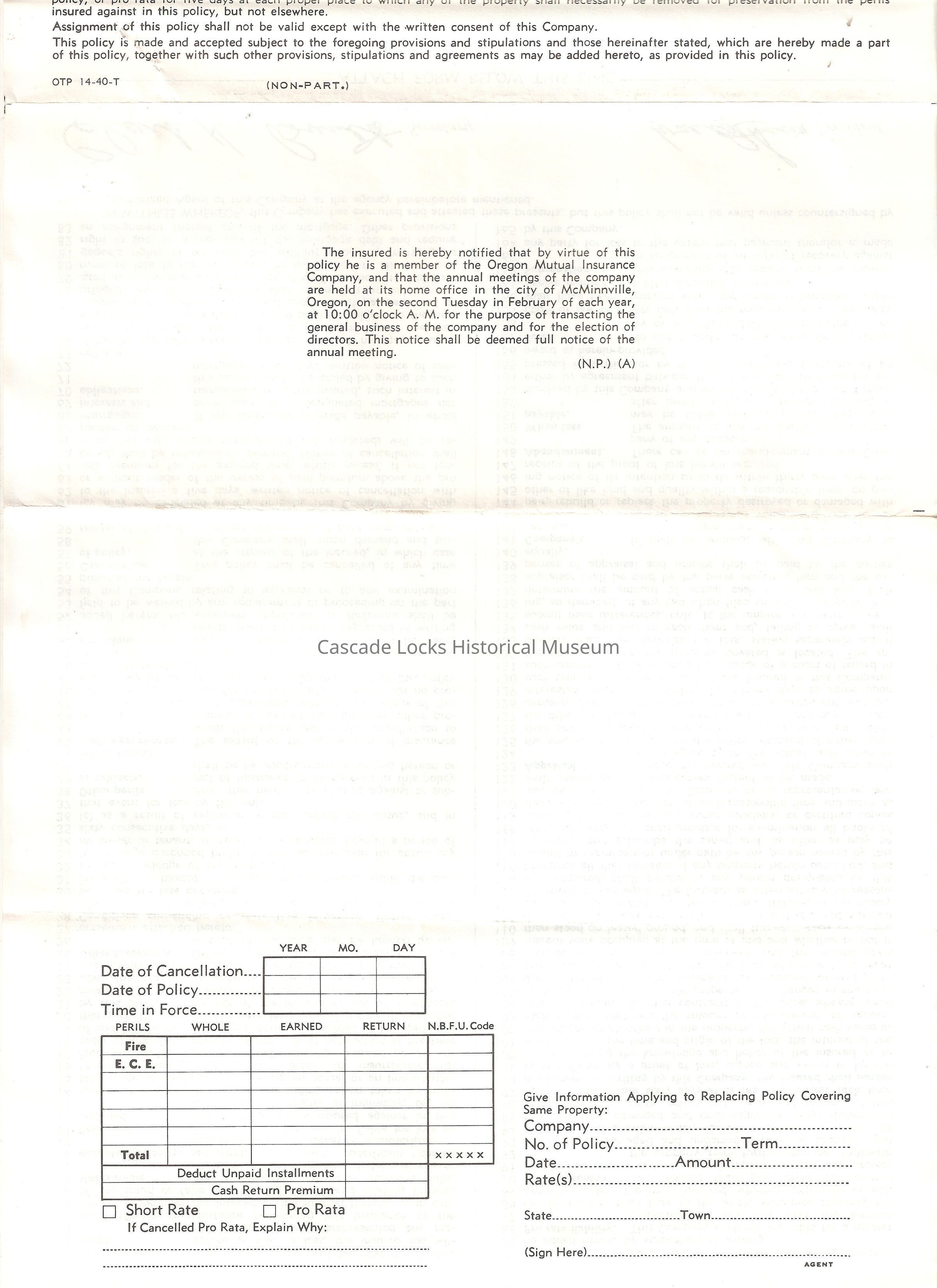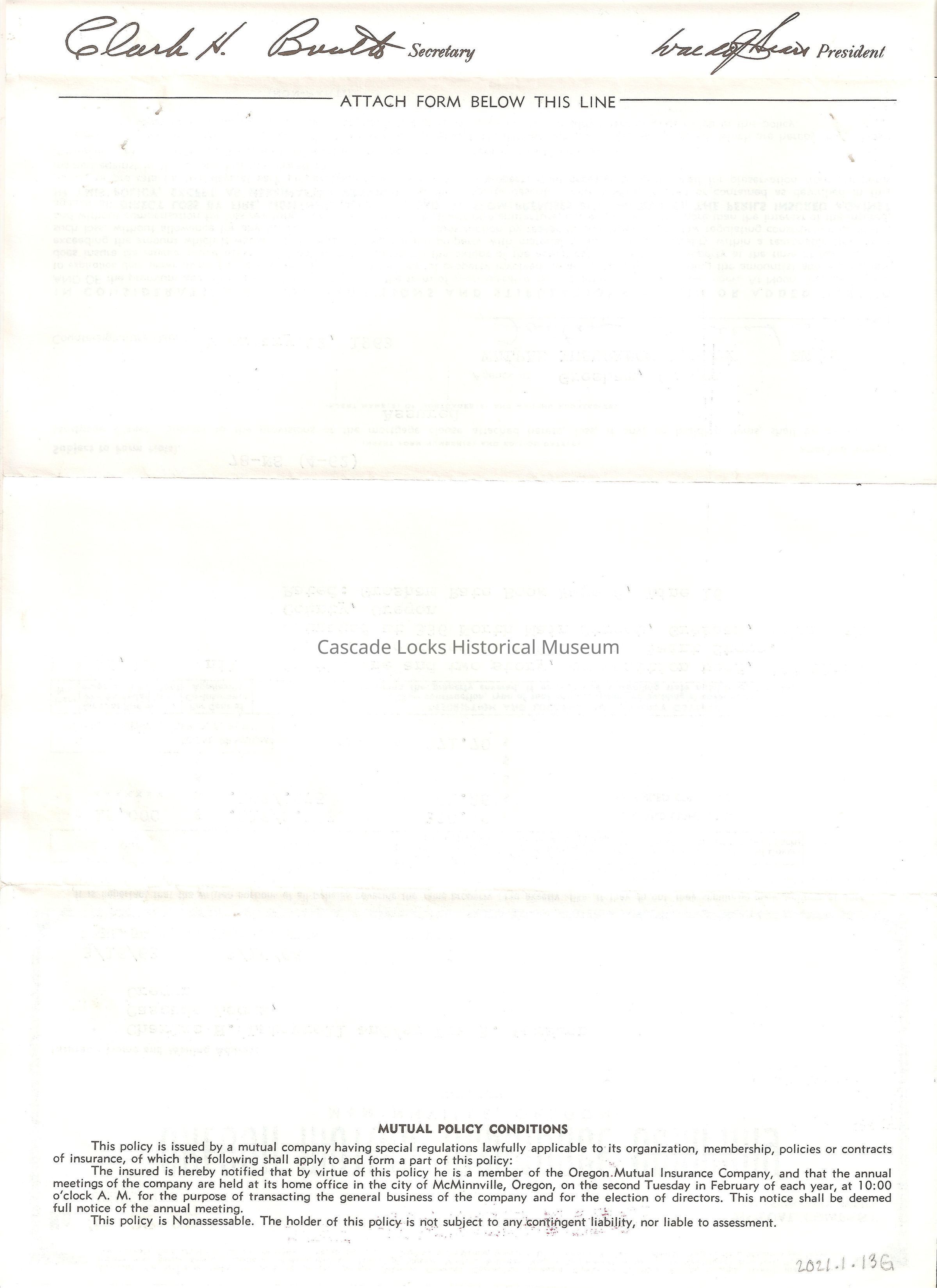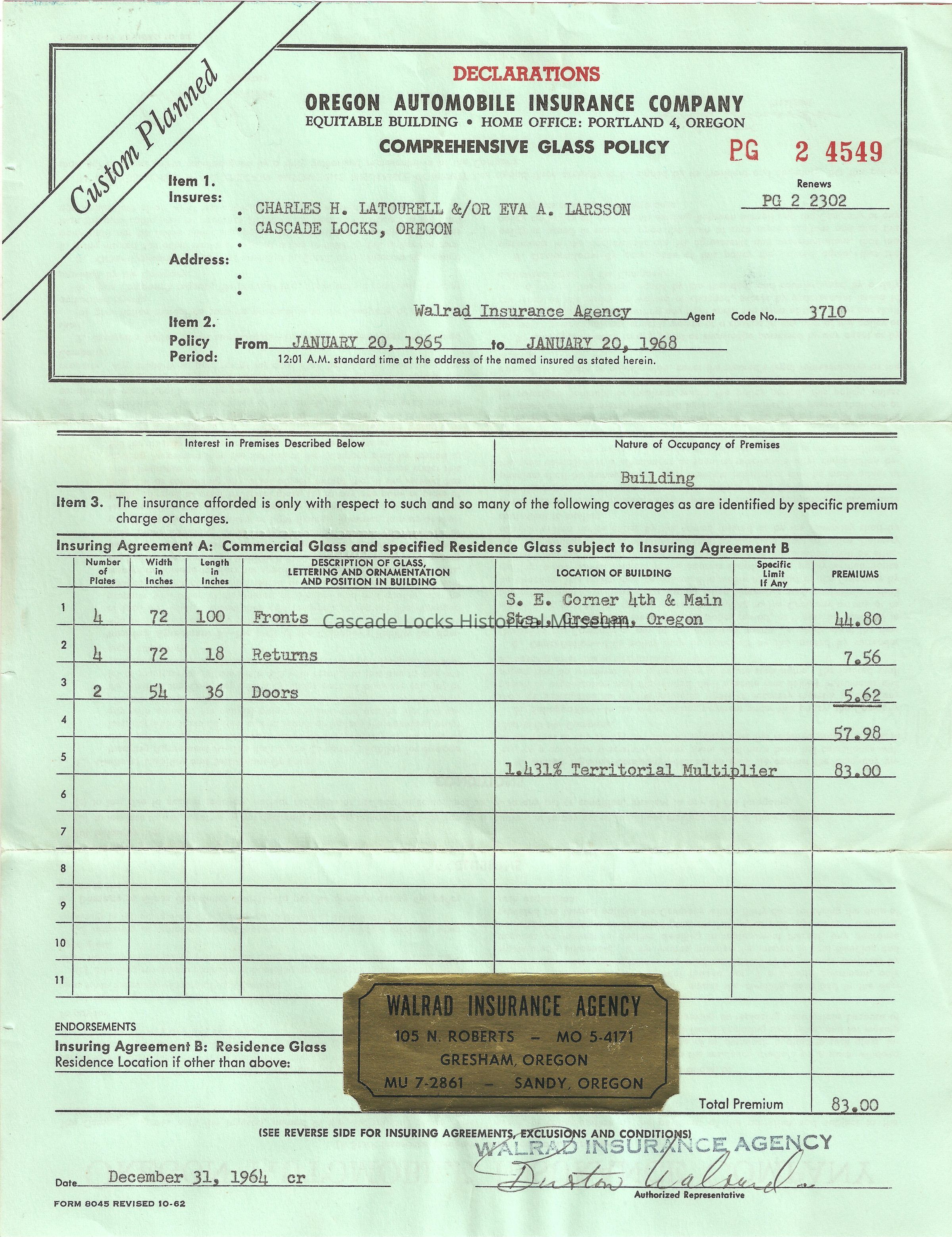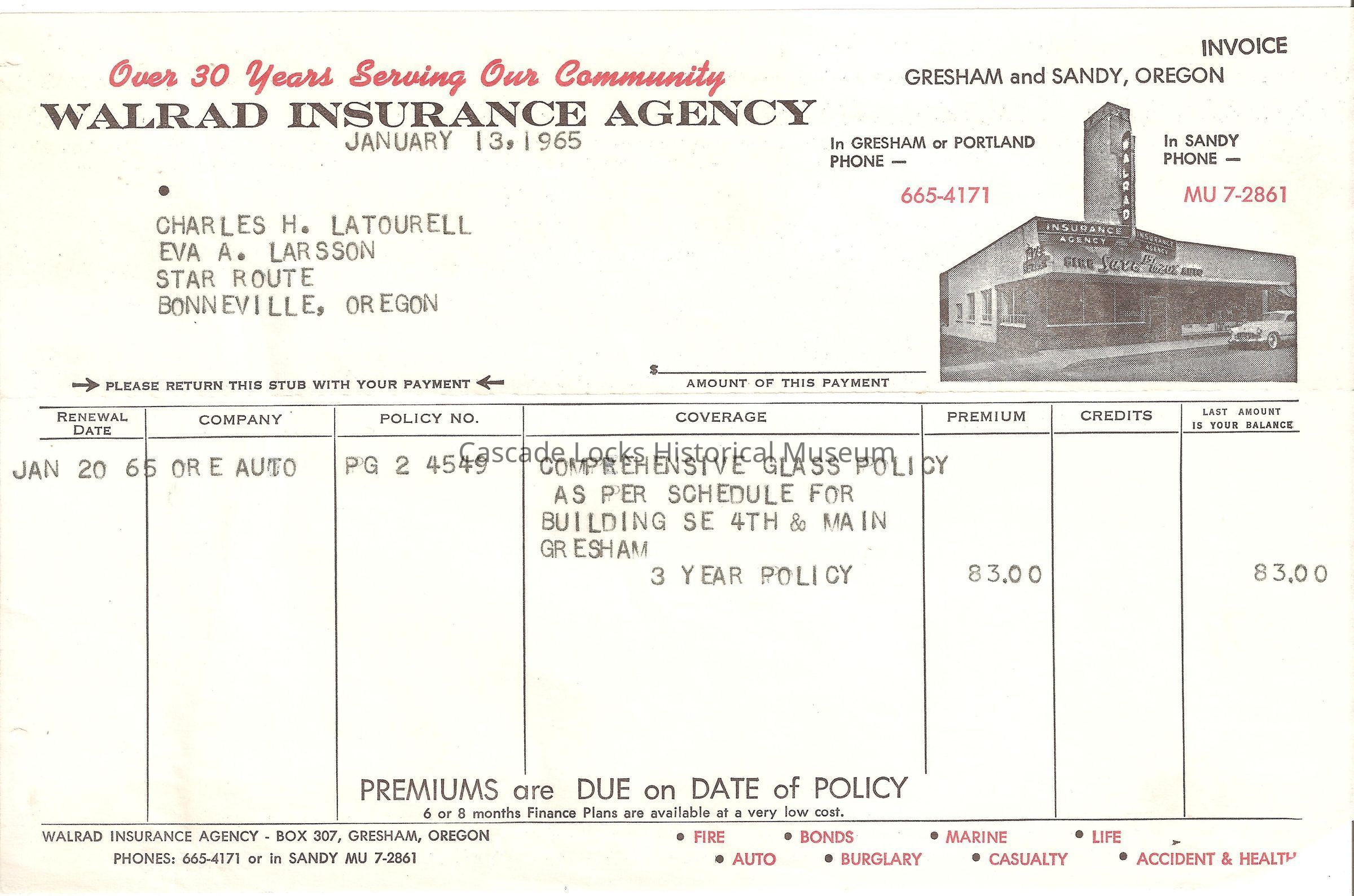 Walrad Insurance Agency. Jan 13, 1965. (To) Charles H. Latourell Eva A. Larson. Star Route, Bonneville, Oregon. Renewal Date Jan 20 65, Company Ore Auto, Policy No. PG 2 4549. Coverage comprehensive Glass Policy as per schedule for building Se 4th & Main Gresham. 3 year policy. Premium $83.00, Credits, Last amount is your balance $83.00.Lexicon
